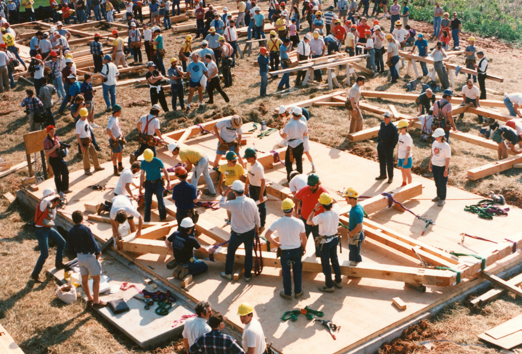 Twenty seven years ago, this month, hundreds of volunteer timber framers from across continent converged on York, Pennsylvania to erect two timber frames for Habitat For Humanity. The frame raising began early on a Thursday morning and four days later two families moved into the completed homes. This event was covered by WHYY of Philadelphia and the BBC. Our two founders, Tony Zaya and Joe McCarthy participated in this project. This week Tony revisited the site. Here’s what the homes look like almost three decades later.