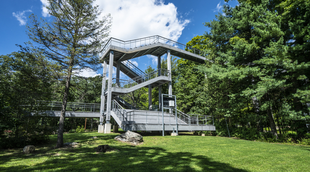 A few months ago Lancaster County Timber Frames contracted with Frankoski Construction Company of East Orange, New Jersey to design, fabricate, and erect a tree canopy walk and tree house for the Kean University School of Environment Studies. The walkway is located in Oak Ridge, New Jersey, atop Mt. Paul, a former Catholic retreat and monastery, and meanders through the woods at tree-top level for almost 1,000 feet.