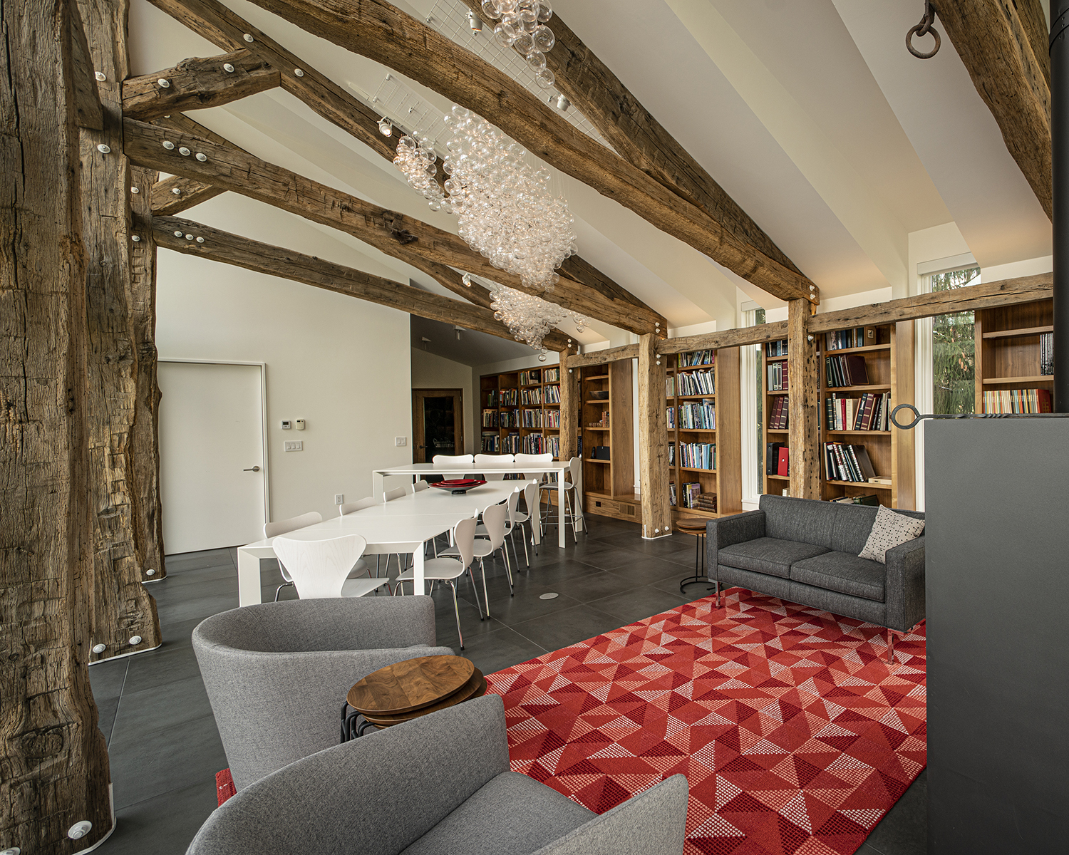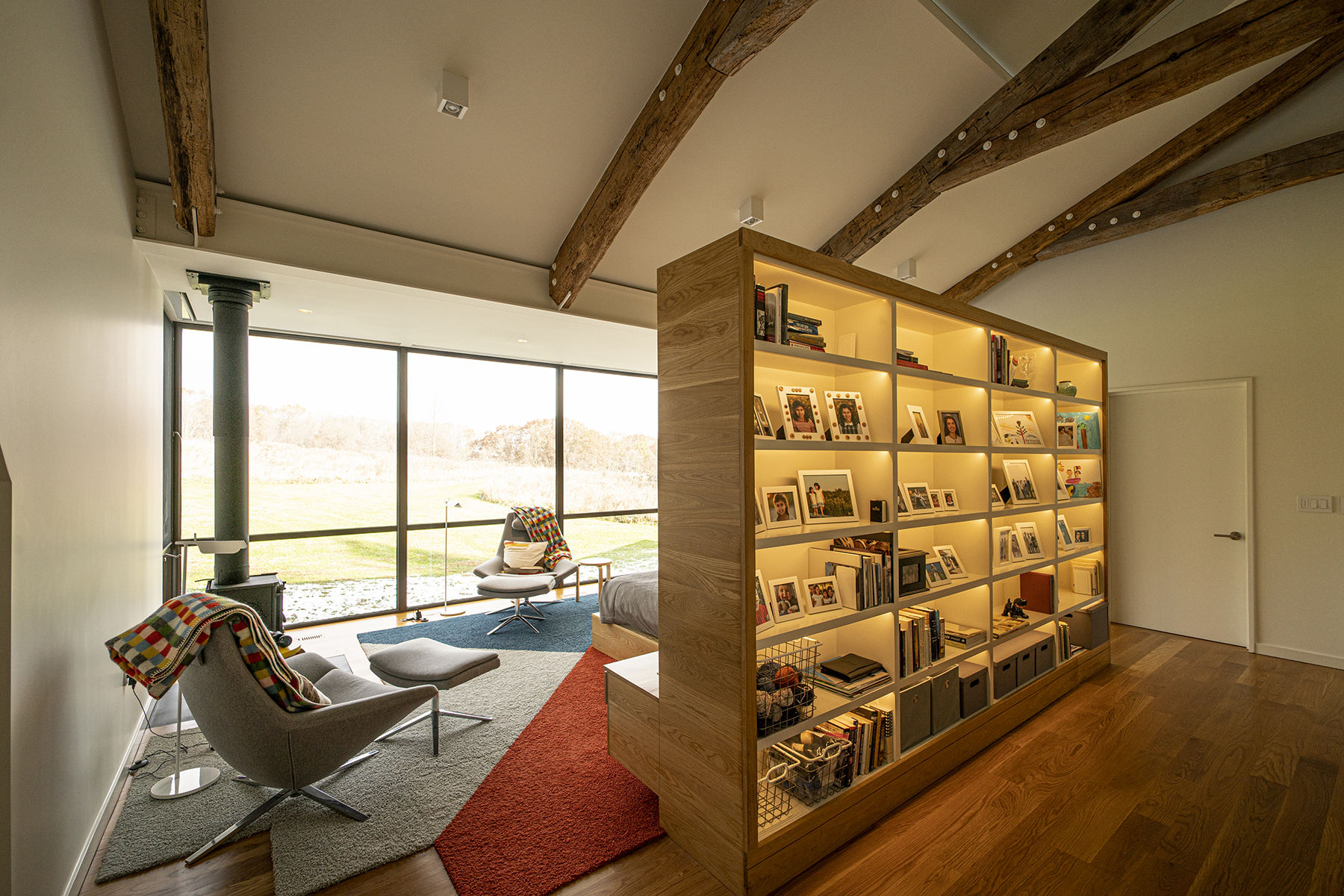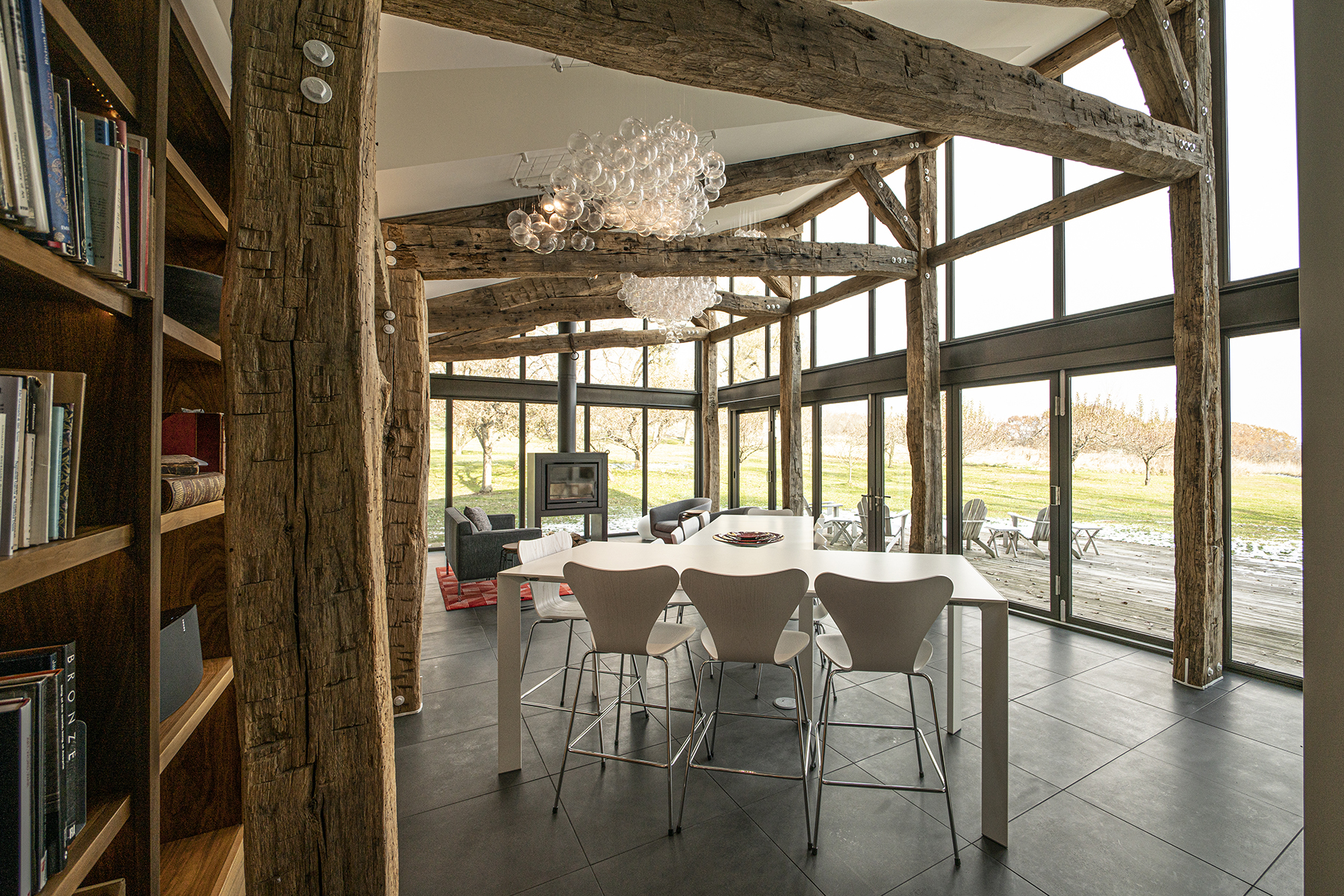 The specification of “white” powder coating for the steel components was surprising given so many designers’ predilection for black. The contrast between the weathered timbers and their visually opposite white hardware emphasizes and celebrates the timber to steel connections. Additionally, positioning the posts inboard of the walls and bookcases is something of a rarity in timber framing; here the effect is both subtle and stunning. While the majority of timber-framed interiors position timber posts against or even embedded in the walls, the inward positioning of the timber posts visually reinforces the structural role of the timber posts, while simultaneously making the space more intimate and embracing.