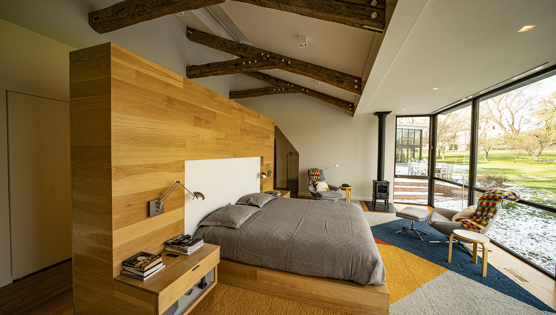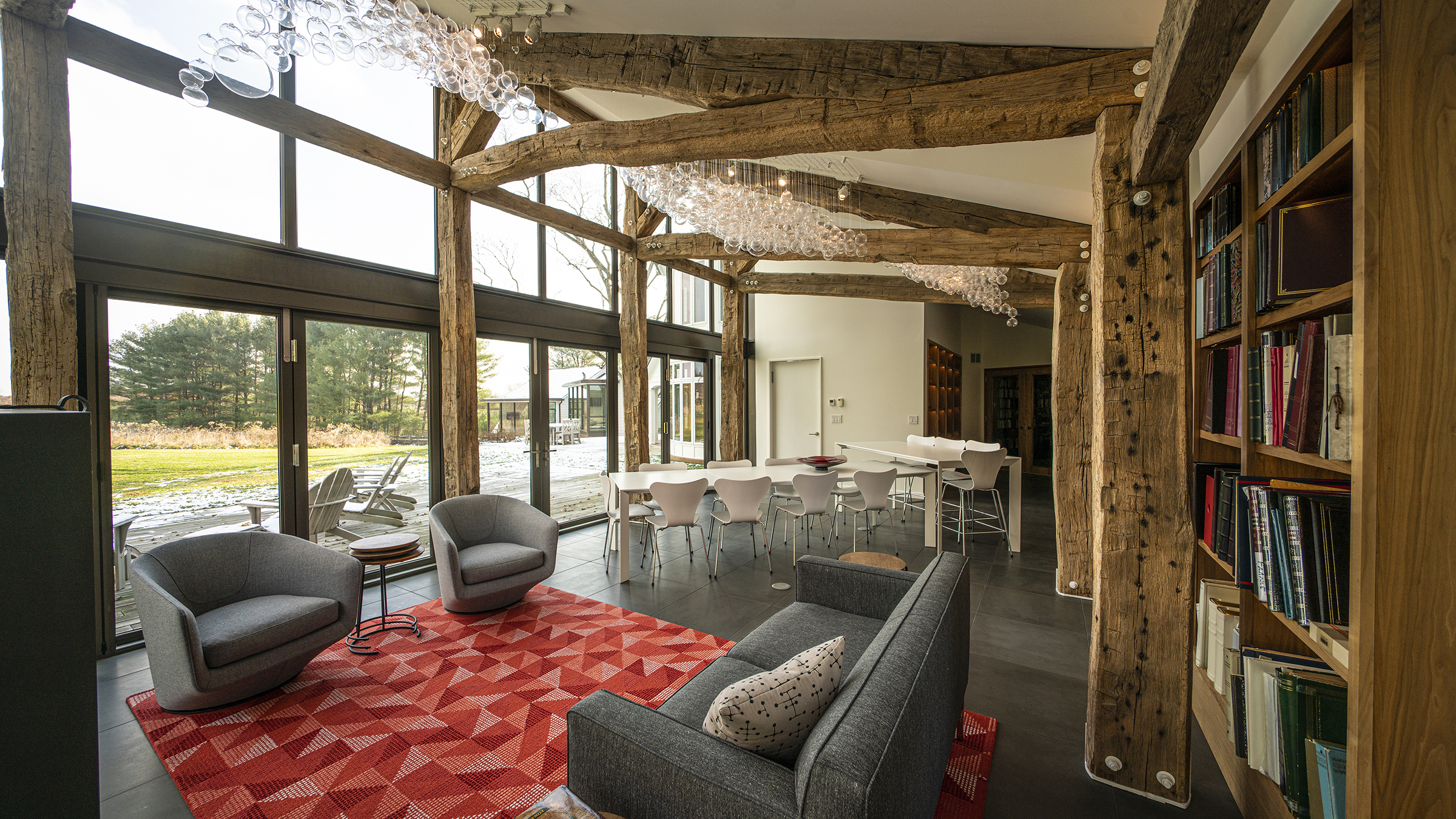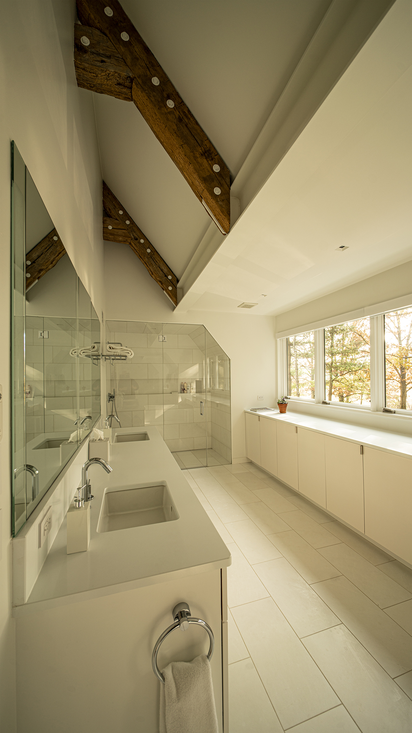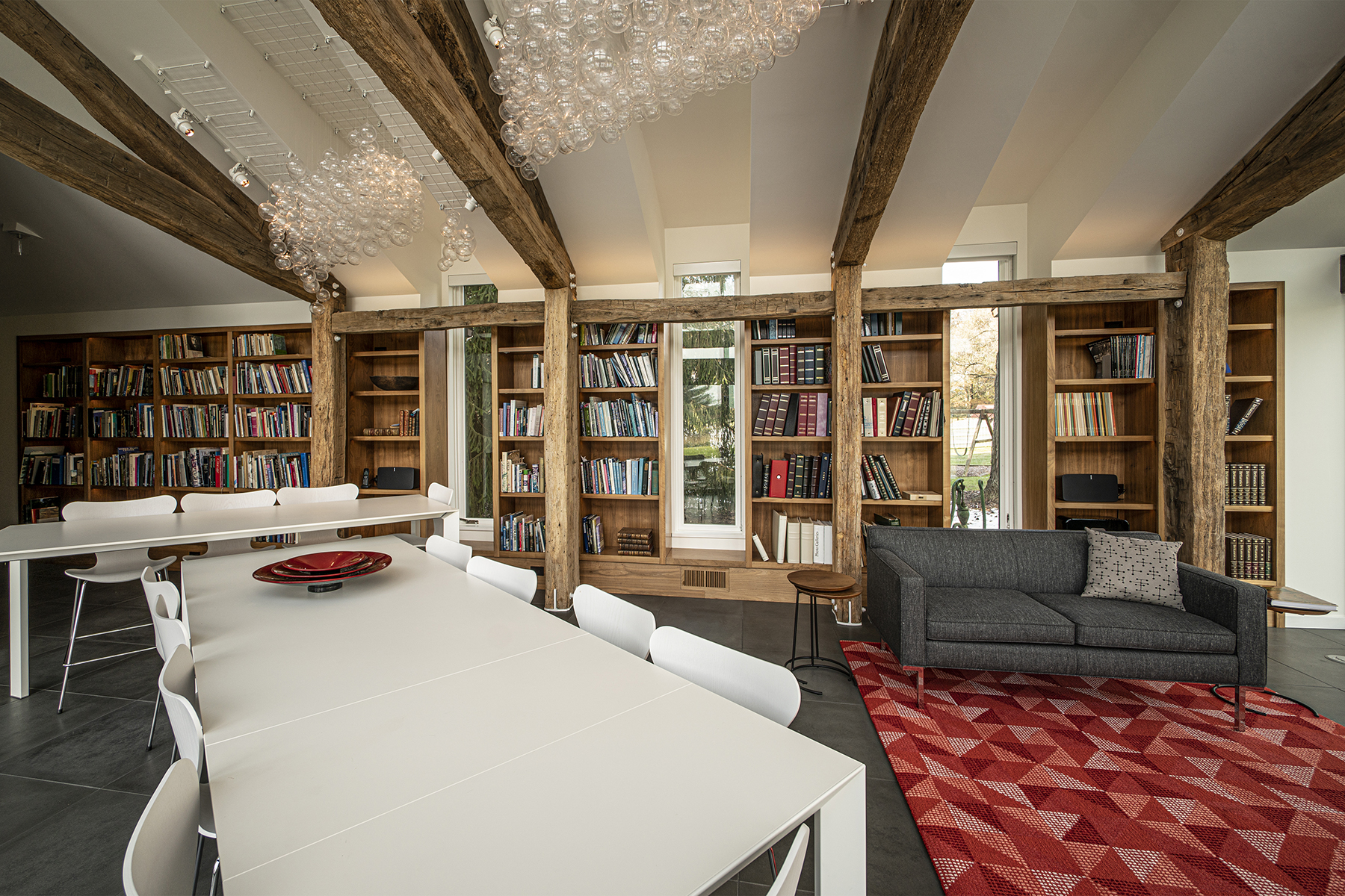 The specification of “white” powder coating for the steel components was surprising given so many designers’ predilection for black. The contrast between the weathered timbers and their visually opposite white hardware emphasizes and celebrates the timber to steel connections. Additionally, positioning the posts inboard of the walls and bookcases is something of a rarity in timber framing; here the effect is both subtle and stunning. While the majority of timber-framed interiors position timber posts against or even embedded in the walls, the inward positioning of the timber posts visually reinforces the structural role of the timber posts, while simultaneously making the space more intimate and embracing.