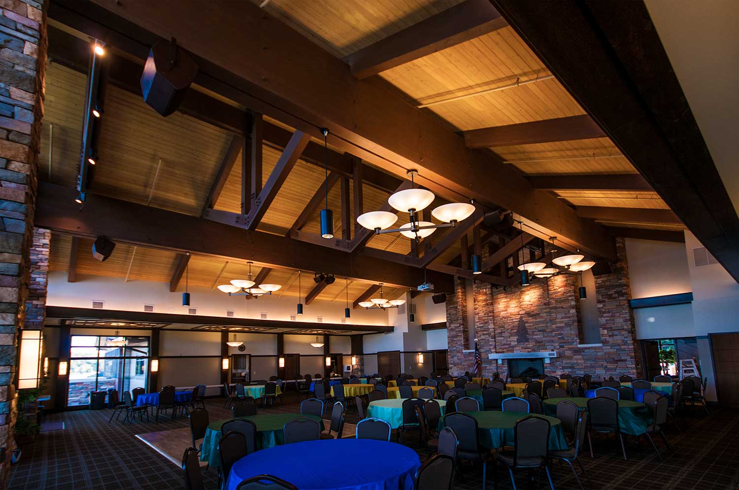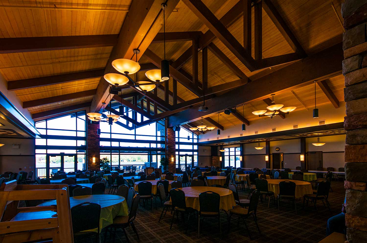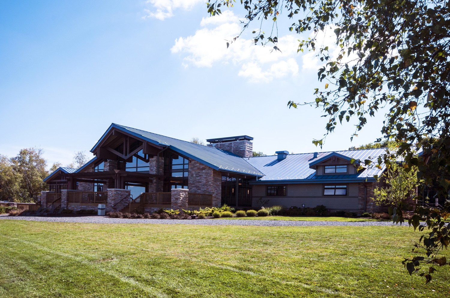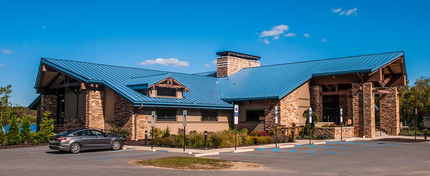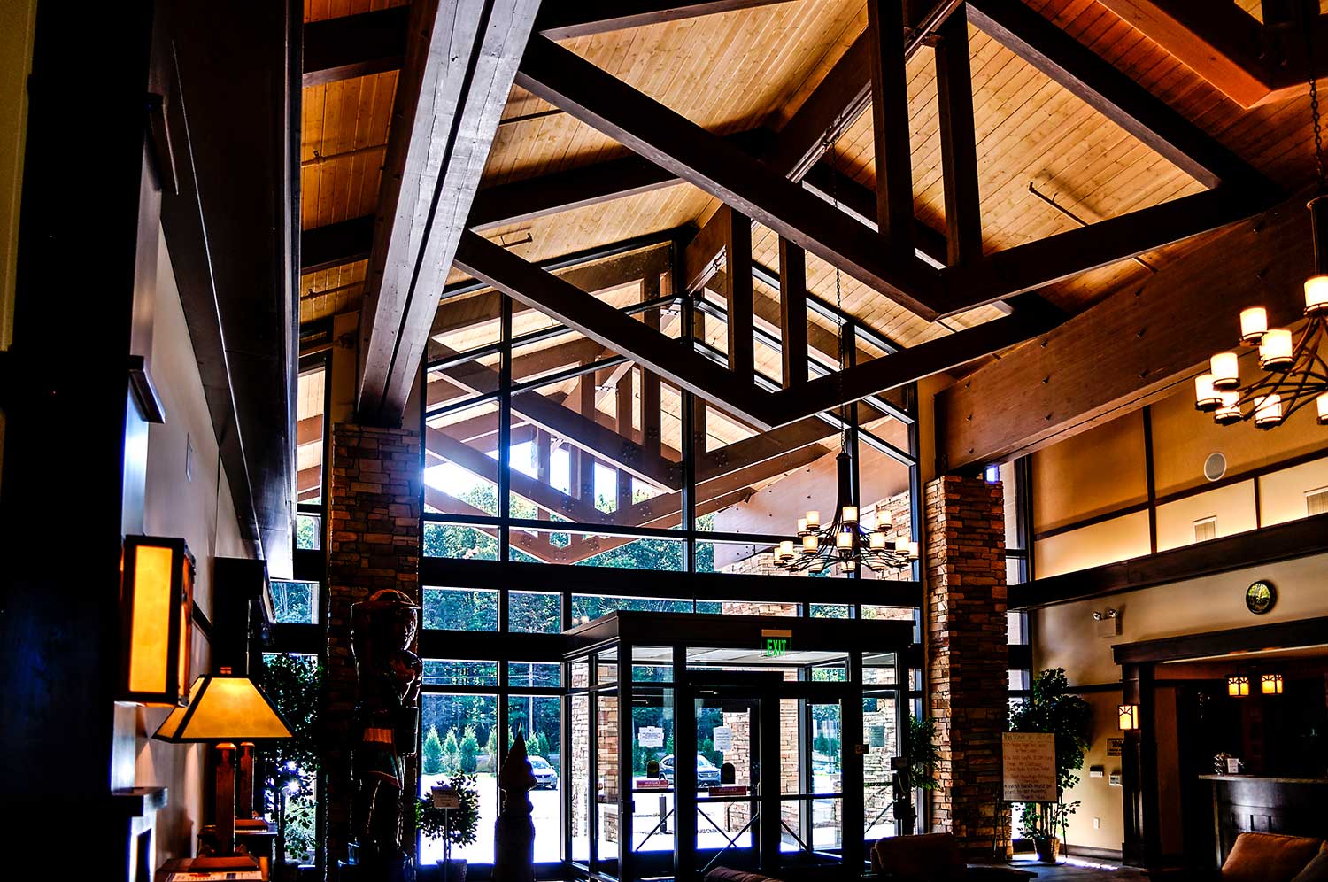 Located in the Pocono Mountains of Pennsylvania, this community lodge in a 3.5 square mile privately-owned gated community set near two lakes (260 acres and 90 acres) and four beaches, was one of LCTF’s first glue-lam projects. The lodge is 17,500 square feet and our work consisted of the central lodge and the two wings. The two main longitudinal supporting girts (purlins) in the central lodge consisted of two members each that measure 8 ¾”thick by 45” high by 63’long. These pieces were too large to get into our shop so we had to have them trucked directly to the site and had to work on, and finish them, when we arrived with the completed load.
