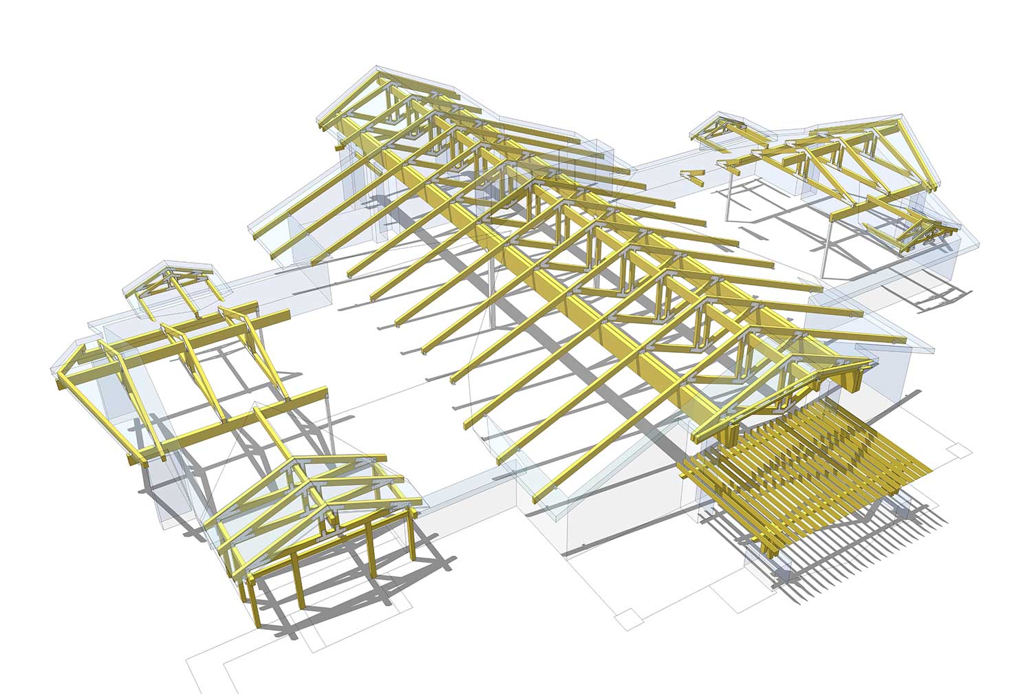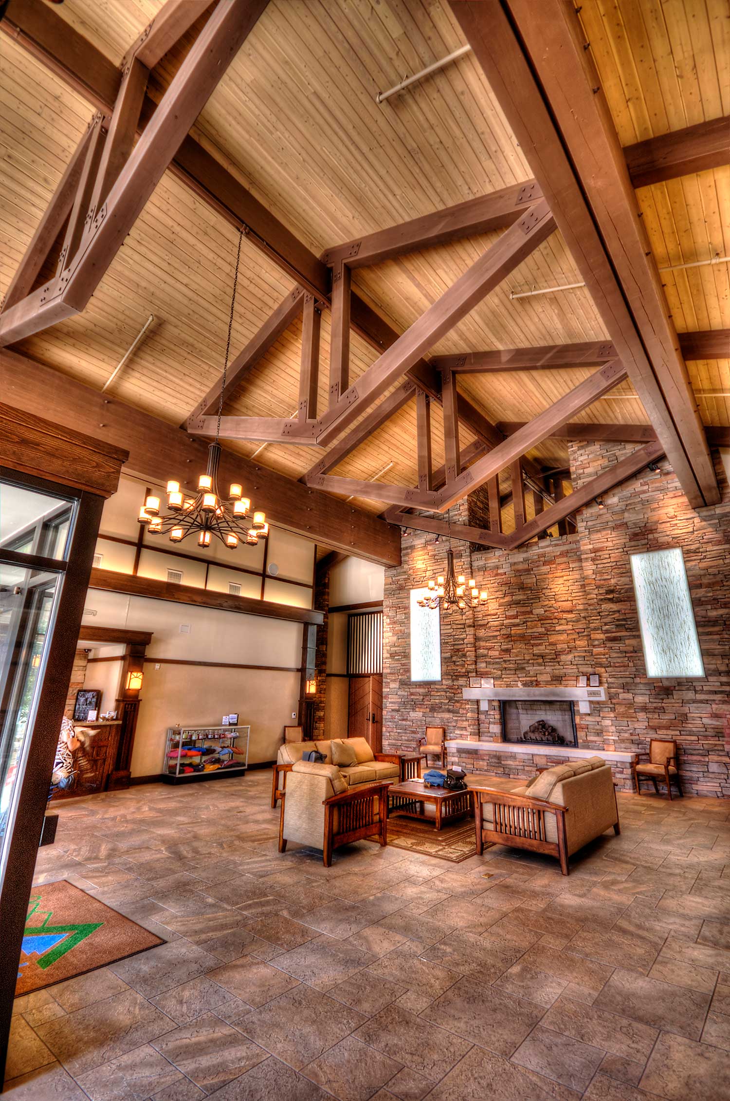 The fourteen trusses that sat on these huge girts had a rather unusual configuration in that they are comprised of two closely set queen posts and the lower chords are angled down at the same pitch that the upper chords angle up. The trusses in the two wings have a horizontal lower chord . The Douglas Fir glue-lam roof system consumed 291 timbers and totaled 55,000 board feet.