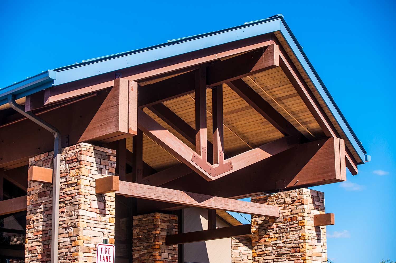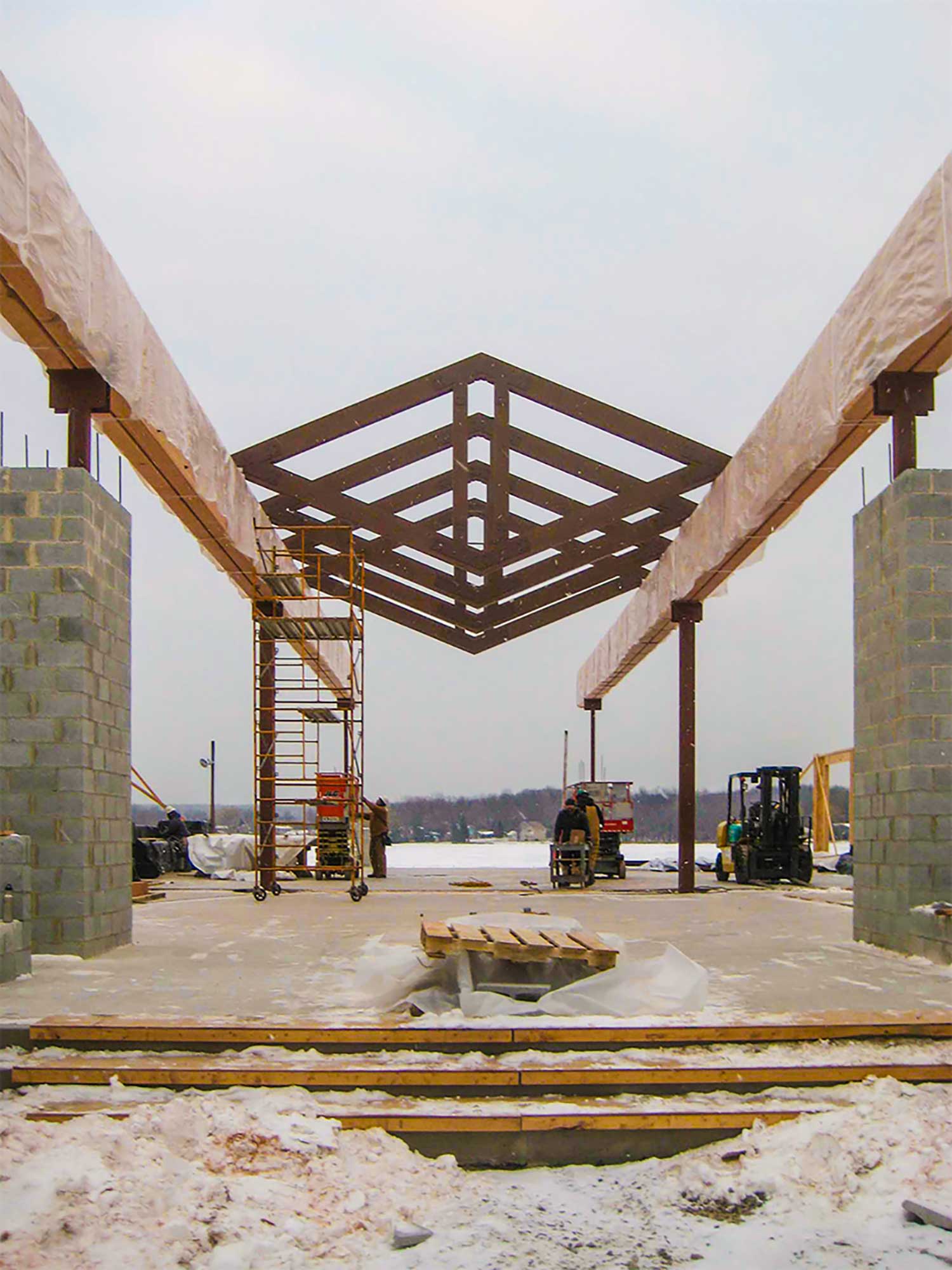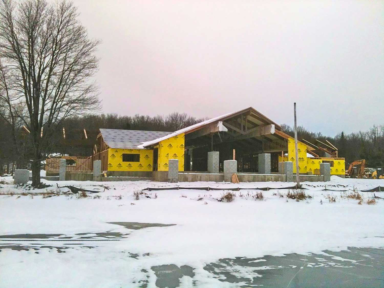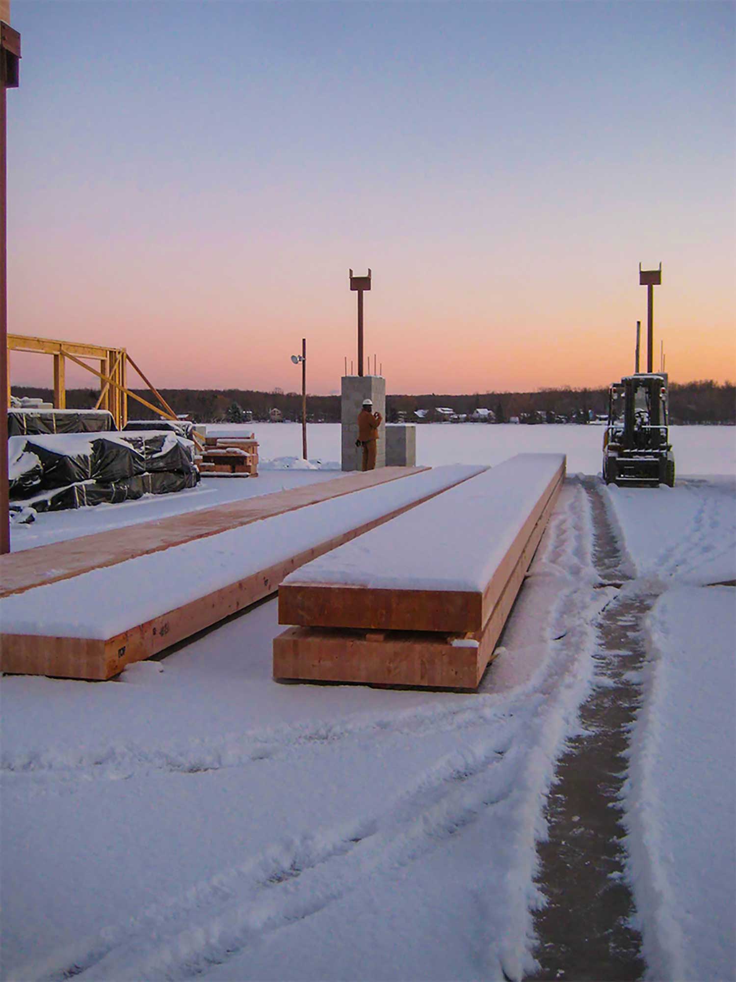 The only problem we encountered on this project was the intense severity of the weather. Snow was a constant while we were on site and the temperature was below 0 degrees each morning. In fact, with the 65’ pieces that we shipped directly to the site, we had to wait to stain them until the building was enclosed and heated.