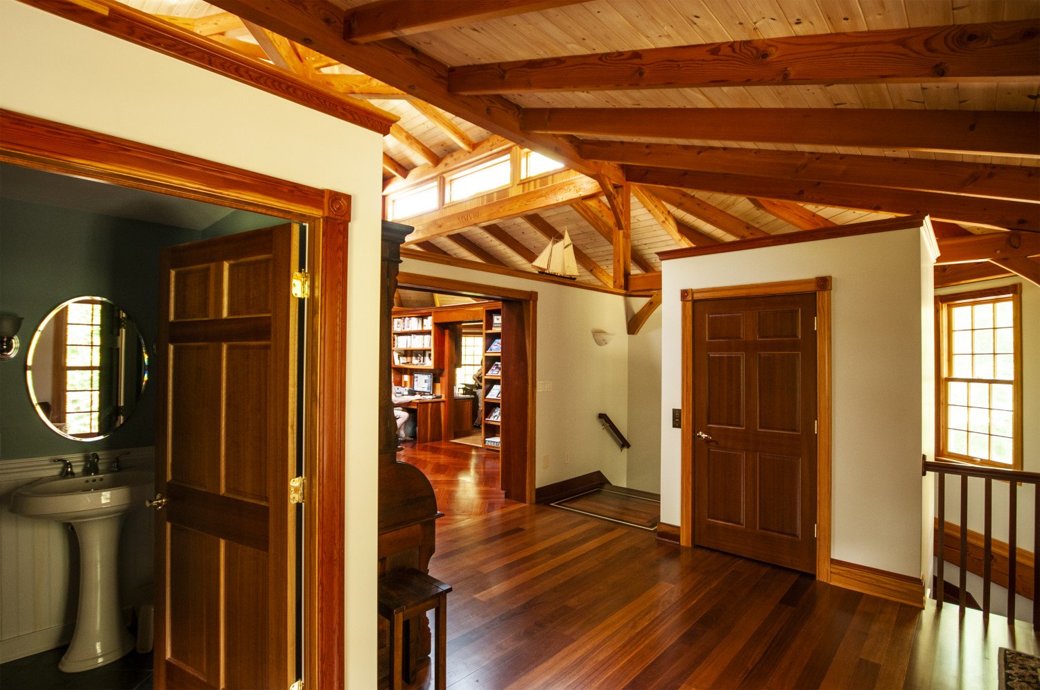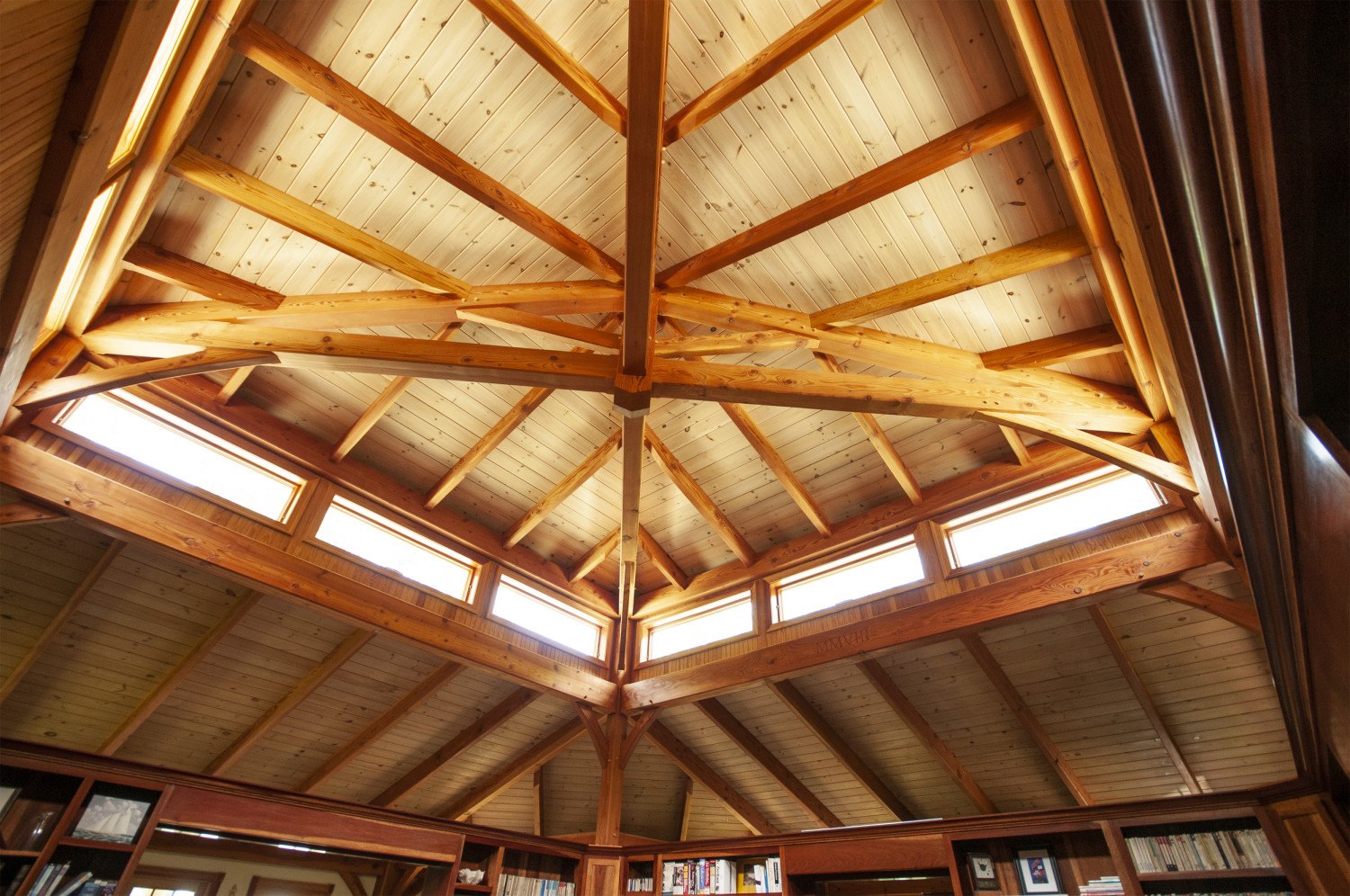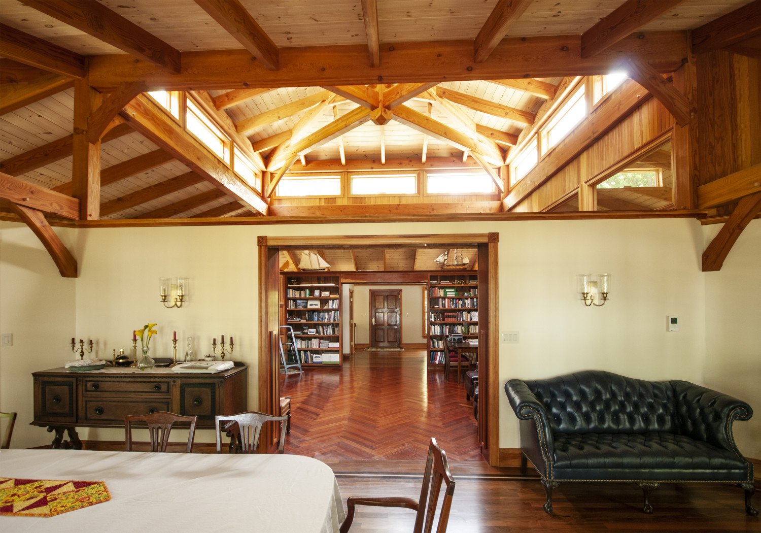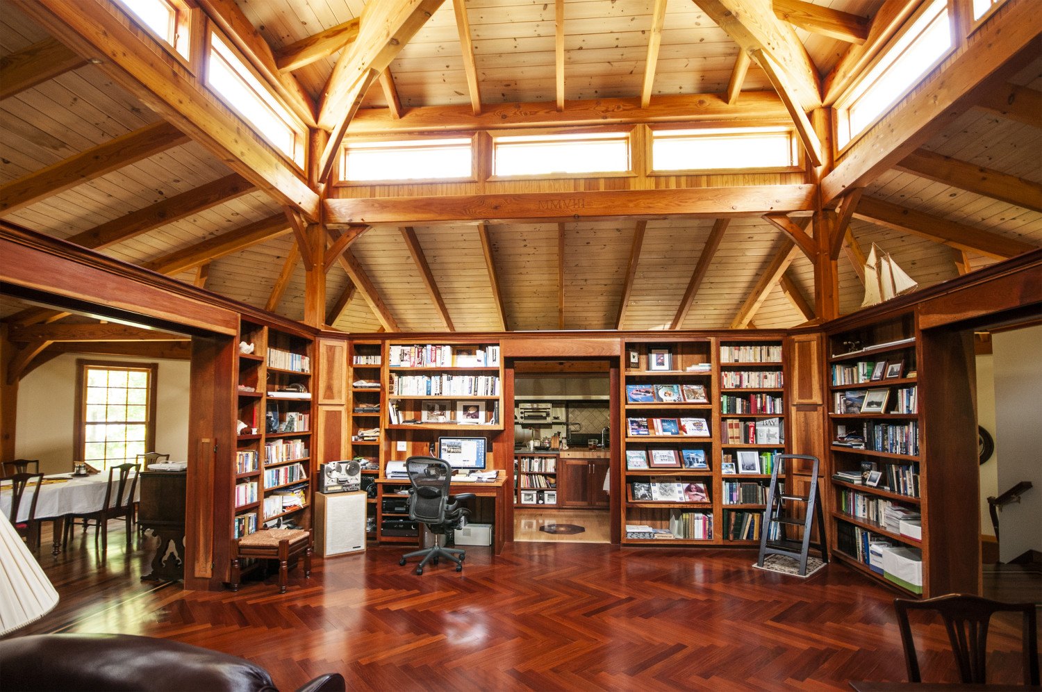 The square core of this octagon is the library. The exotic hardwood flooring is laid in a herringbone pattern.