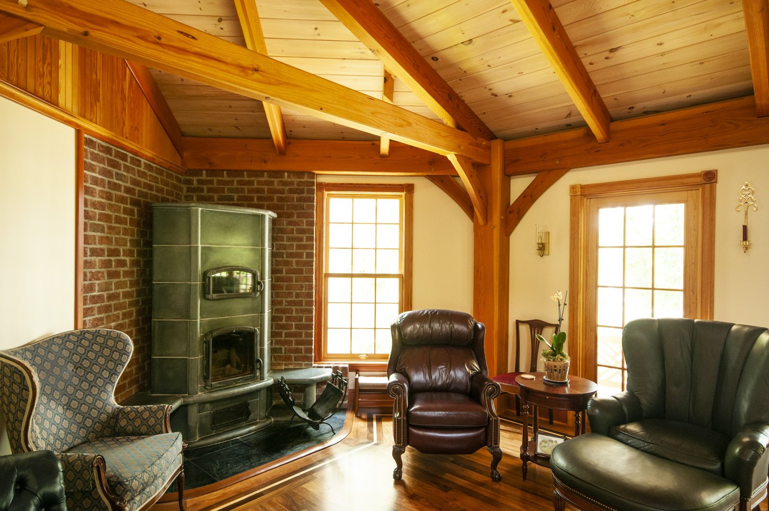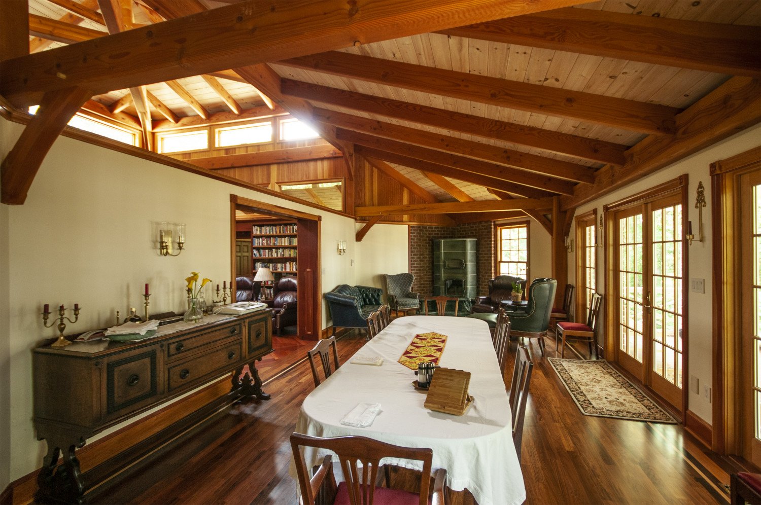 The reading nook at the far end of the dining room features a soapstone wood burner.