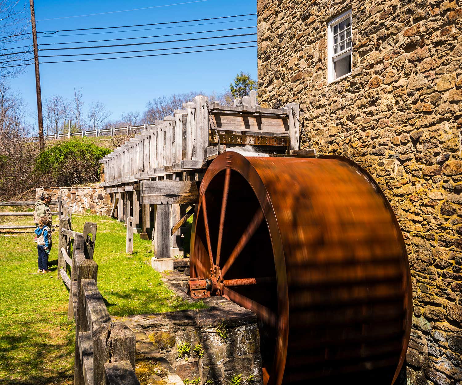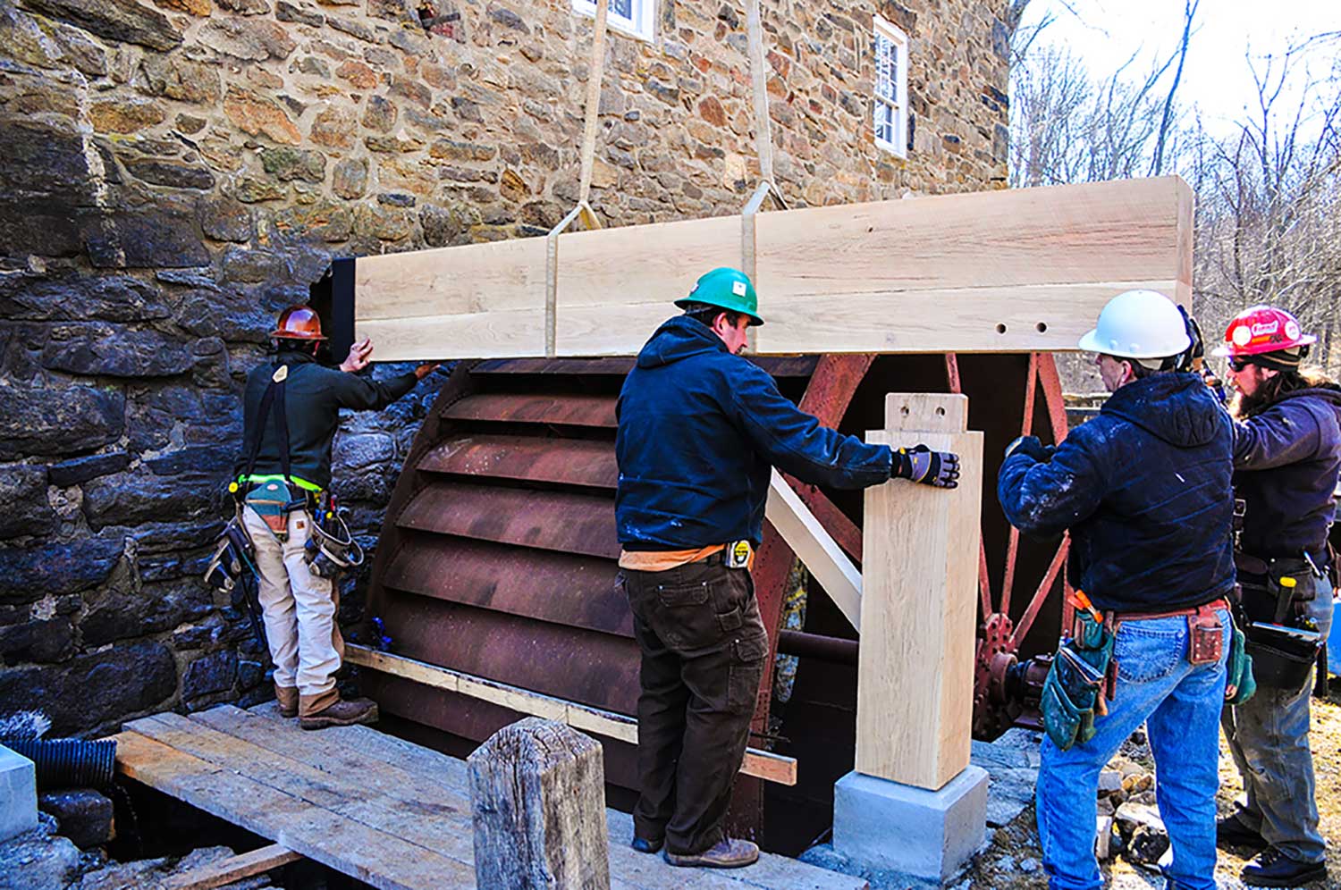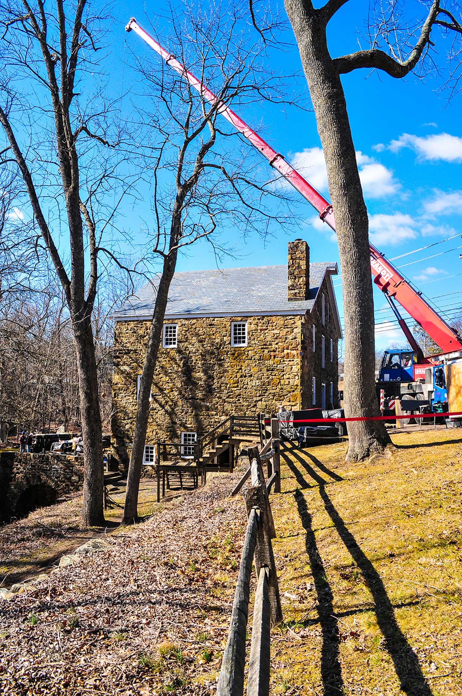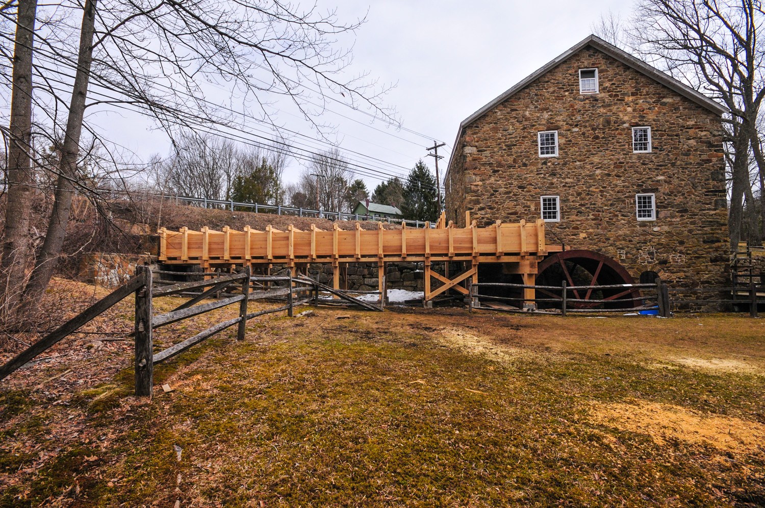 This gristmill is the only fully powered mill in New Jersey that continues to produce flour. A 6 1/2 ton, 16-foot diameter water wheel is moved by the water of the Black River. We were in the midst of rebuilding the Fosterfields Living Farm historical barn a few miles from the gristmill when the Morris County Parks Commission asked that we rebuild the flume which carried the water from the river to the wheel. All structural members are #1 white oak, while the flume lining boards are #1 red cypress.