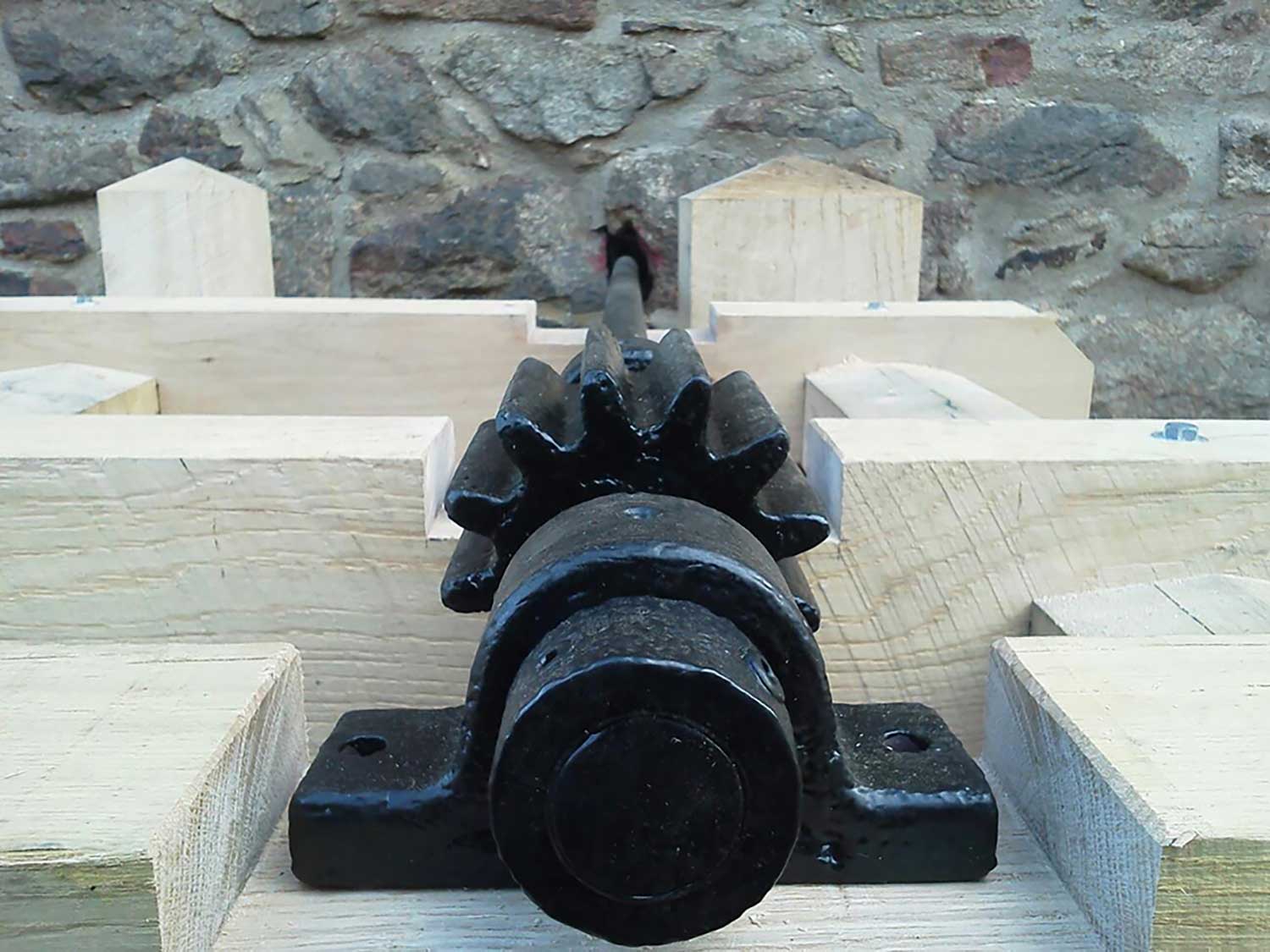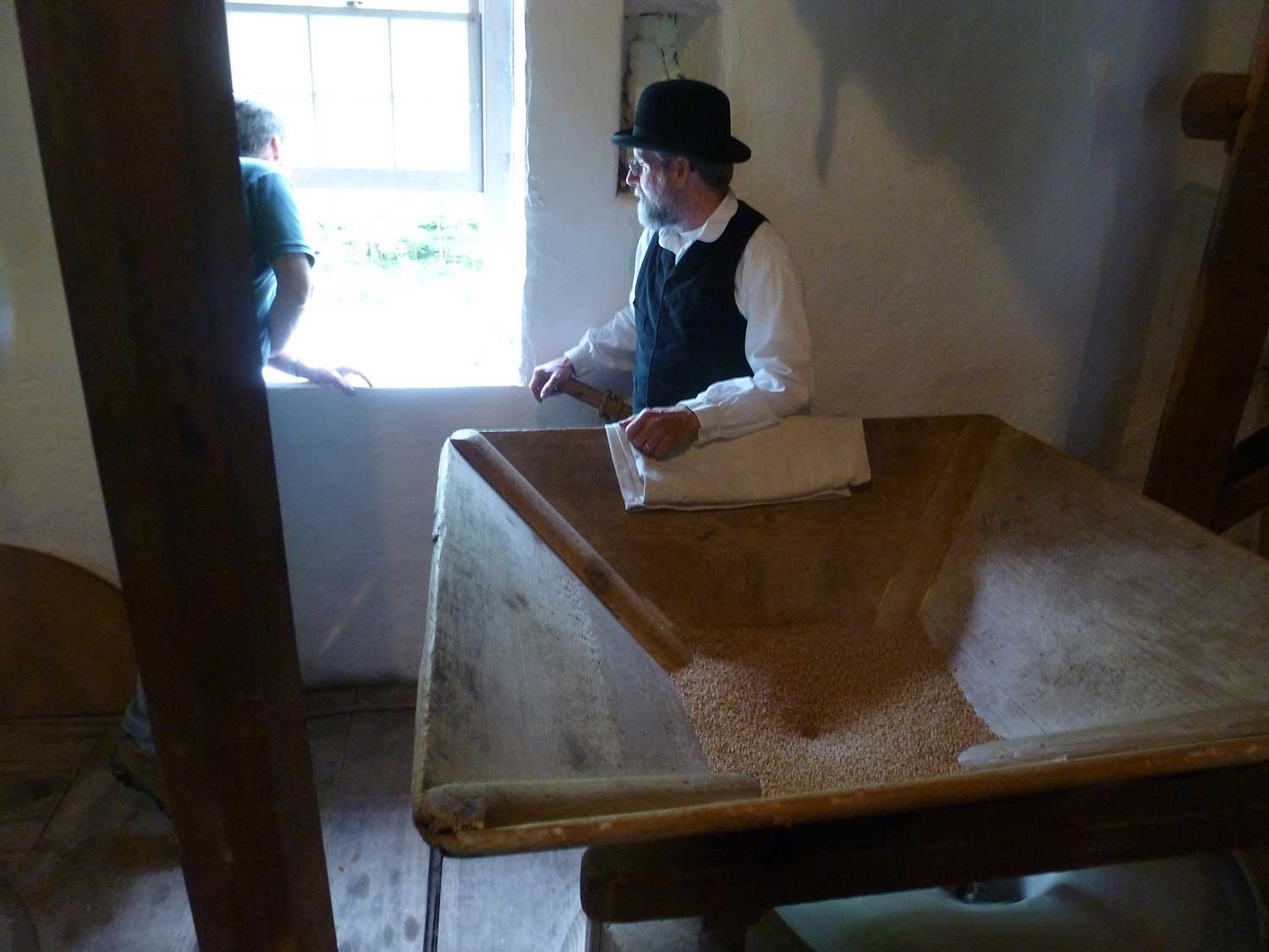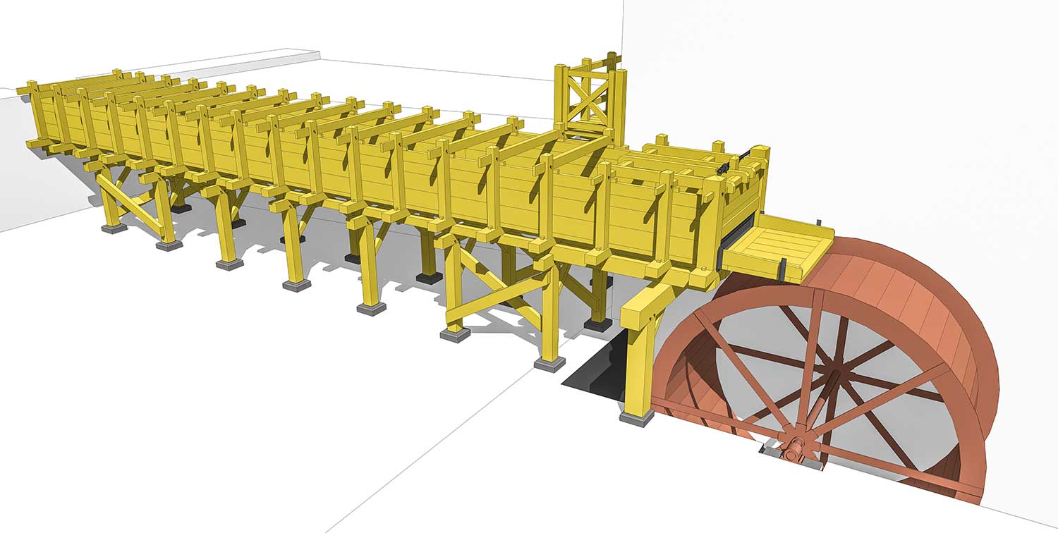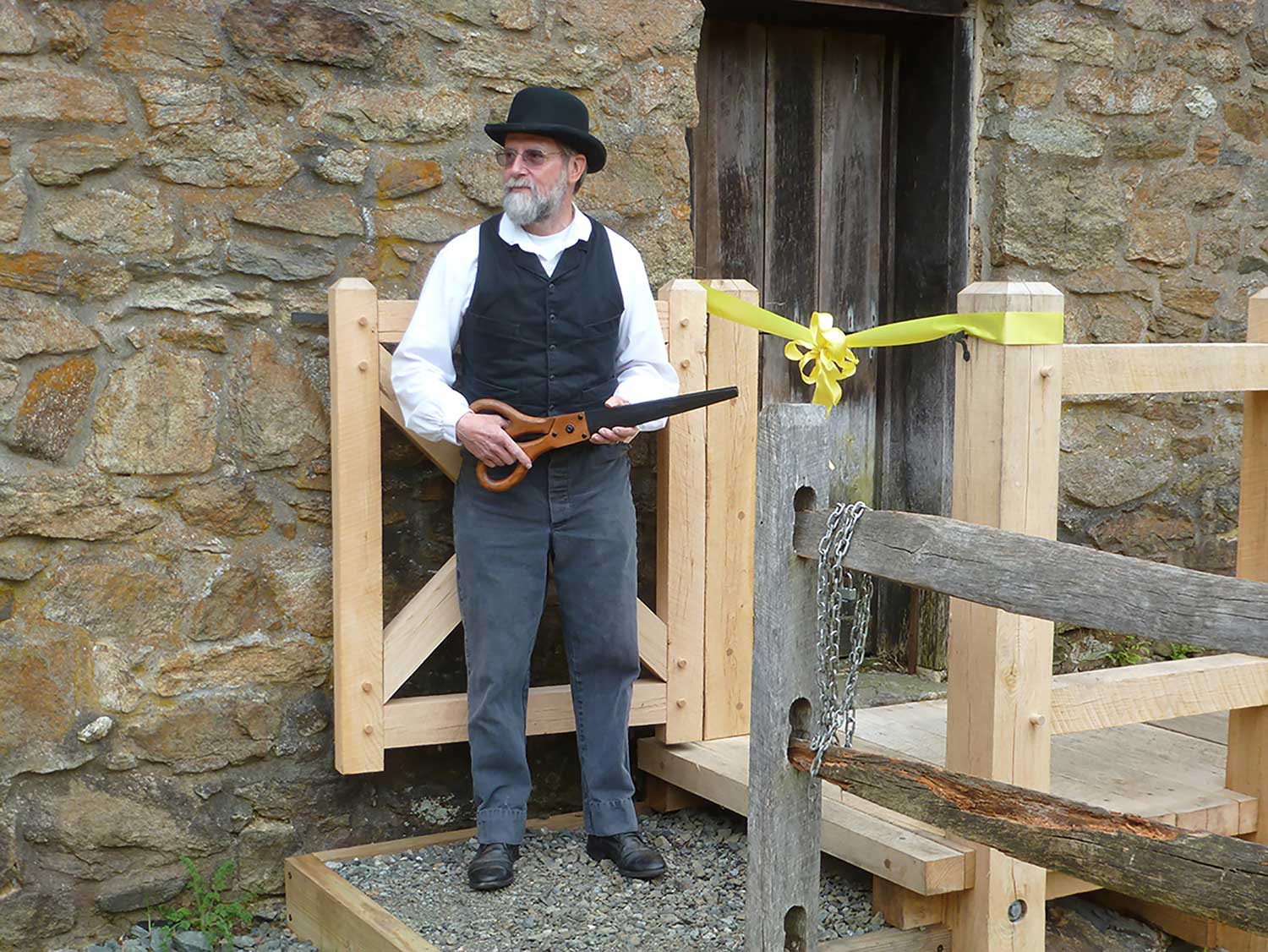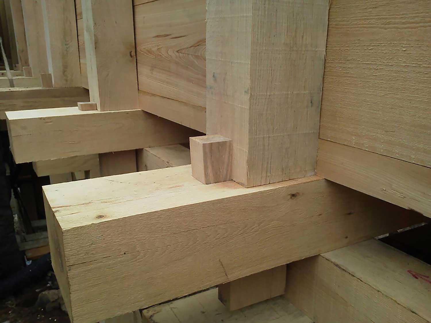 This gristmill is the only fully powered mill in New Jersey that continues to produce flour. A 6 1/2 ton, 16-foot diameter water wheel is moved by the water of the Black River. We were in the midst of rebuilding the Fosterfields Living Farm historical barn a few miles from the gristmill when the Morris County Parks Commission asked that we rebuild the flume which carried the water from the river to the wheel. All structural members are #1 white oak, while the flume lining boards are #1 red cypress.