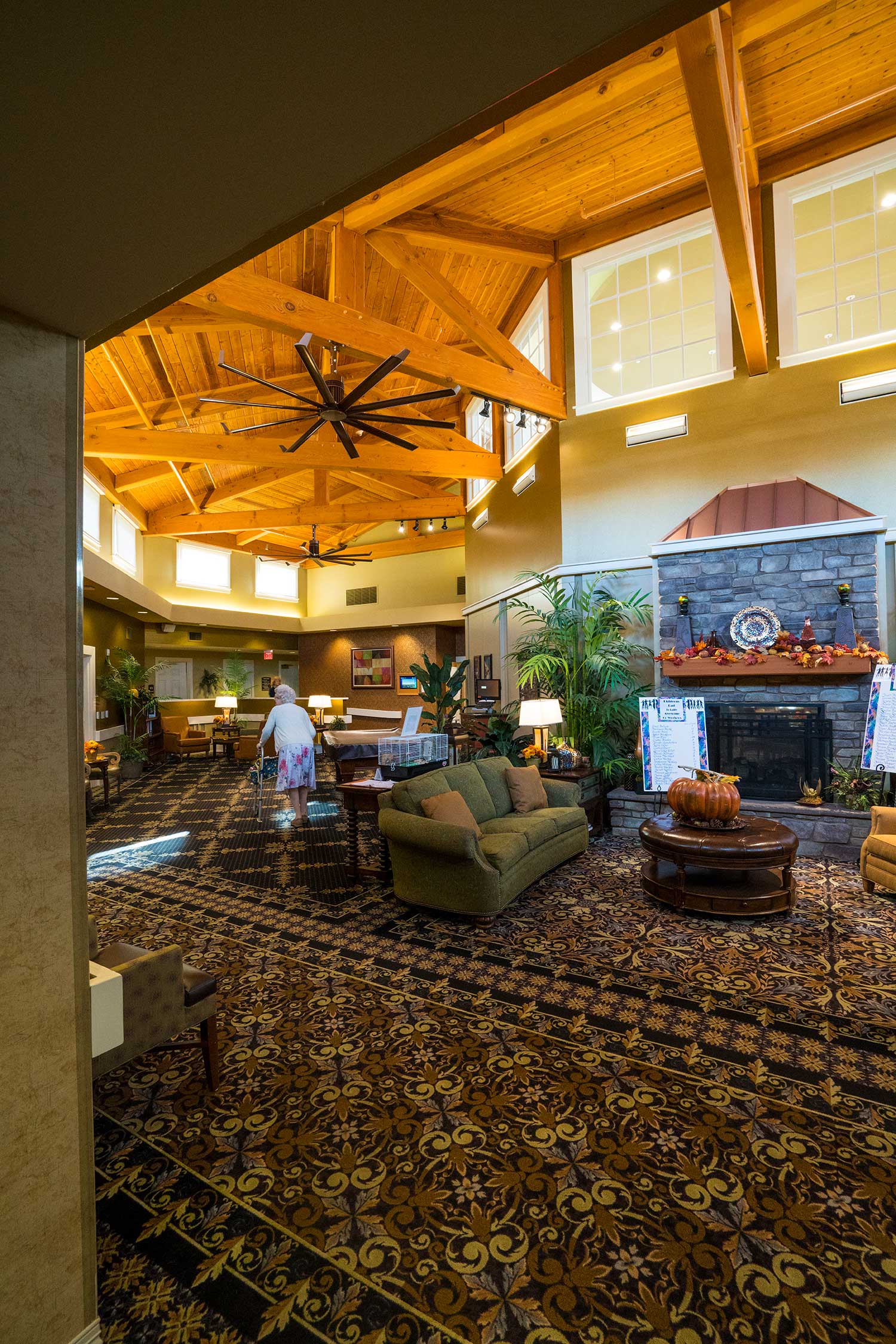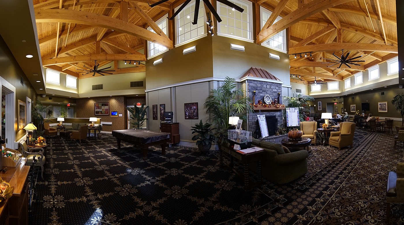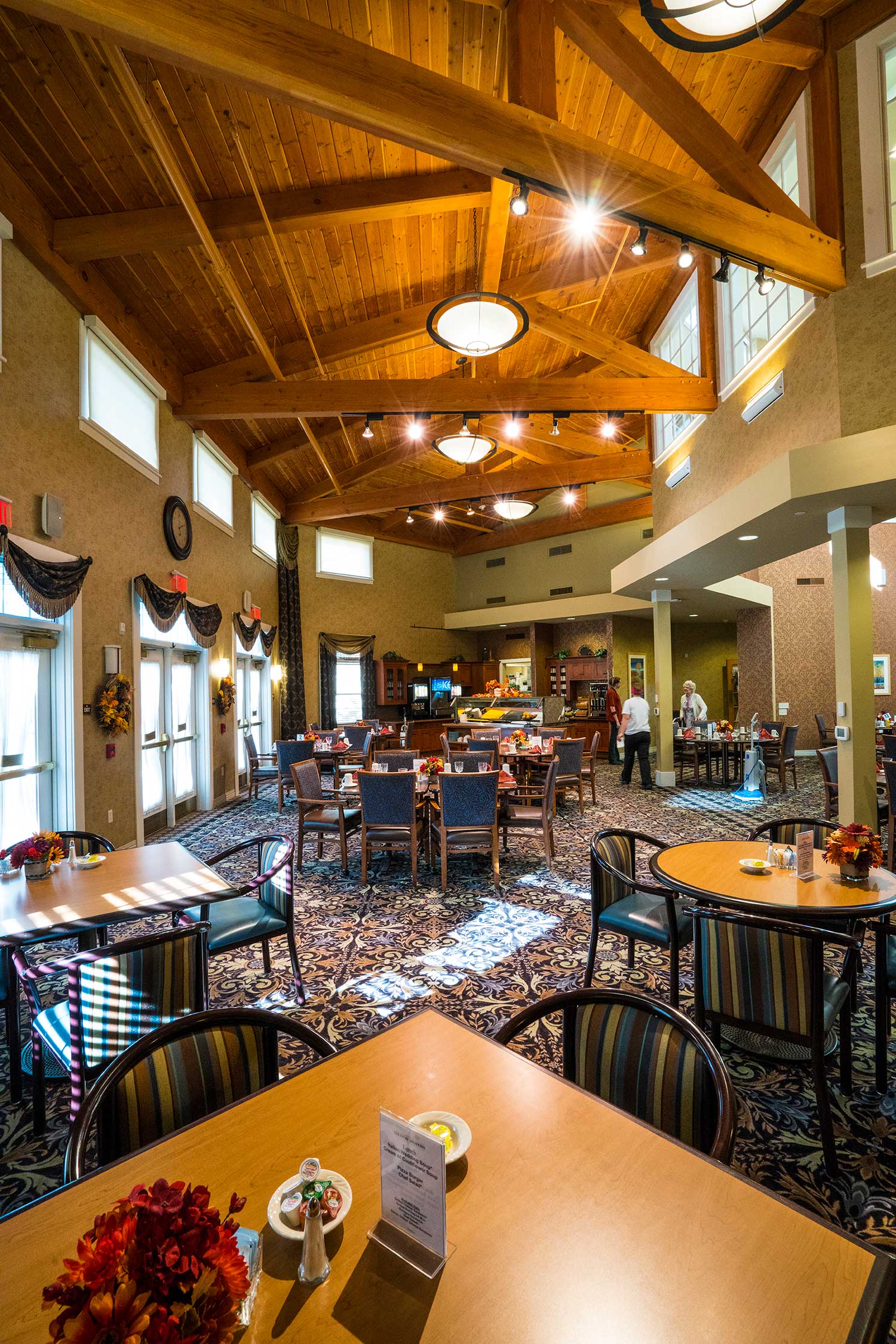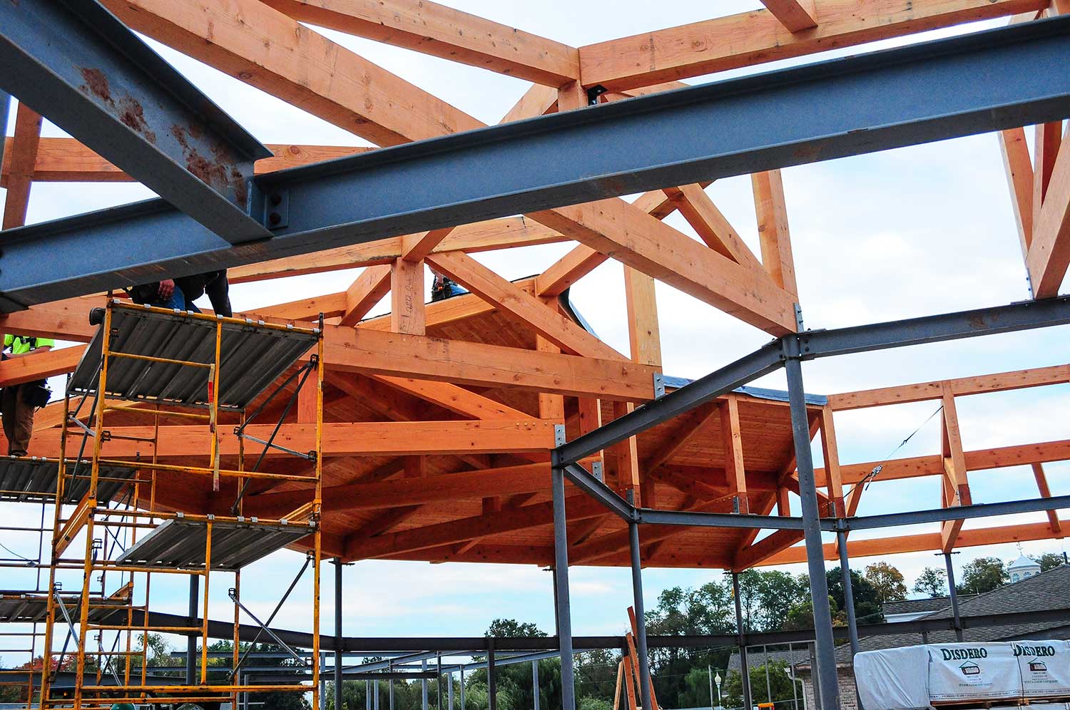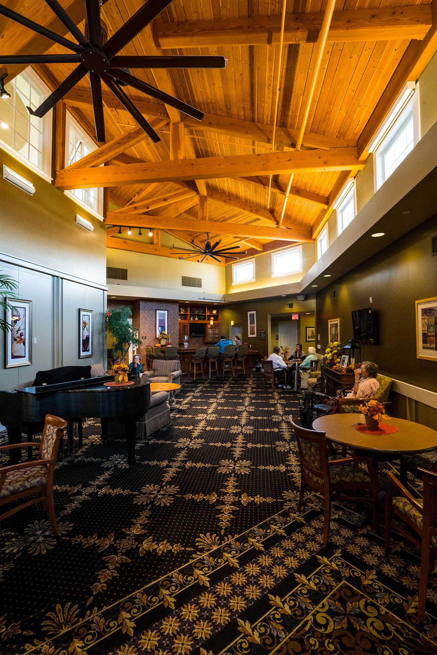One of the more intriguing design challenges we deal with from time to time is the octagonal timber frame. This one – a dining and lounge facility in a high end retirement community – was one of two octagonal timber frames we completed in 2011. The interior space is divided into two octagons – an inner one and an outer ring. The building filled in the space between two existing residential wings.