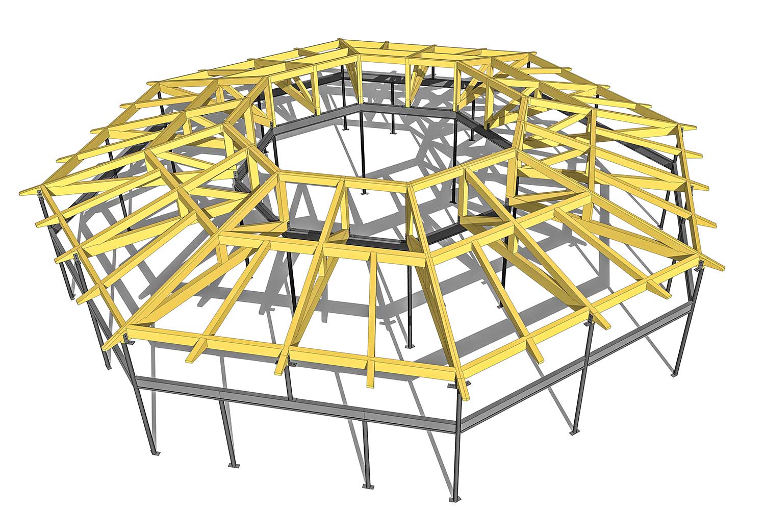 The sixteen Douglas fir trusses are simple common trusses with vertical and diagonal struts. They’re tied together with top plates, eave plates, and purlins, over which a structural deck of 3 inch thick Douglas fir Lock-Deck (tongue and groove boards) is installed.