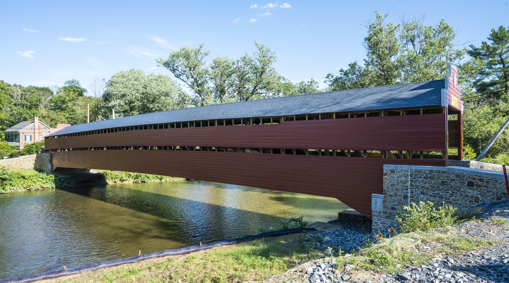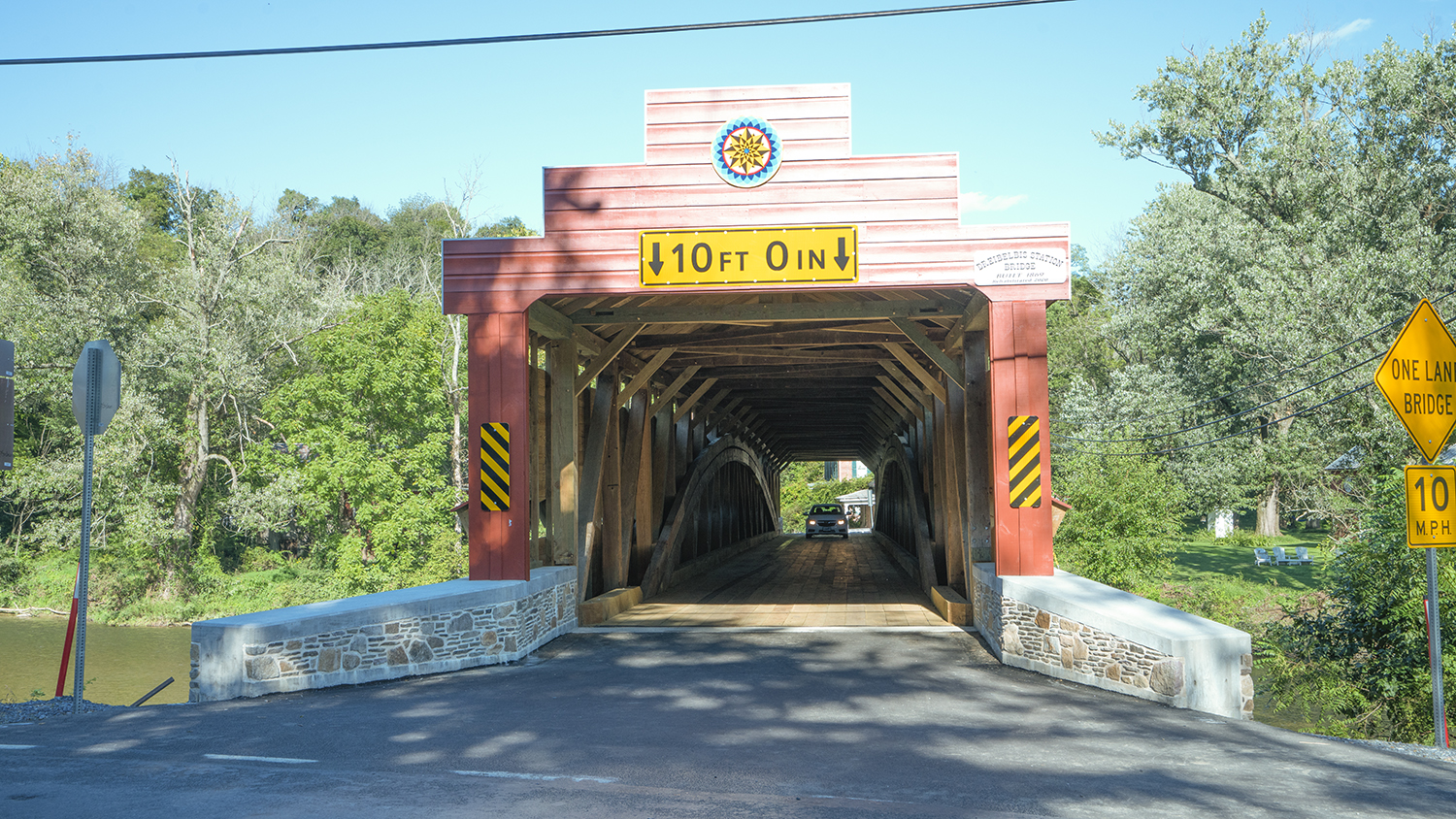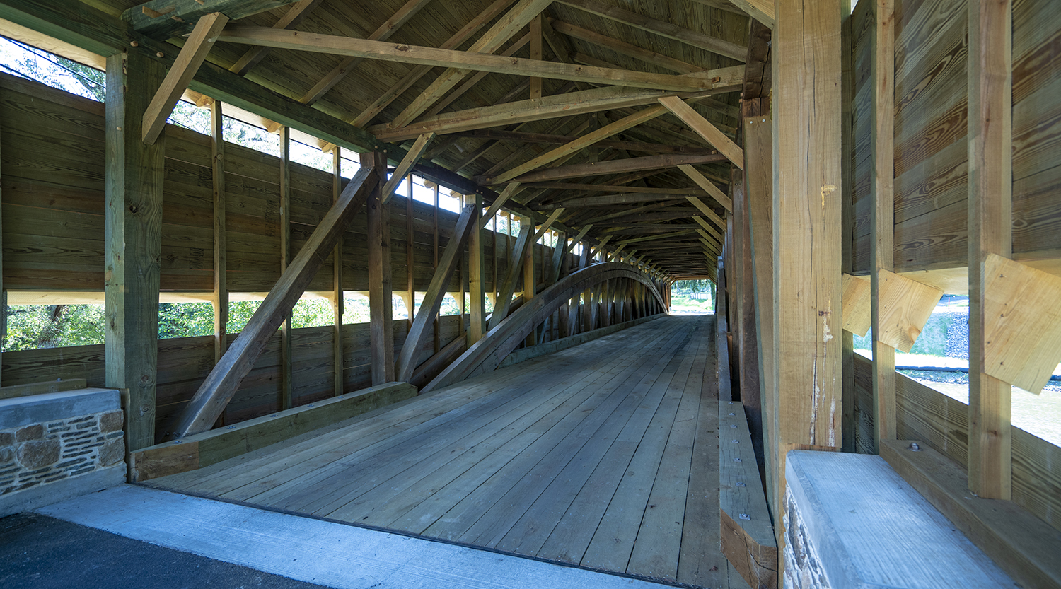 The bridge walls with their Burr arch components were fully assembled at our shop, then disassembled again and trucked to the job-site, where they were again assembled and lifted into position on the new abutments and steel roadway substructure. Television crews and local newspapers were on hand to document the process of the original disassembly, and, of course, the final reassembly on site. A small ceremony and ribbon cutting, with a covered bridge historian and local and state dignitaries, was conducted on August 21st, 2020, more than a year after the start of bridge rehab work. The Dreibelbis Bridge project marks Lancaster County Timber Frames’ 10th covered bridge rehab project.