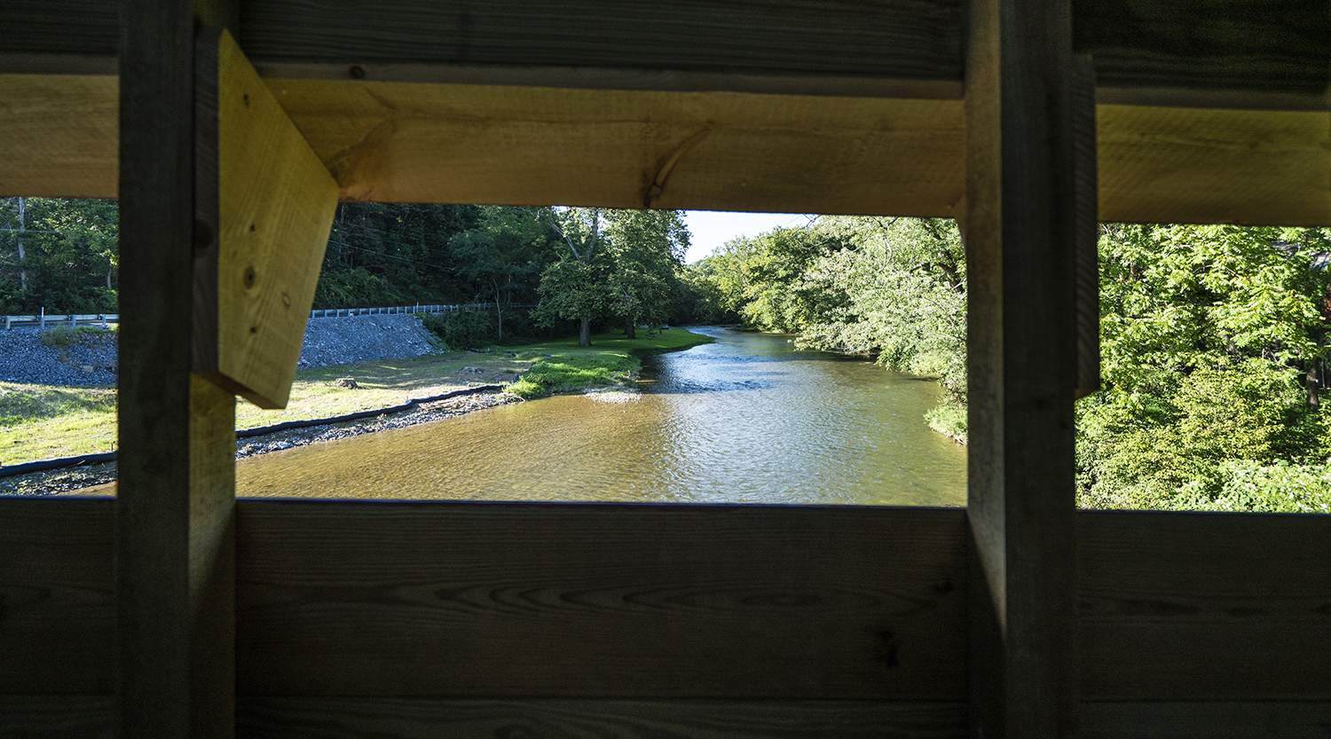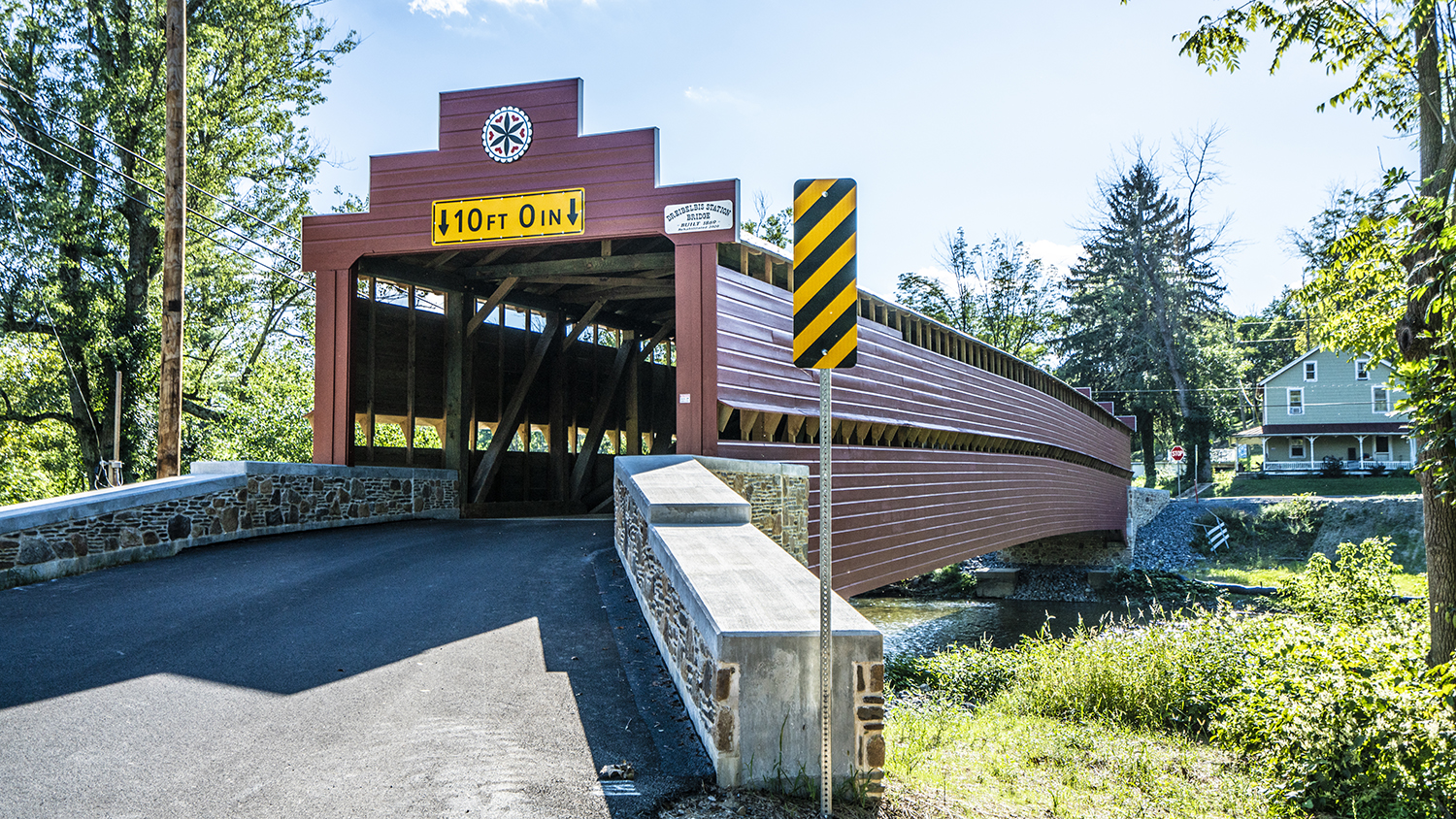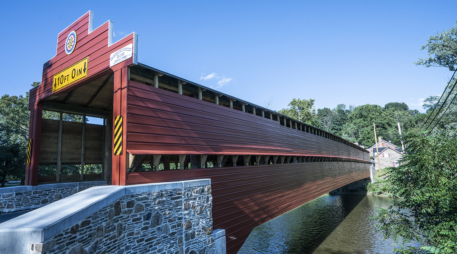 The bridge walls with their Burr arch components were fully assembled at our shop, then disassembled again and trucked to the job-site, where they were again assembled and lifted into position on the new abutments and steel roadway substructure. Television crews and local newspapers were on hand to document the process of the original disassembly, and, of course, the final reassembly on site. A small ceremony and ribbon cutting, with a covered bridge historian and local and state dignitaries, was conducted on August 21st, 2020, more than a year after the start of bridge rehab work. The Dreibelbis Bridge project marks Lancaster County Timber Frames’ 10th covered bridge rehab project.