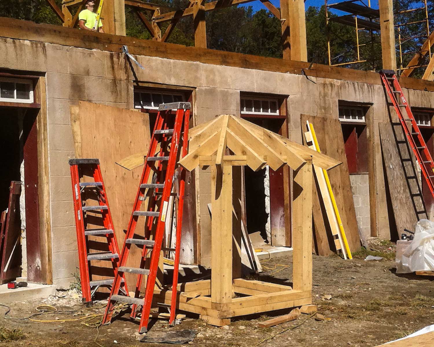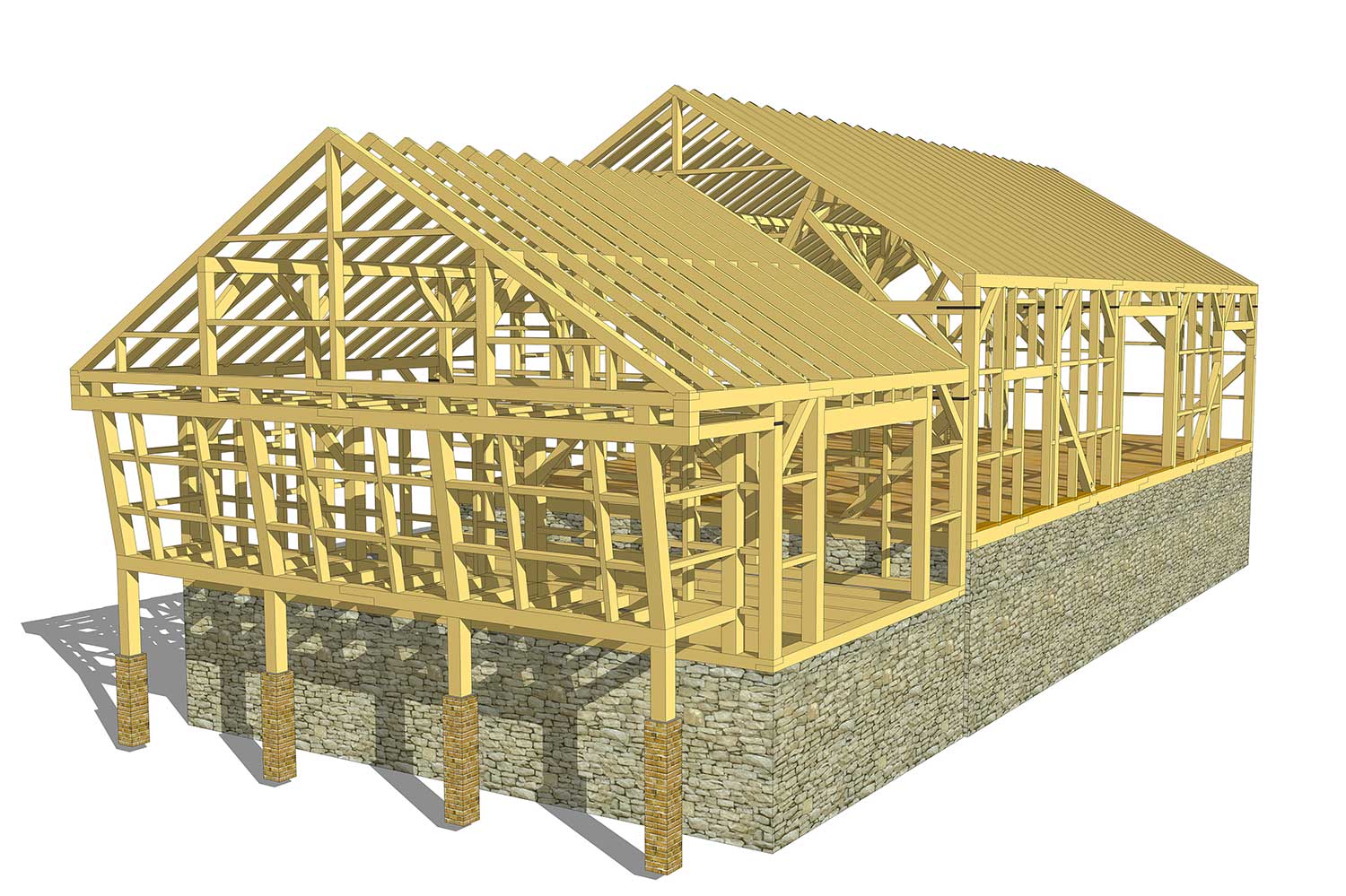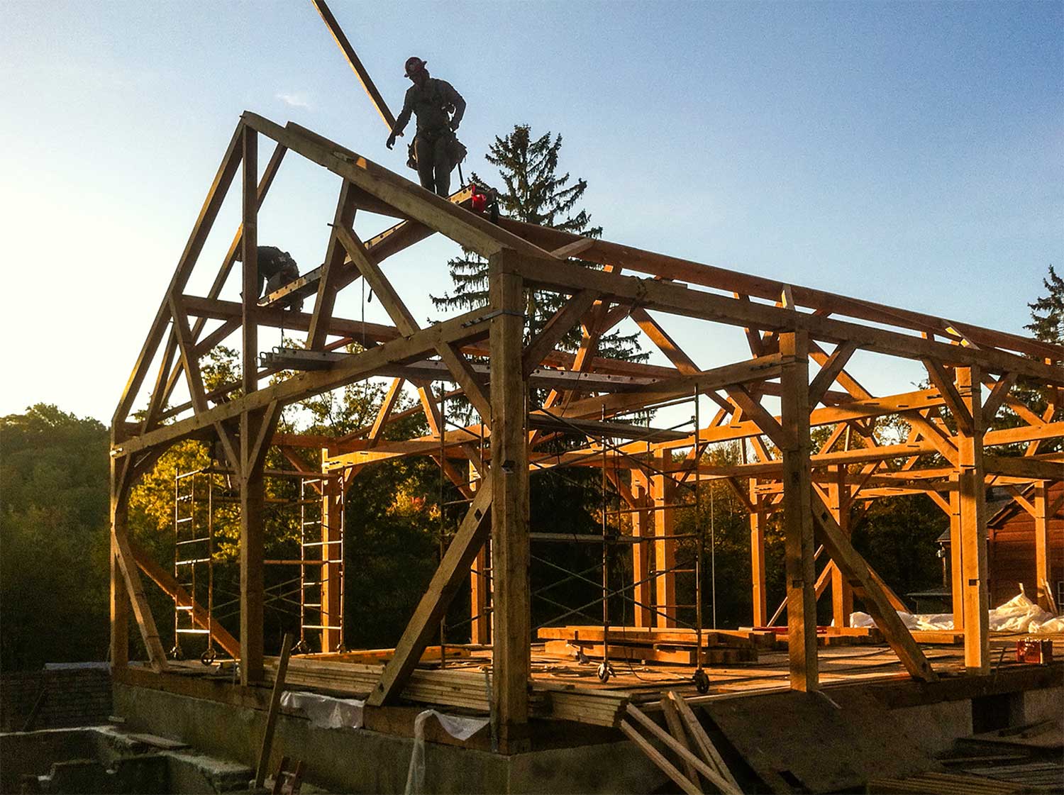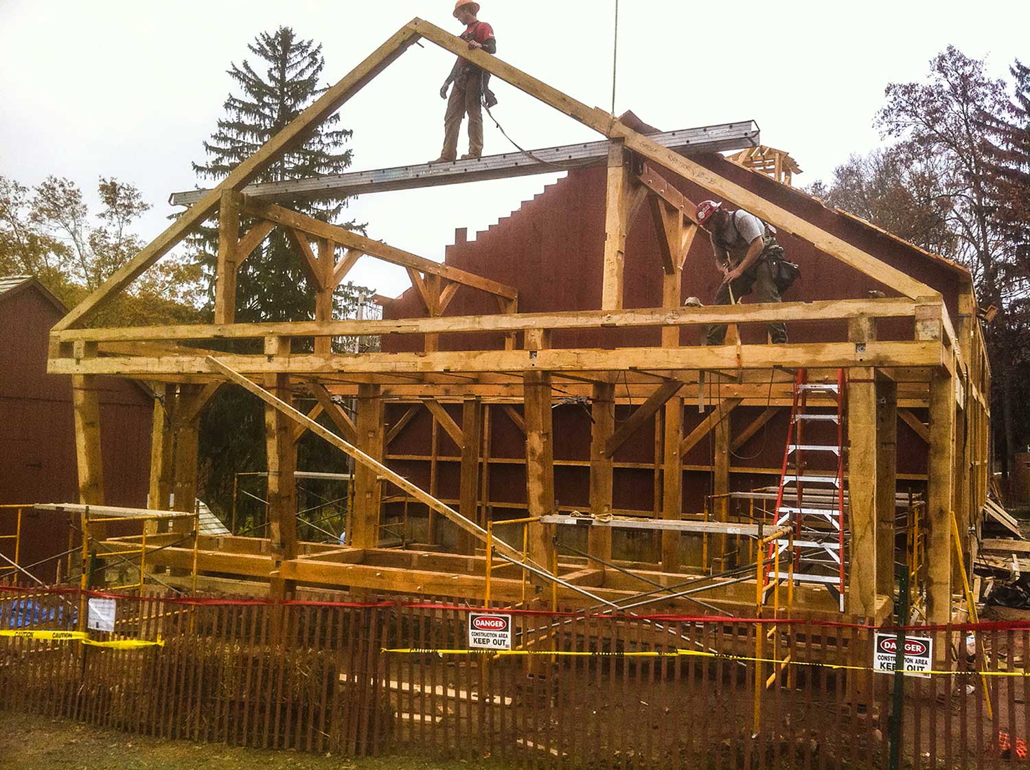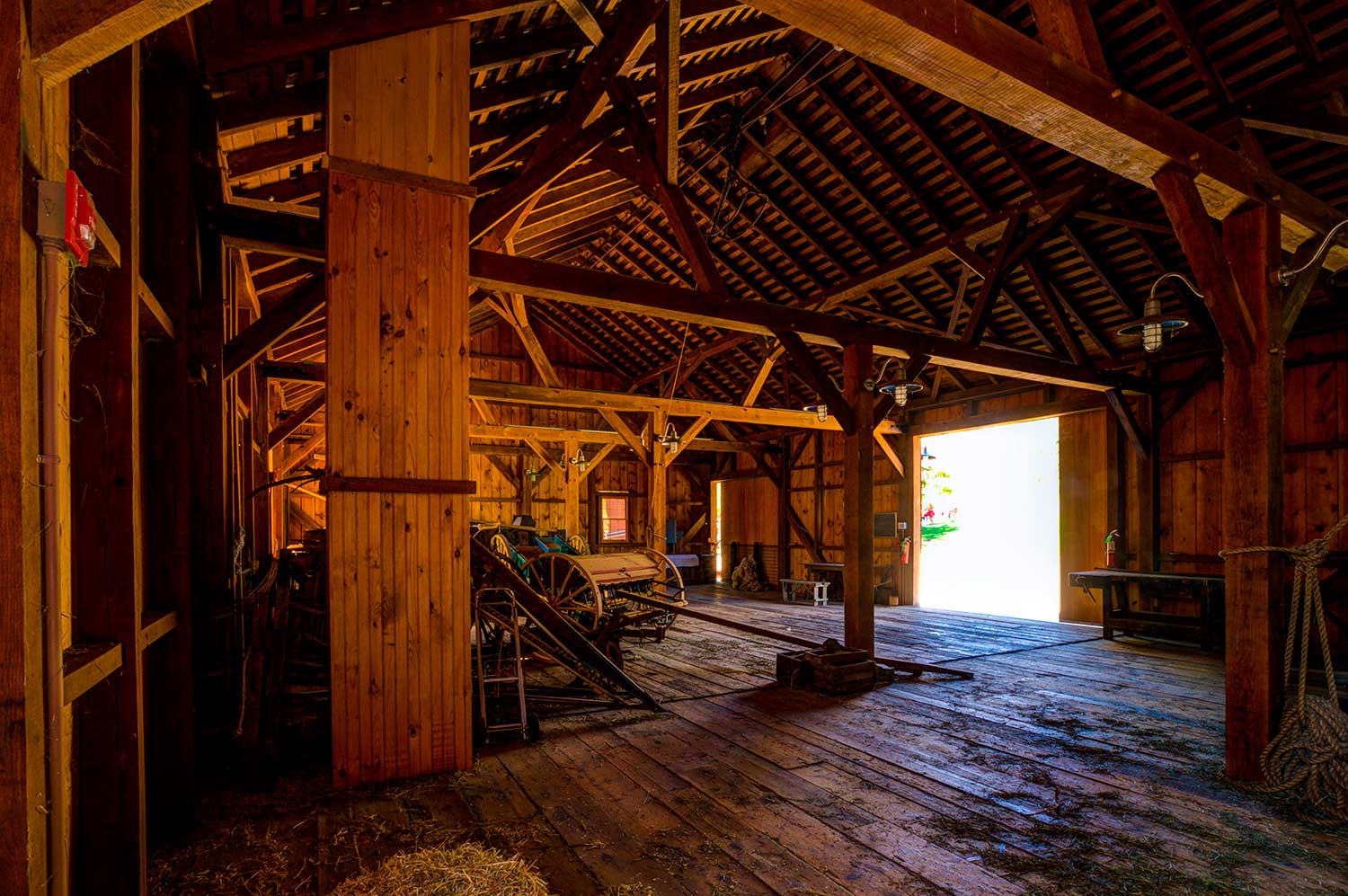 The main barn was built in the 1700’s and was remodeled in the early 1920’s. By 2004 it was determined that would need to be rebuilt. It was also decided the new barn would be rebuilt using the same species timber and in the same structural configuration as the original. The barn measures 36×65, the ensilage and corn crib measure 32×18. Close to 700 rough cut White Oak timbers were needed, six of which were 36’-long 8 x 8’s. The only significant structural alteration needed to secure an engineer’s seal was the addition of wind braces in the roof plane.
