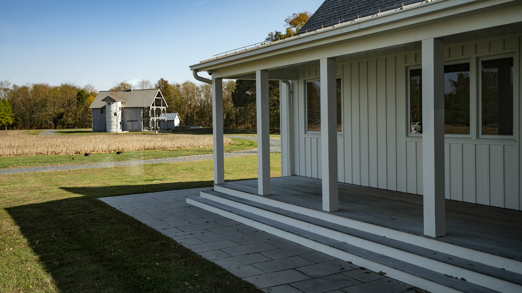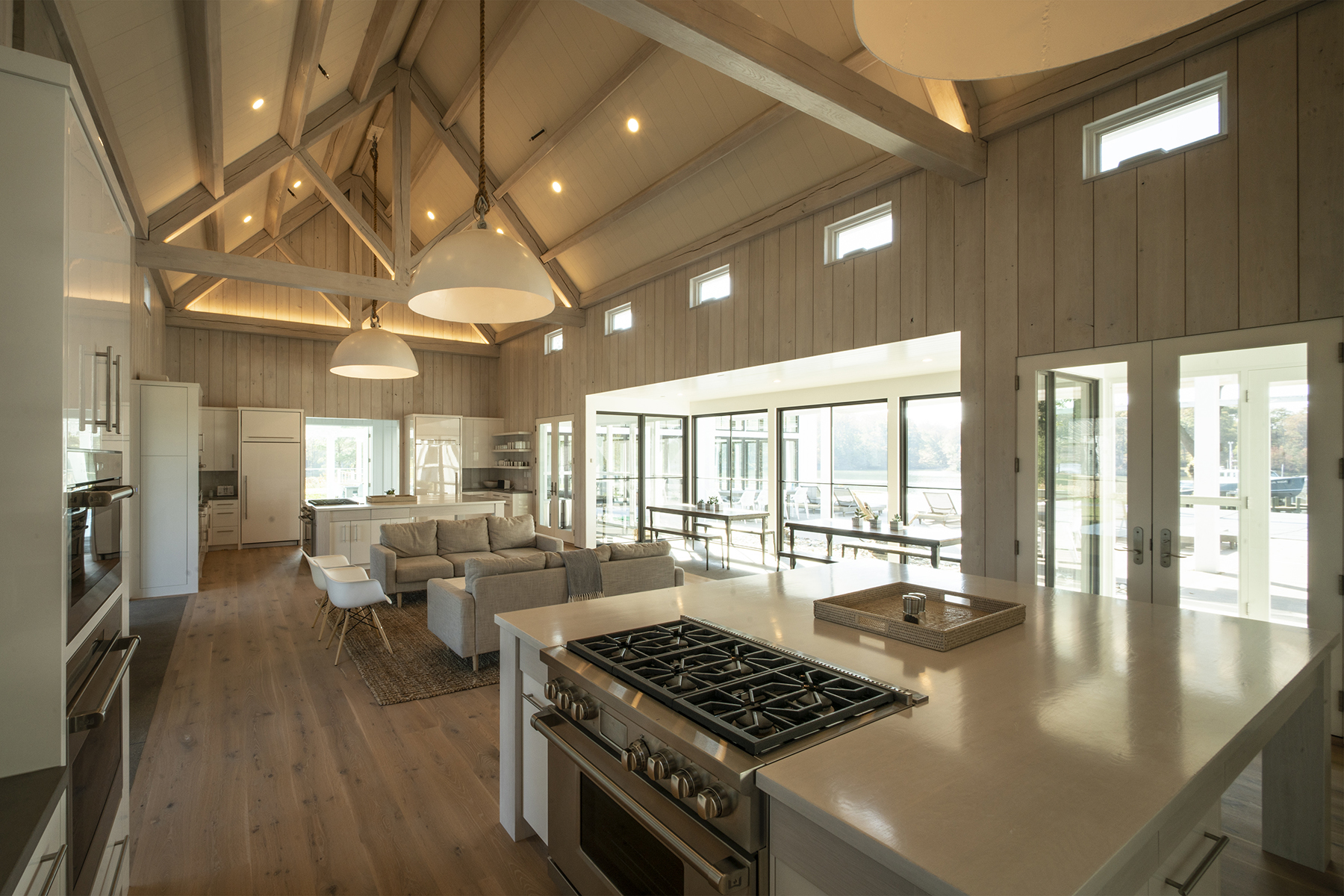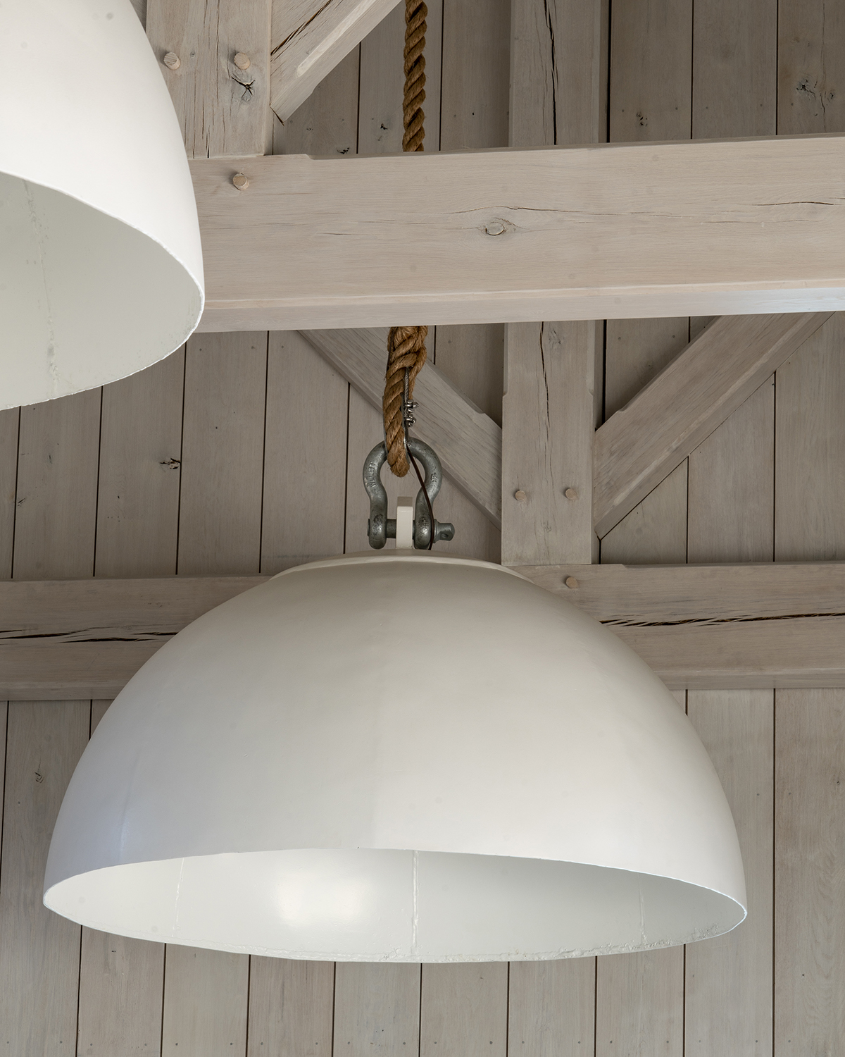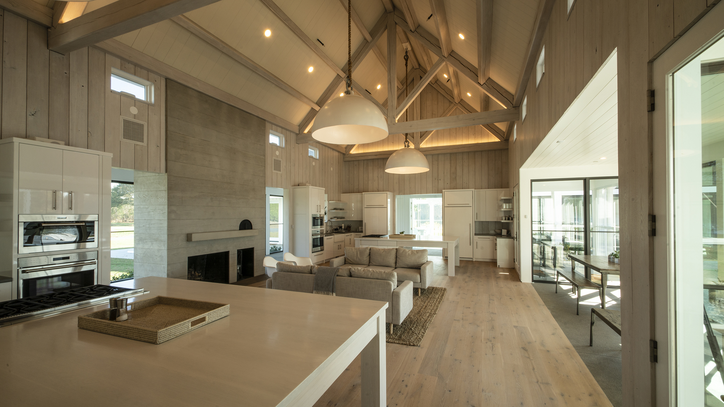 The entire house strives to create a feeling of openness and airiness so, towards that end, the white oak timbers and ceiling are whitewashed.