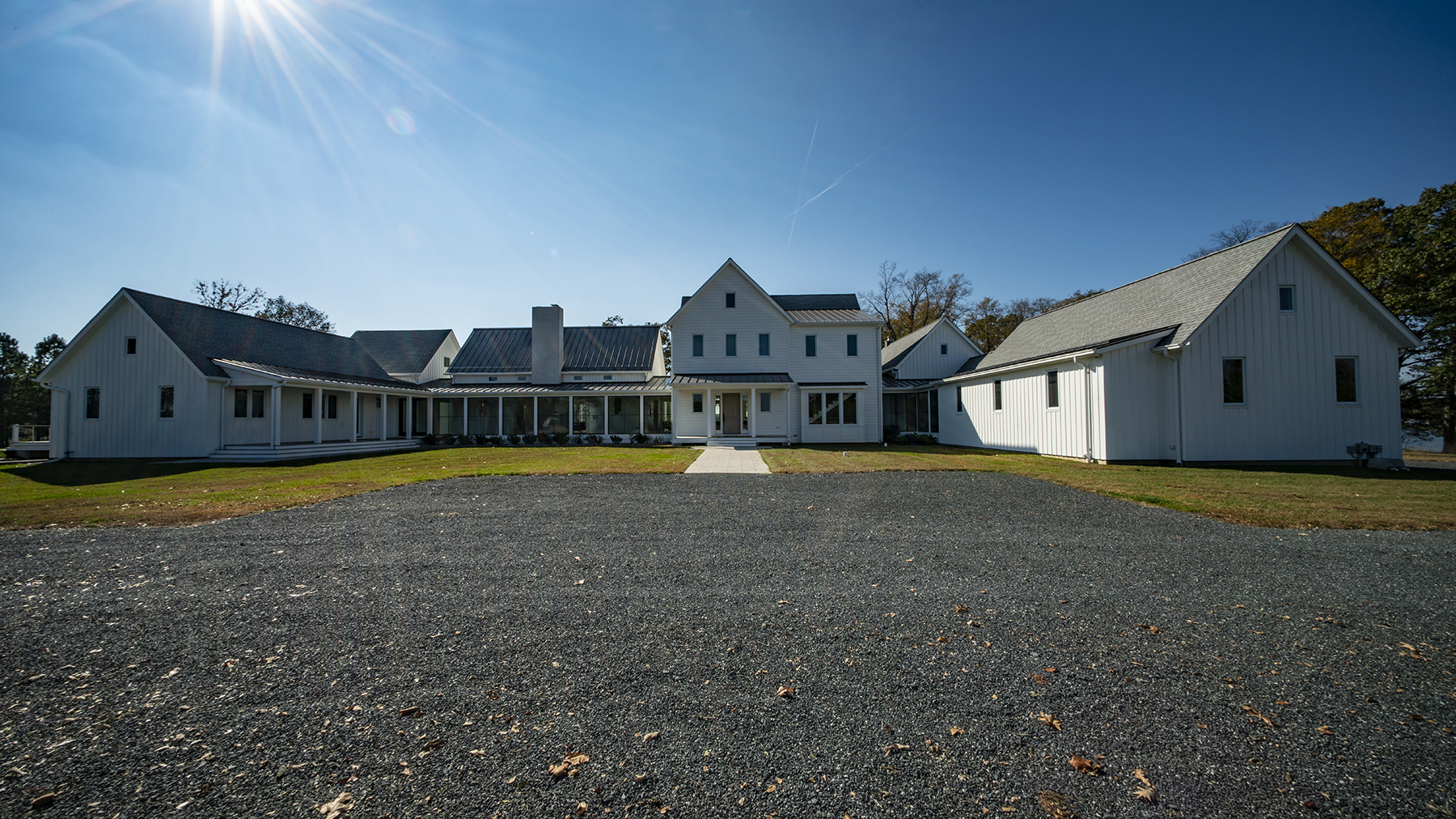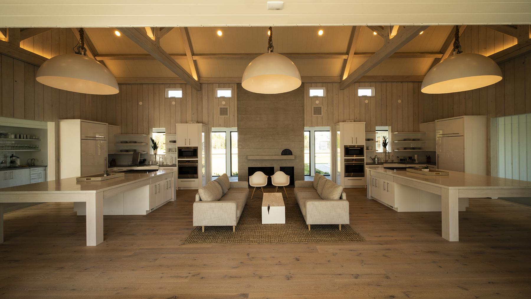 The only section of this sprawling Eastern Shore home in Maryland in which we worked was the kitchen. Measuring in at just shy of 1,000 square feet, it is the largest residential kitchen we’ve encountered in the last three decades. It’s the room in the opening photograph showing a large rectangular chimney. The room, roofed by four king post trusses connected by purlins, is actually two mirror-image kitchens separated by a seating area and a fireplace. The owners both love to cook and entertain. The hanging light fixture in the three bays are actually halves of buoys and measure four feet across.