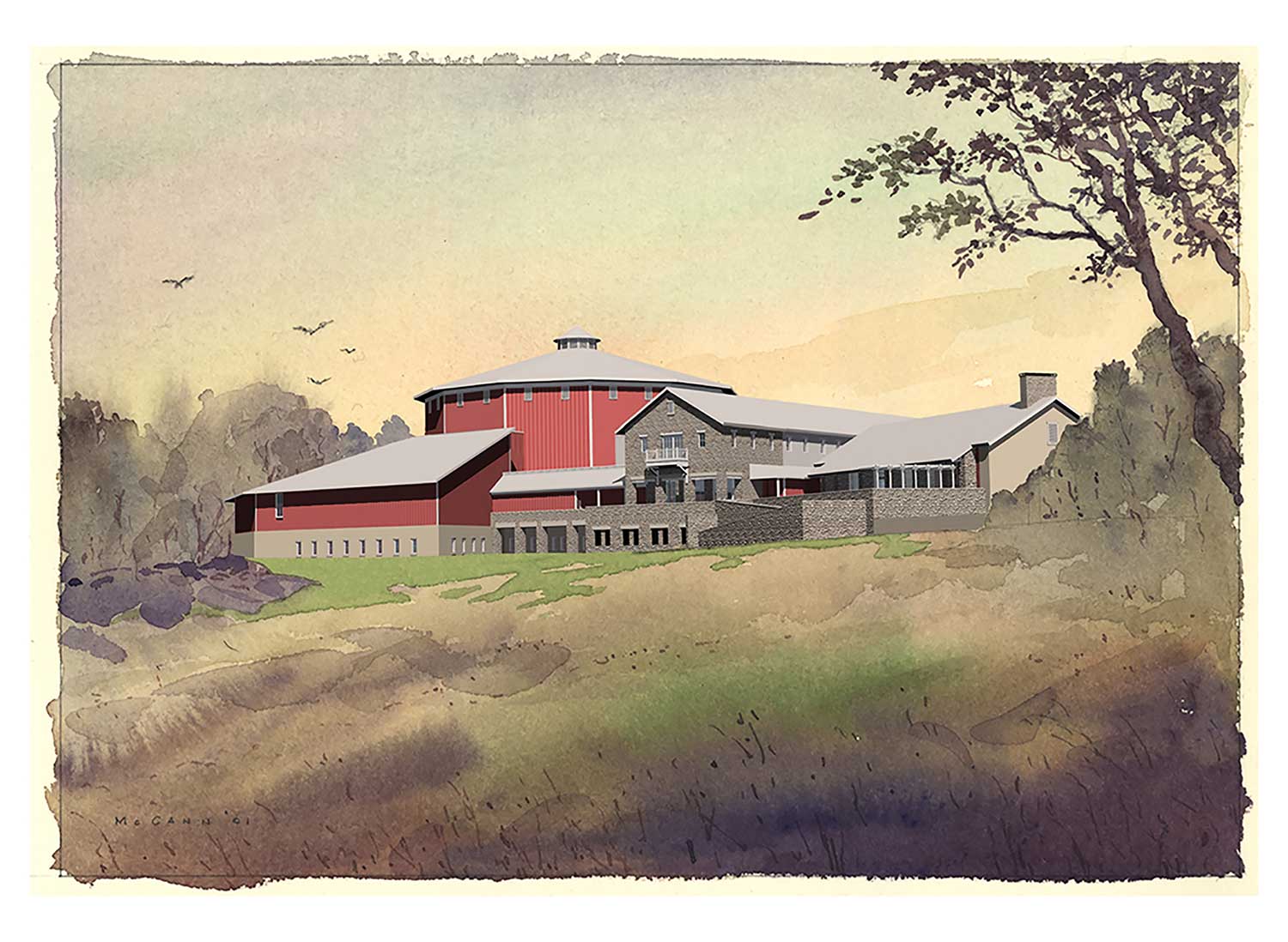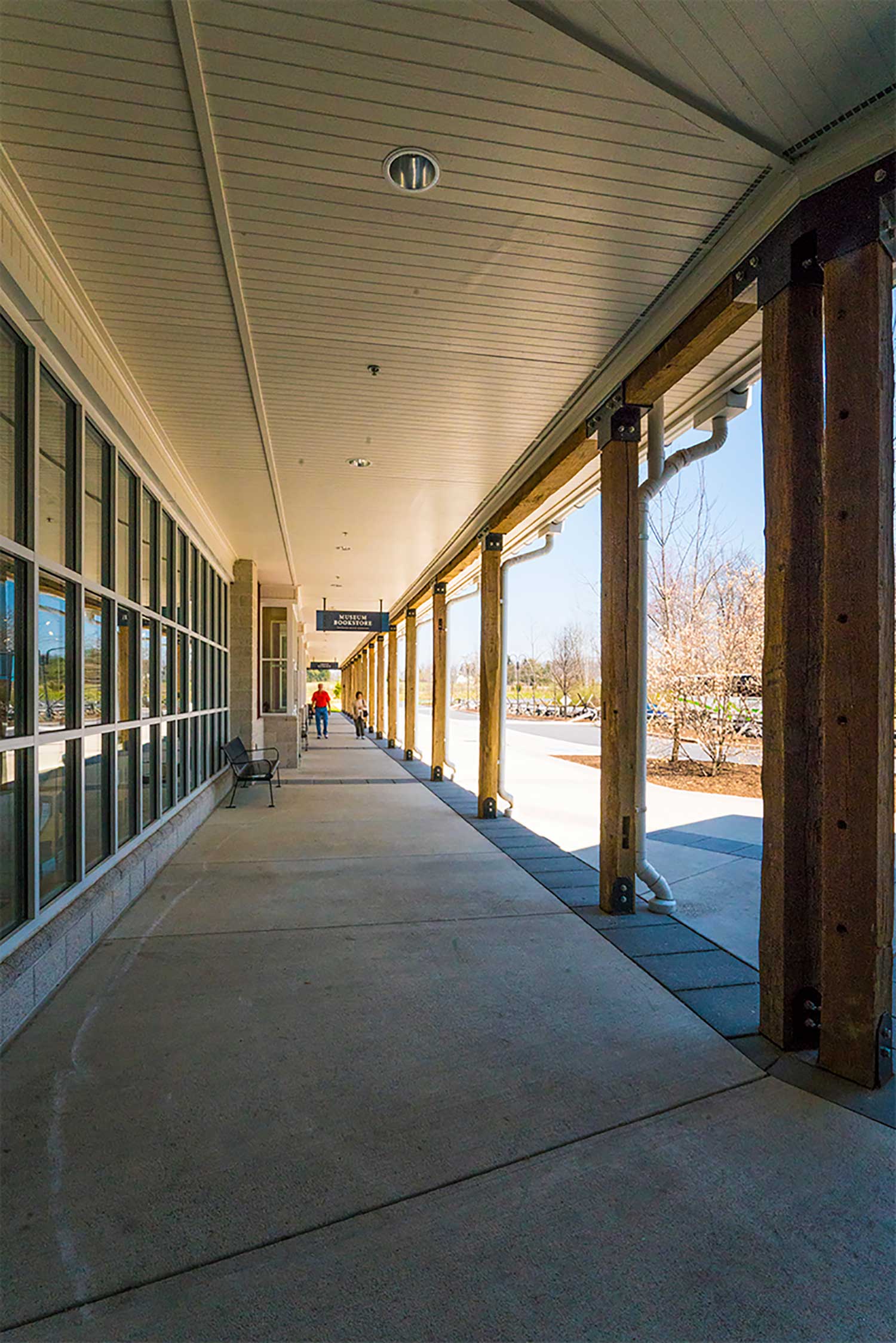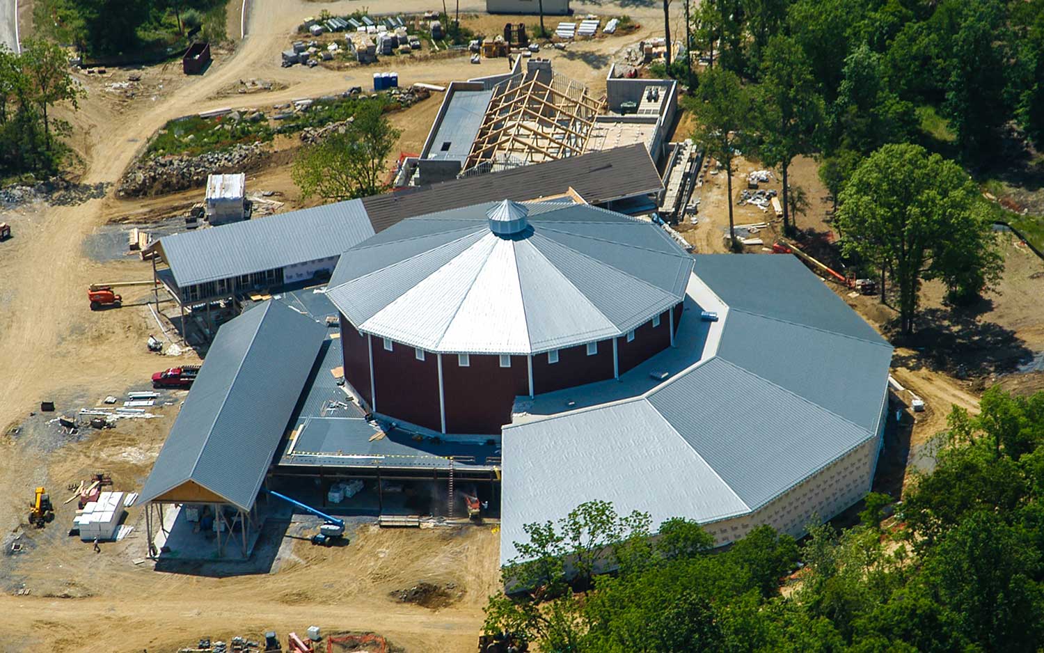 This facility, more than 130,000 square feet, replaced the much smaller original structure that had served for 87 years. Three timber species were used: Port Orford cedar, fresh-sawn white oak, and reclaimed mixed oak. The latter two were the predominant species: the fresh-sawn oak was harvested in Pennsylvania, while the reclaimed mixed oak came from dismantled Pennsylvania barns. More than 400 timbers were worked and the total board footage was just shy of 10,000. The structure was the first US museum to achieve LEED Gold certification.