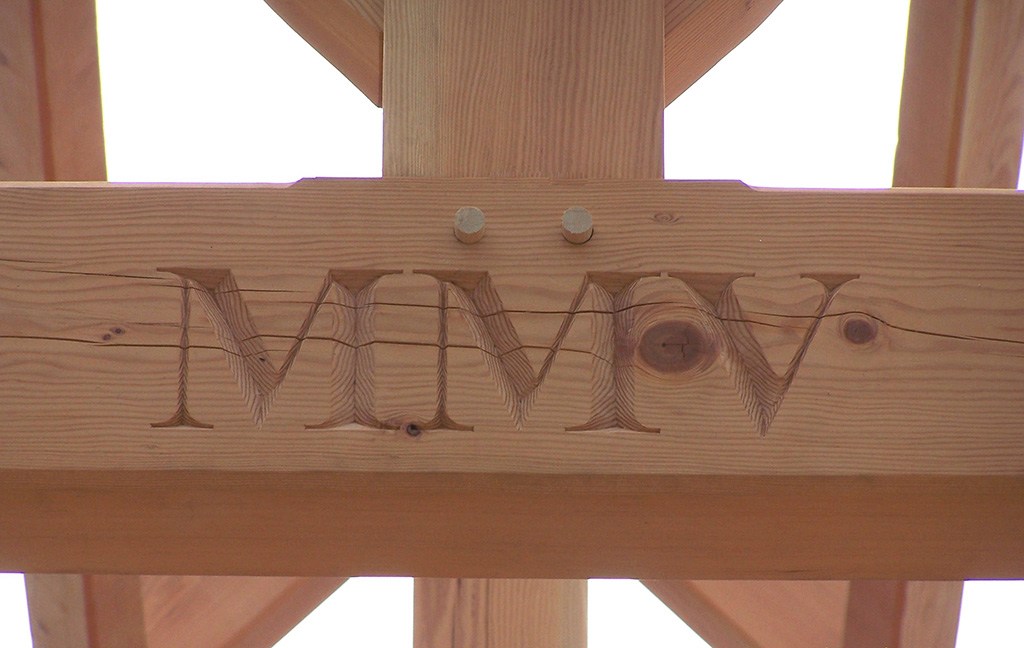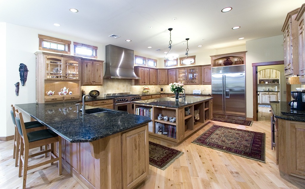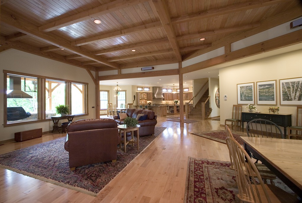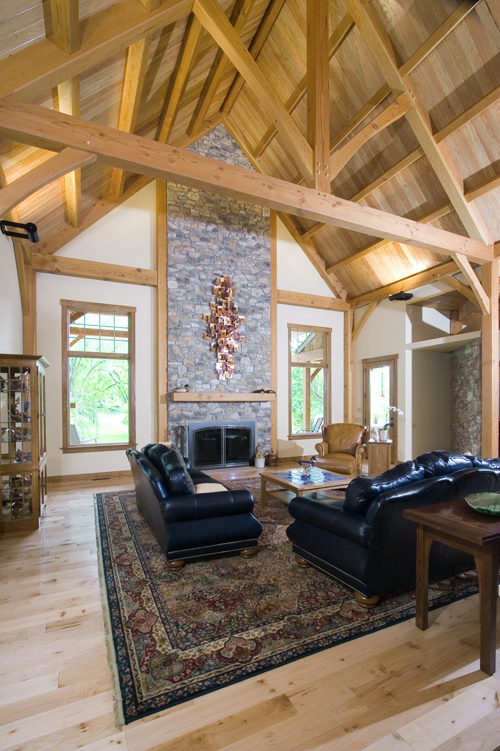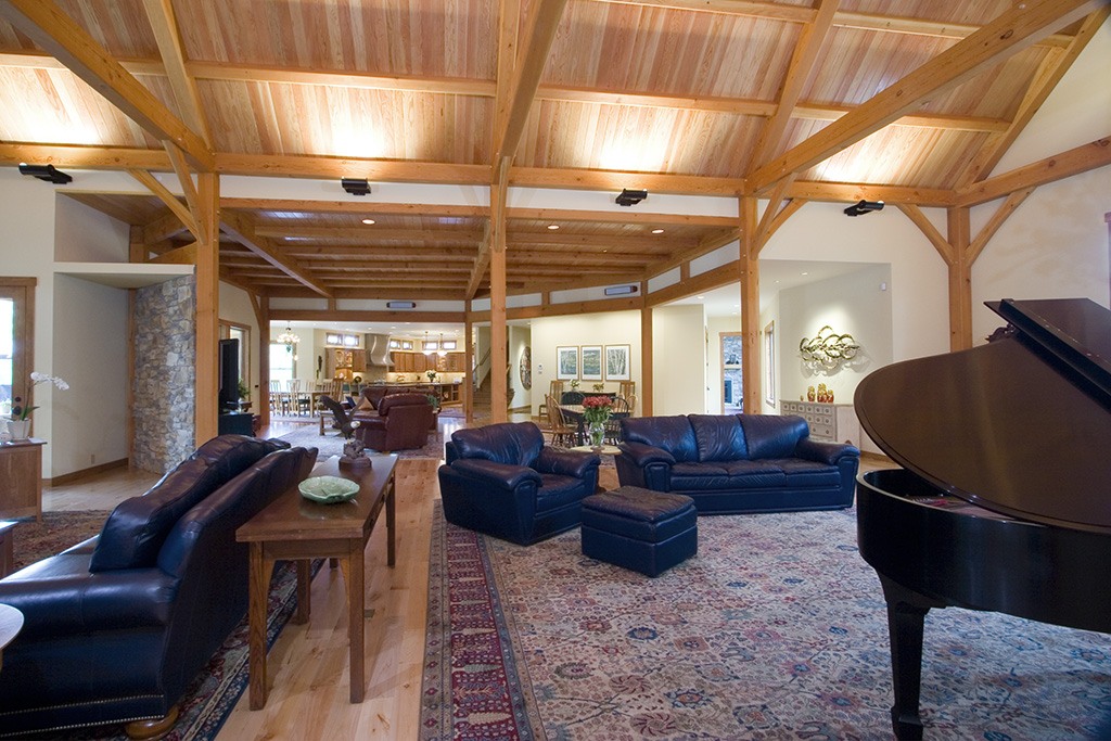 A large house with the feeling of a mountain lodge on the edge of a wooded area with a creek running through it, this large residence for two retirees was designed for entertaining. Continuing the vast great room’s roof line there’s an equally large timber-framed lanai and outdoor kitchen in the back of the house with a view of the woods, and a large family room with ceiling timbers between the kitchen and great room. Both interior and exterior use the perennially appealing combination of stone and wood. Board and batten and cedar shingle siding summon associations with New England horse barns. The timbers are Douglas fir, finished with a clear Danish oil.