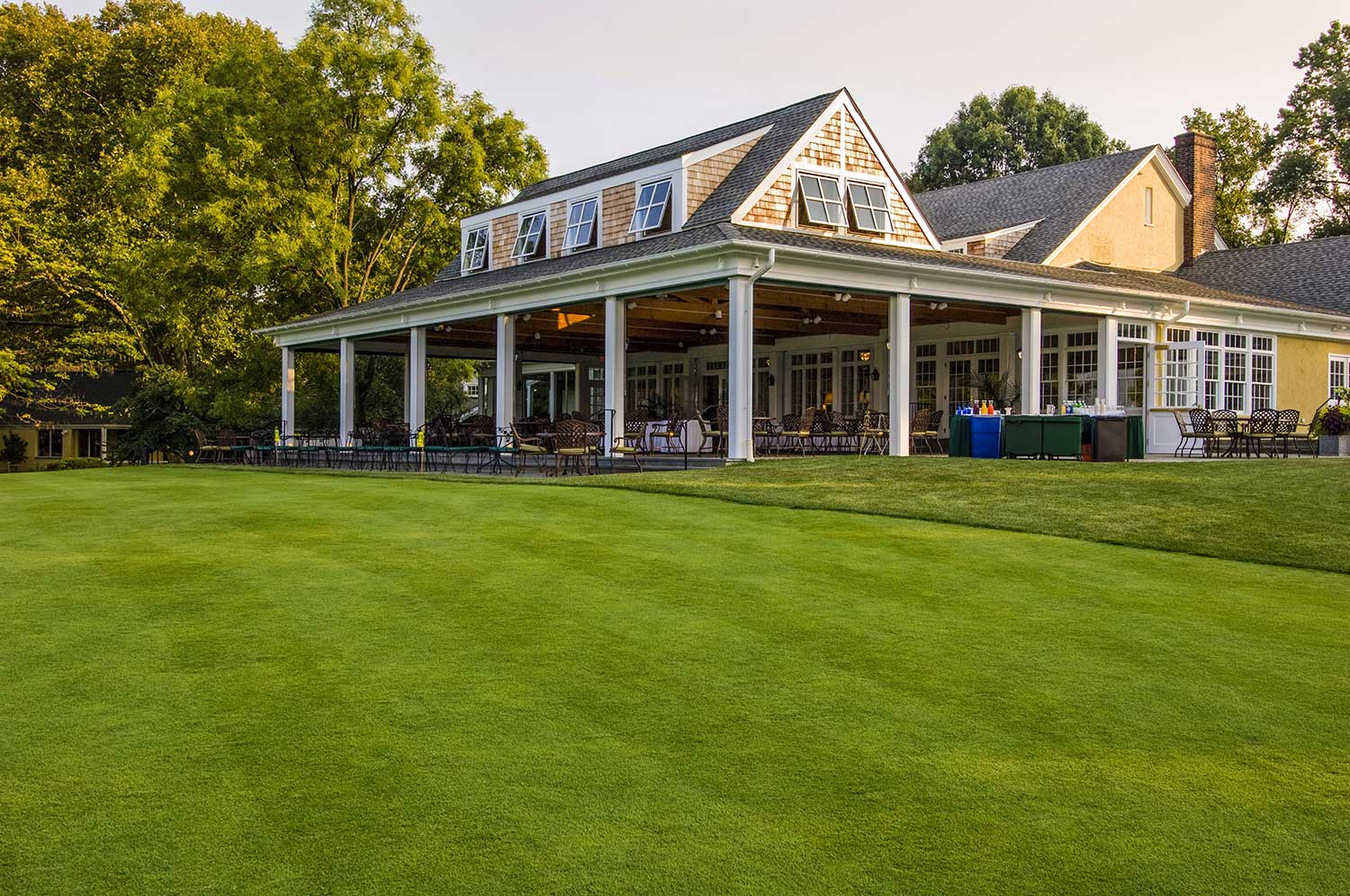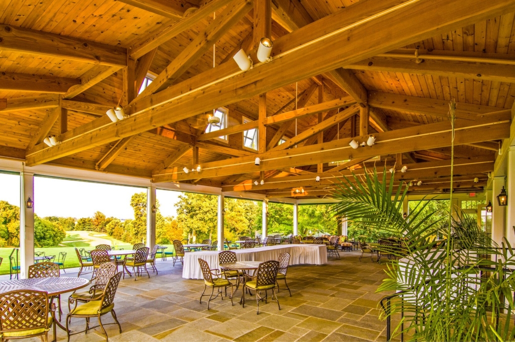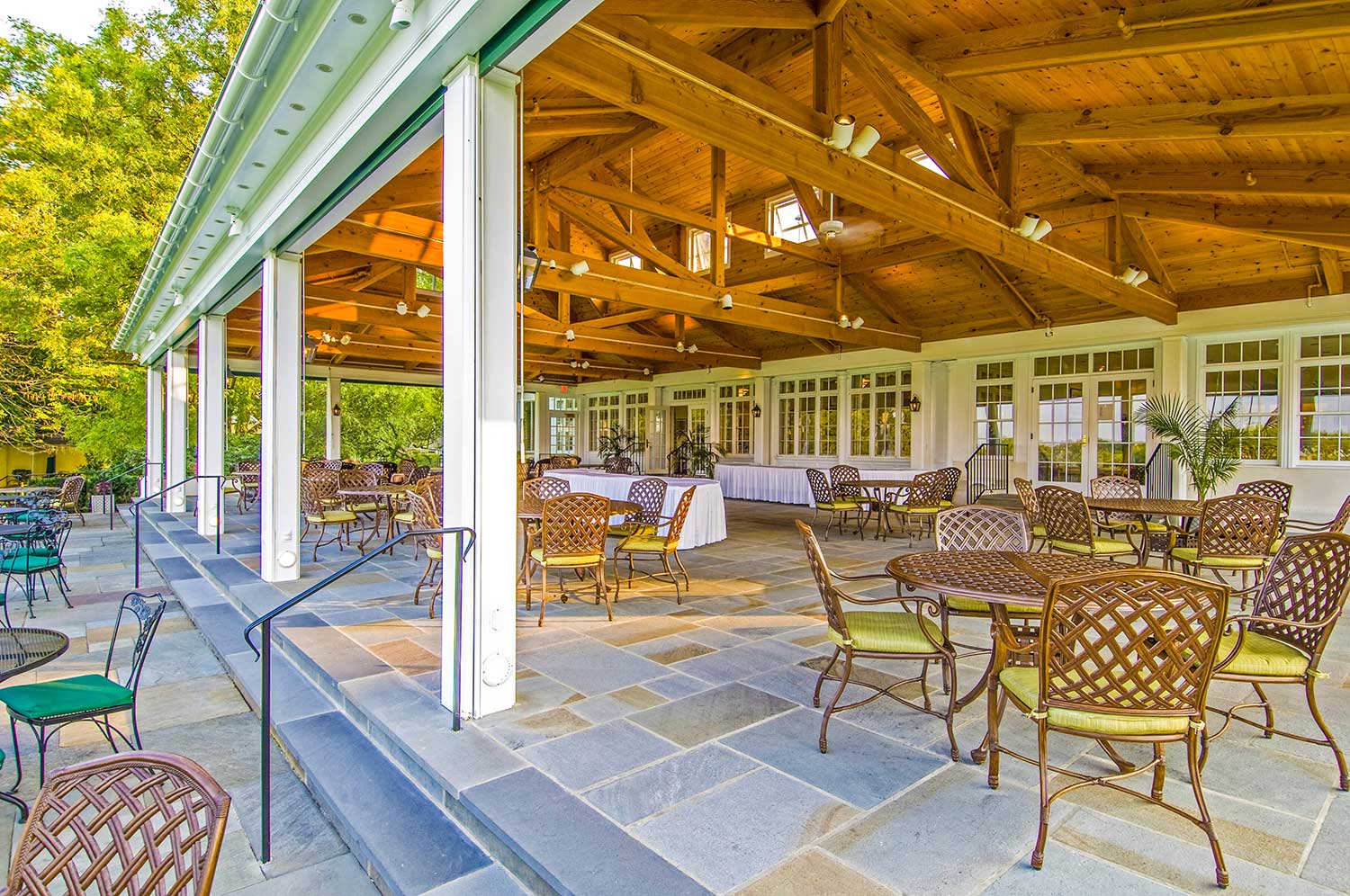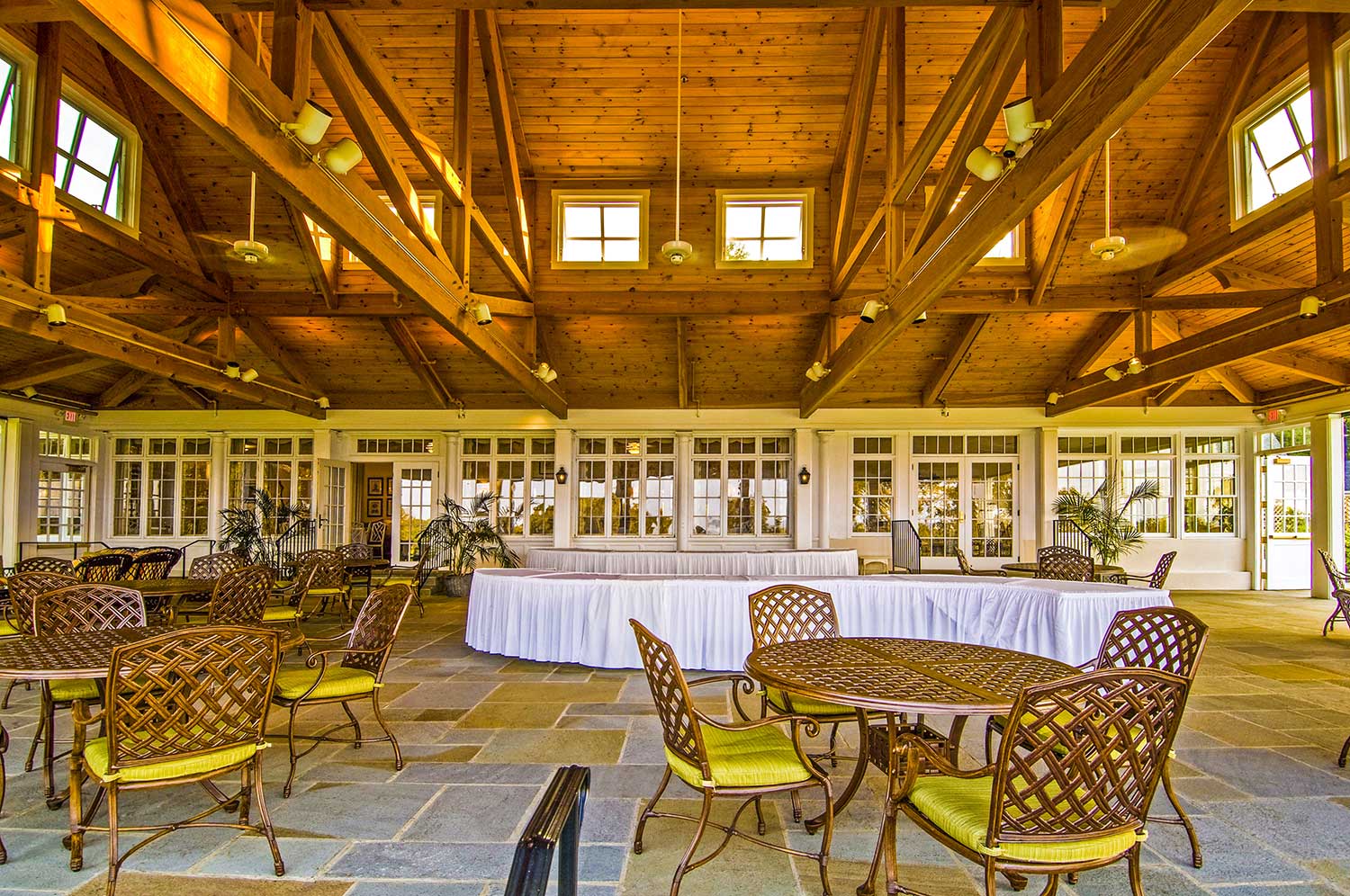 The membership of this private club wanted a covered outside dining area adjacent to the main clubhouse. This 2,500 square foot three season room is wide open on three sides, but there are retractable walls hidden in the soffits to make the three season use possible. Shed dormers on both sides of the roof have operable windows which vent hot summer air and draw in cooler air from down below. The timbers are Douglas fir, select structural grade, free of heart center. The joinery is predominantly traditional mortise and tenon, but there are also steel connectors embedded and concealed in the timbers to handle high tension loads.