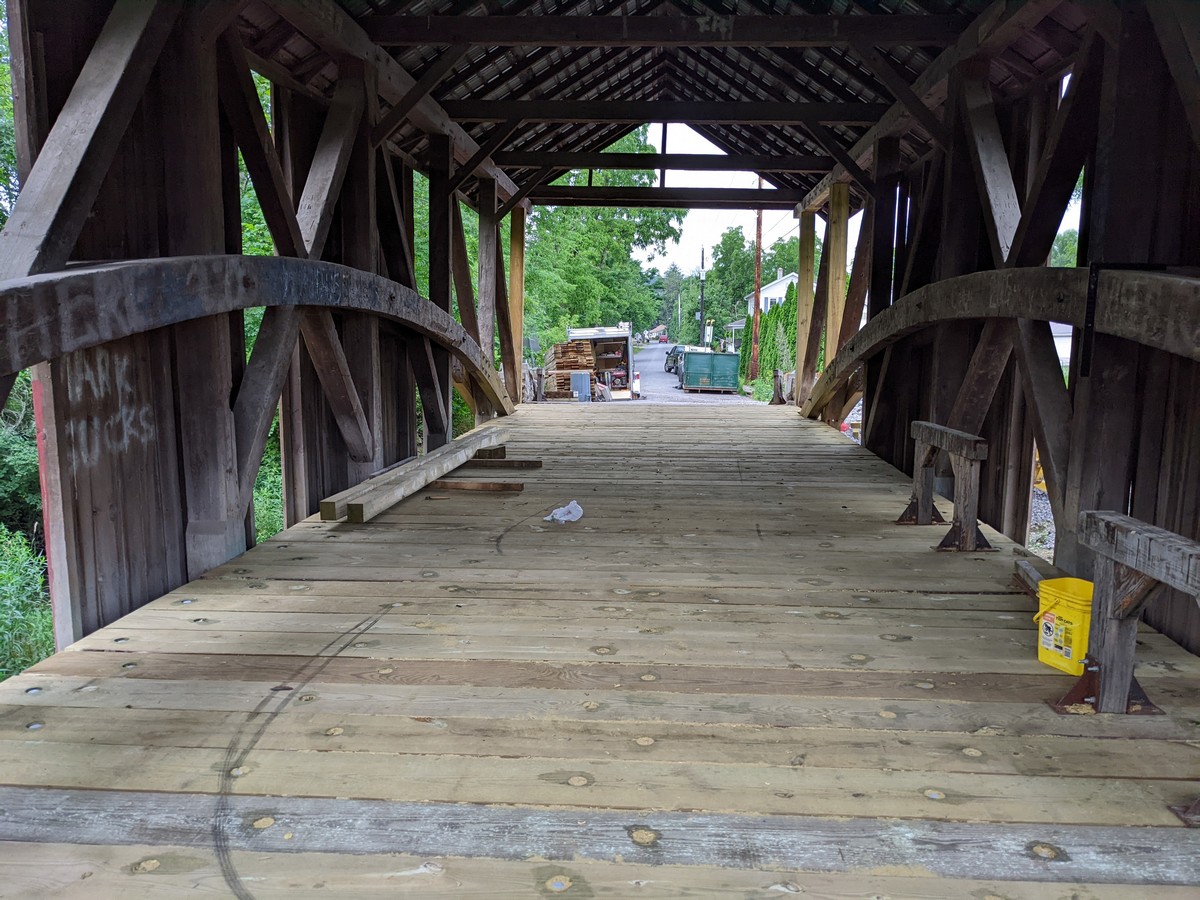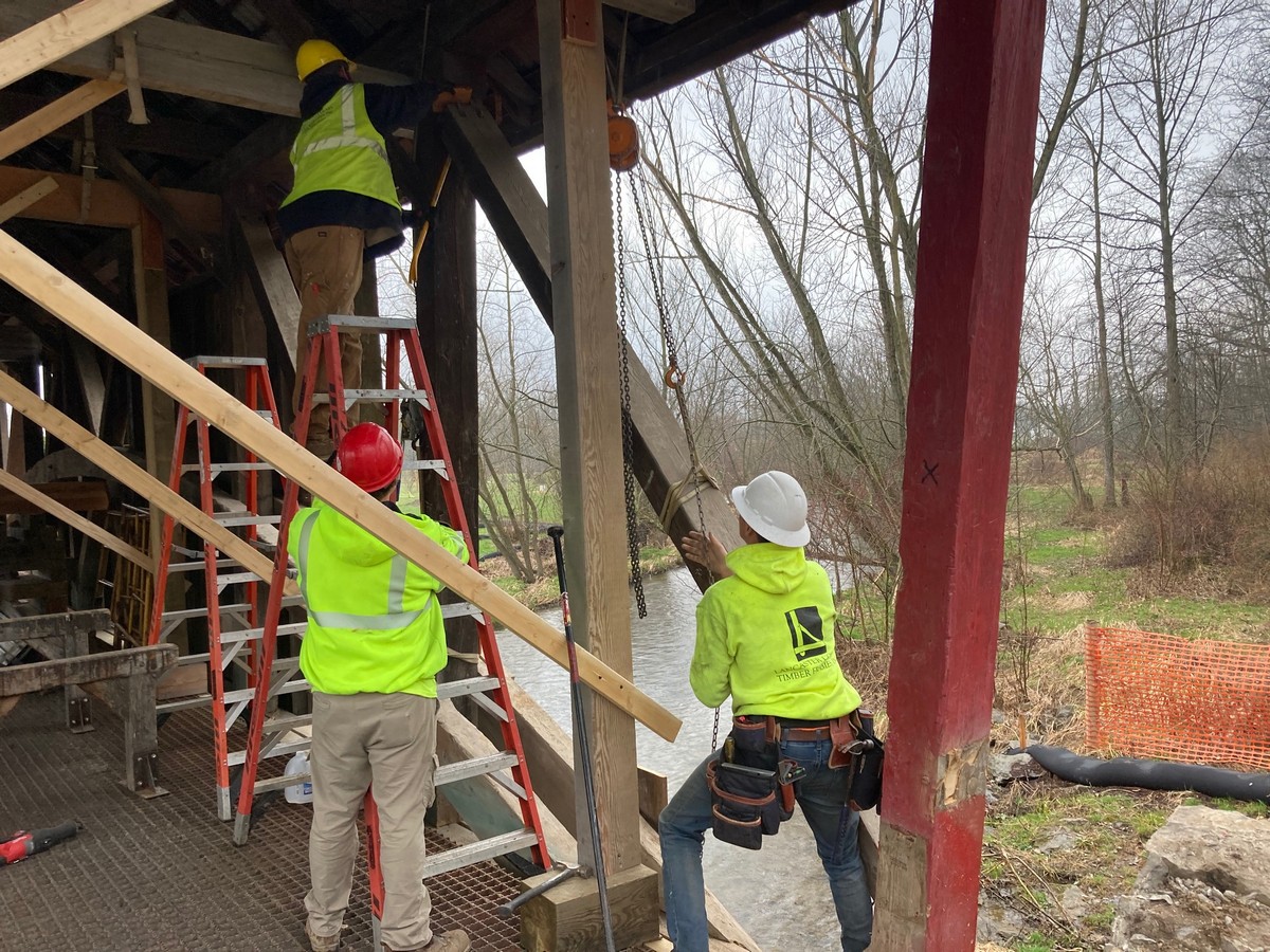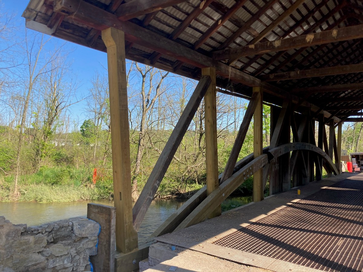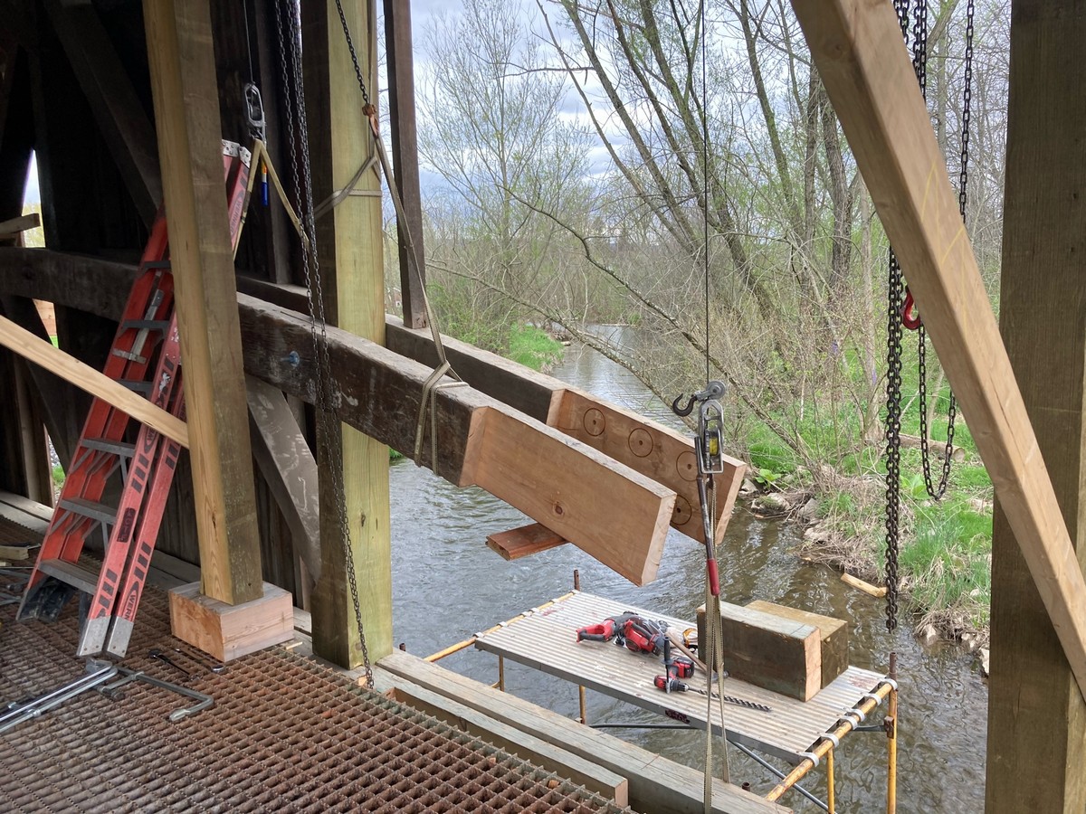 LCTF replaced approximately 30% of the original 1825 timber structure due to decay and deterioration. A 7″ thick timber deck was added to the top of the steel bridge beams restoring the interior to all timber components.