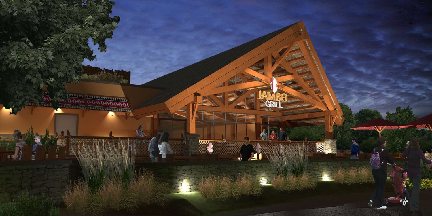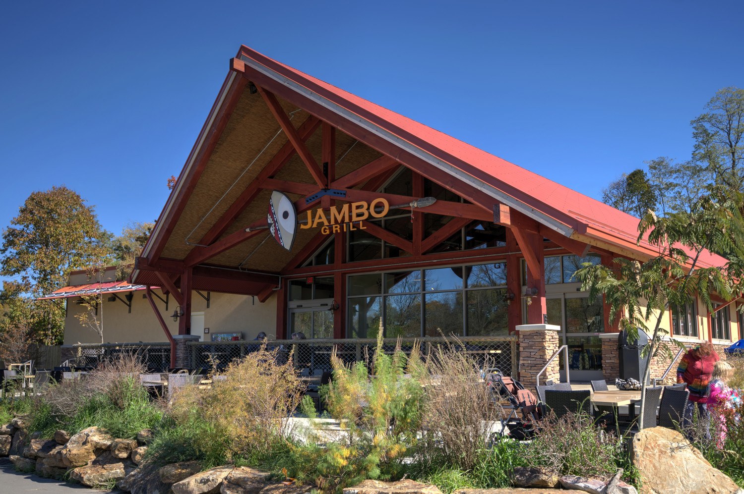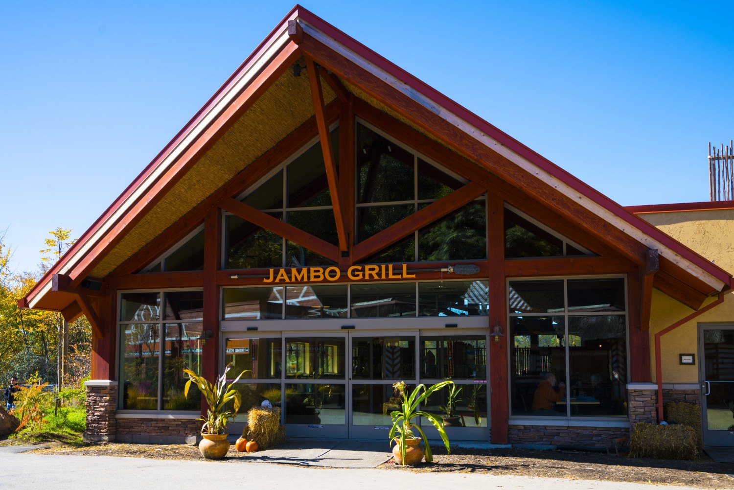 This structure is named the Jambo Grill. Jambo was a silverback gorilla that rose to fame in 1986. A five-year-old boy fell into the gorilla enclosure at the Jersey Zoo on the island of Jersey in the English Channel. As the boy lie unconscious, Jambo placed himself between the child and the other gorillas and stroked the boy to comfort him. Jambo then led his troop away, allowing the zoo personnel to reach the boy.