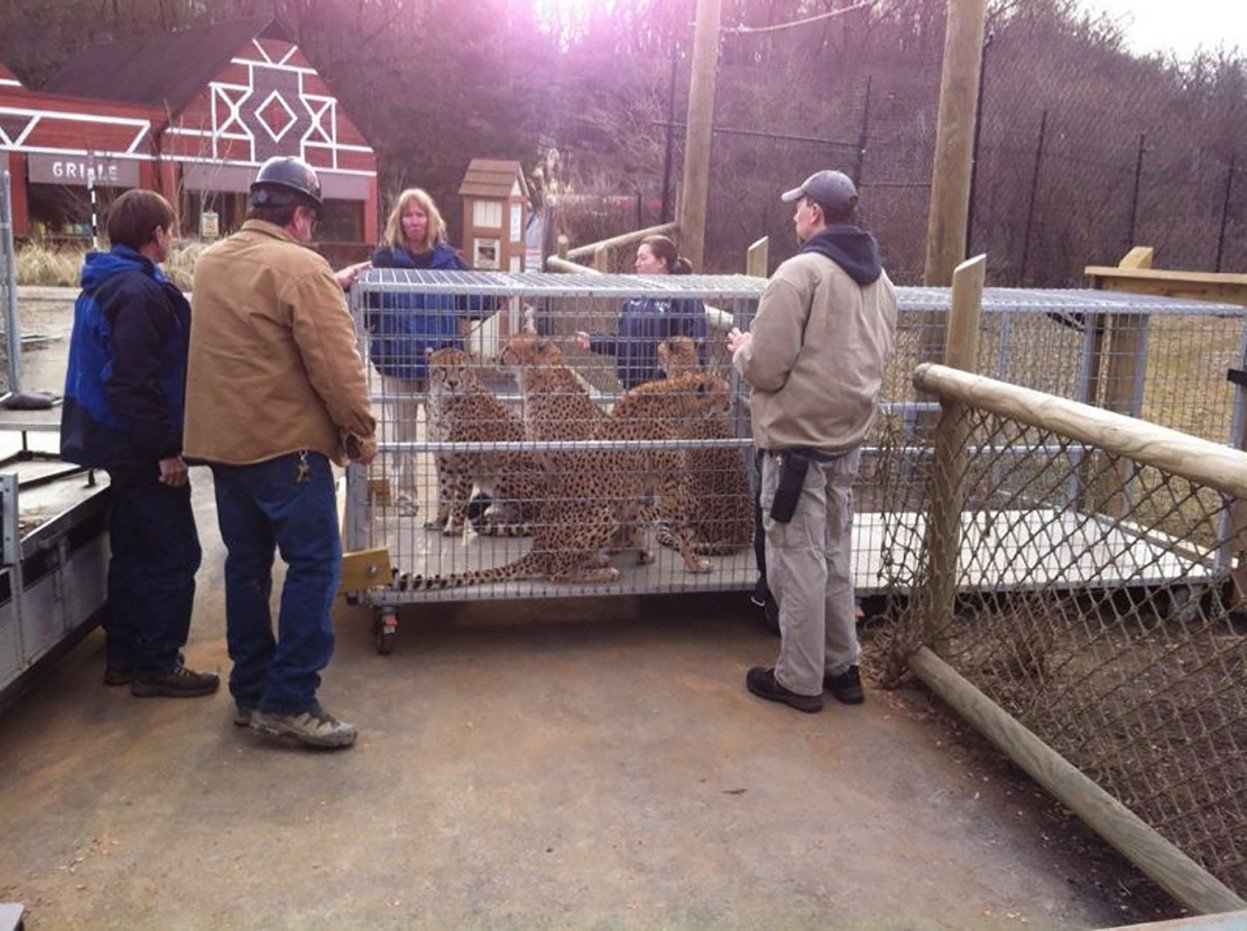 The second issue was access and staging. Because of the meandering walkways, found in many zoos, which lead from one exhibit to another, we knew from the beginning that there would be challenges. Initially, we believed that the raising site would be off-limits to pedestrian and cart traffic. Late in the game we were informed that a four-foot pedestrian path would have to be maintained at all times. Instead of one staging area, we needed several, some 100 yards from the raising area. Due to the curves and the narrow width, (in some places barely eight feet) trucks and equipment had to be backed in over considerable distances. The outriggers for the forty-ton crane necessitated that the cheetahs be temporarily relocated to a different enclosure – there was no other way.