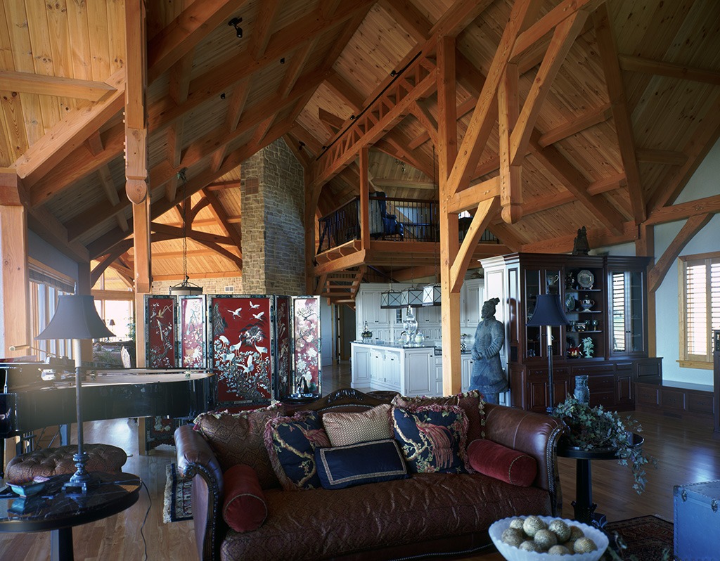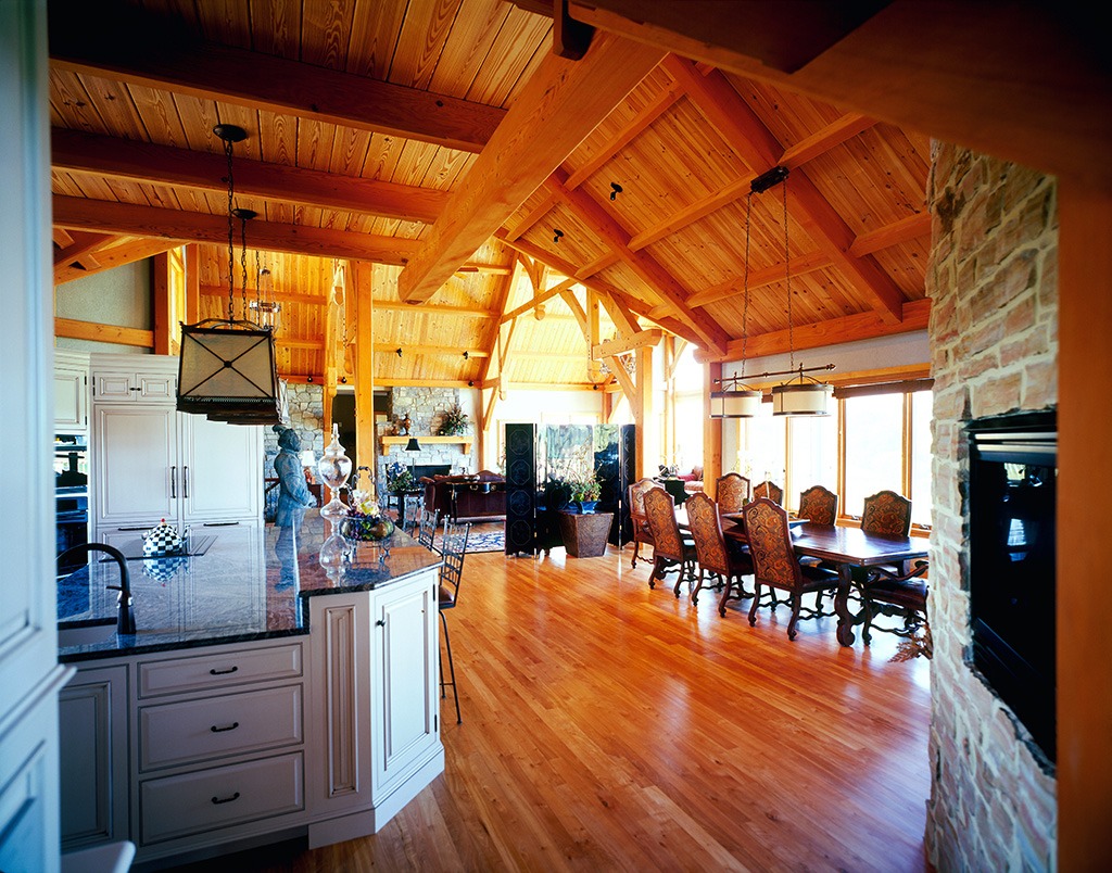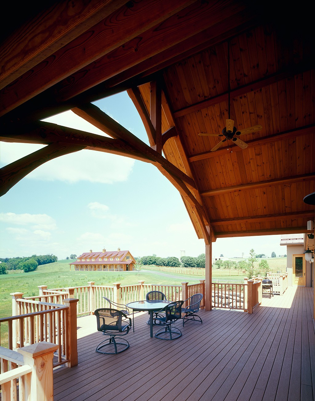 This is one of the largest and most extensive hybrid timber frames we’ve done to date. Set right in our back yard in the bucolic farmland of central Pennsylvania, the timber-framed areas in this house include the front entrance, the great room and family room, the kitchen, and dining room, a master suite and two exterior porches, two sets of exterior stairs from the deck level to the patio area below, stairs from the kitchen to a loft/home office above, and timber columns throughout the walk-out basement, as well as other timber accents. There’s also a separate timber-framed horse barn on the property.