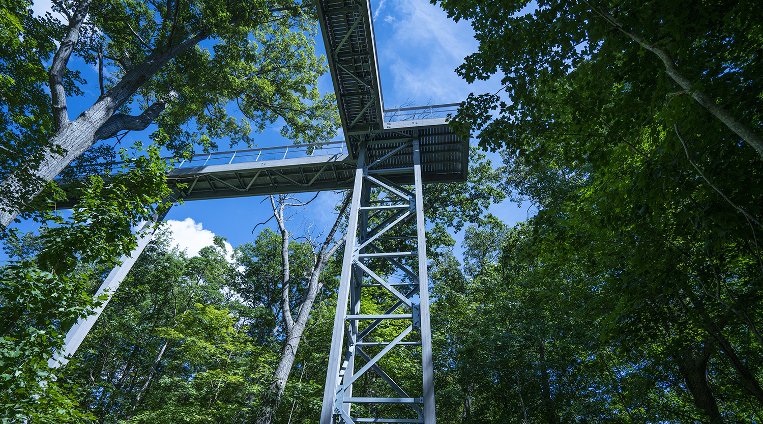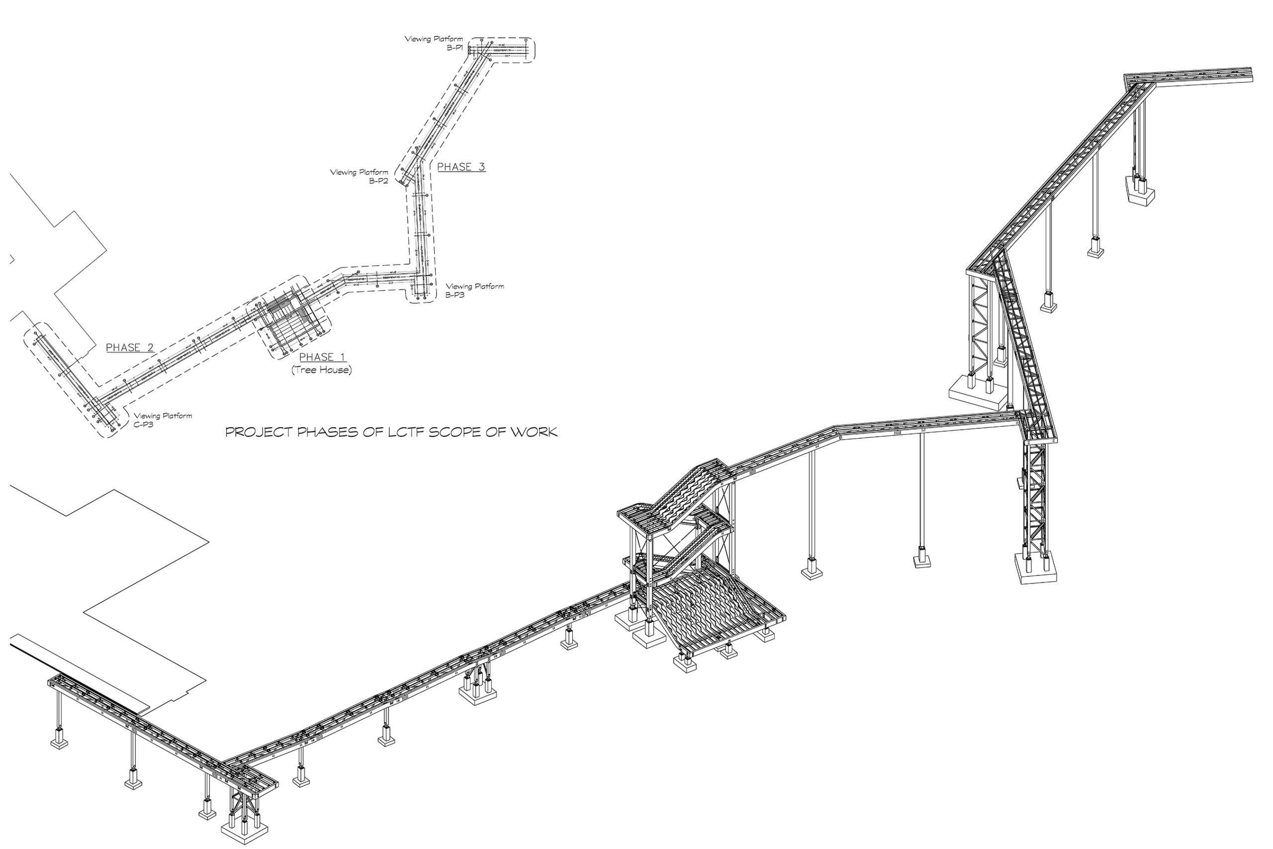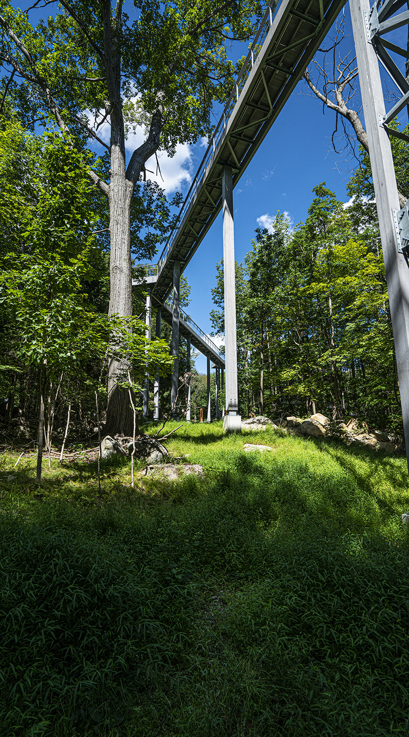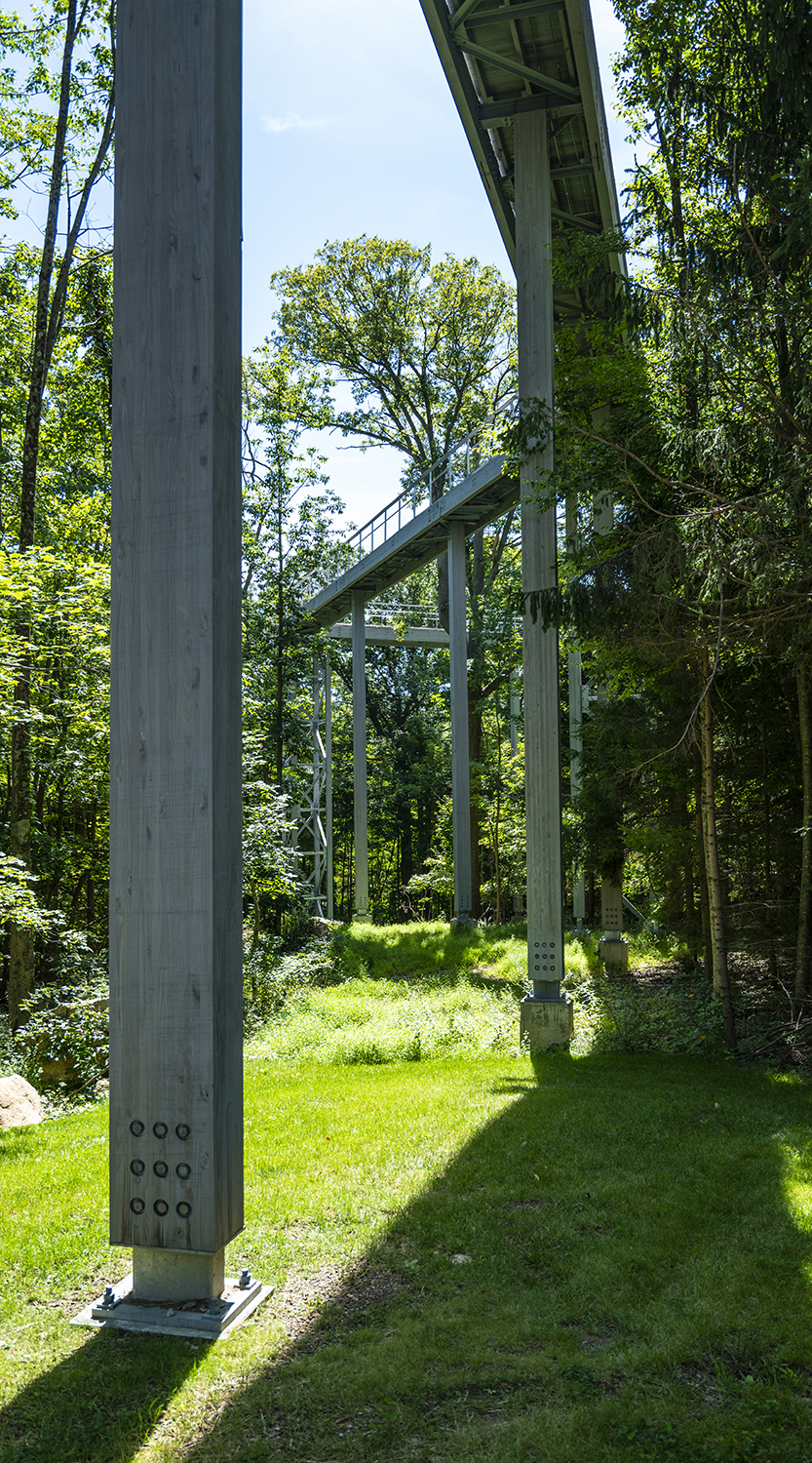 The core of the elevated structure is a three-story tall “tree house” which provides “classrooms” in the guise of outdoor lecture areas. While the structure also uses steel as a structural component, the dominant experience of a student or other visitor is molded by the extensive use of exposed glue-laminated timbers and wood flooring materials, in harmony with the stunning views and forest setting. It is fitting that the “forest bathing” experience this structure strives to provide is also made possible by natural timber materials, rather than by other, less environmentally friendly materials. In addition to the congruence between the structure’s timber materials and the educational uses of the structure, the choice of wood as the dominant aesthetic and structural material also allowed the tree house and connecting walkways to come in on budget, something that a more traditional concrete or steel structure would not have permitted.