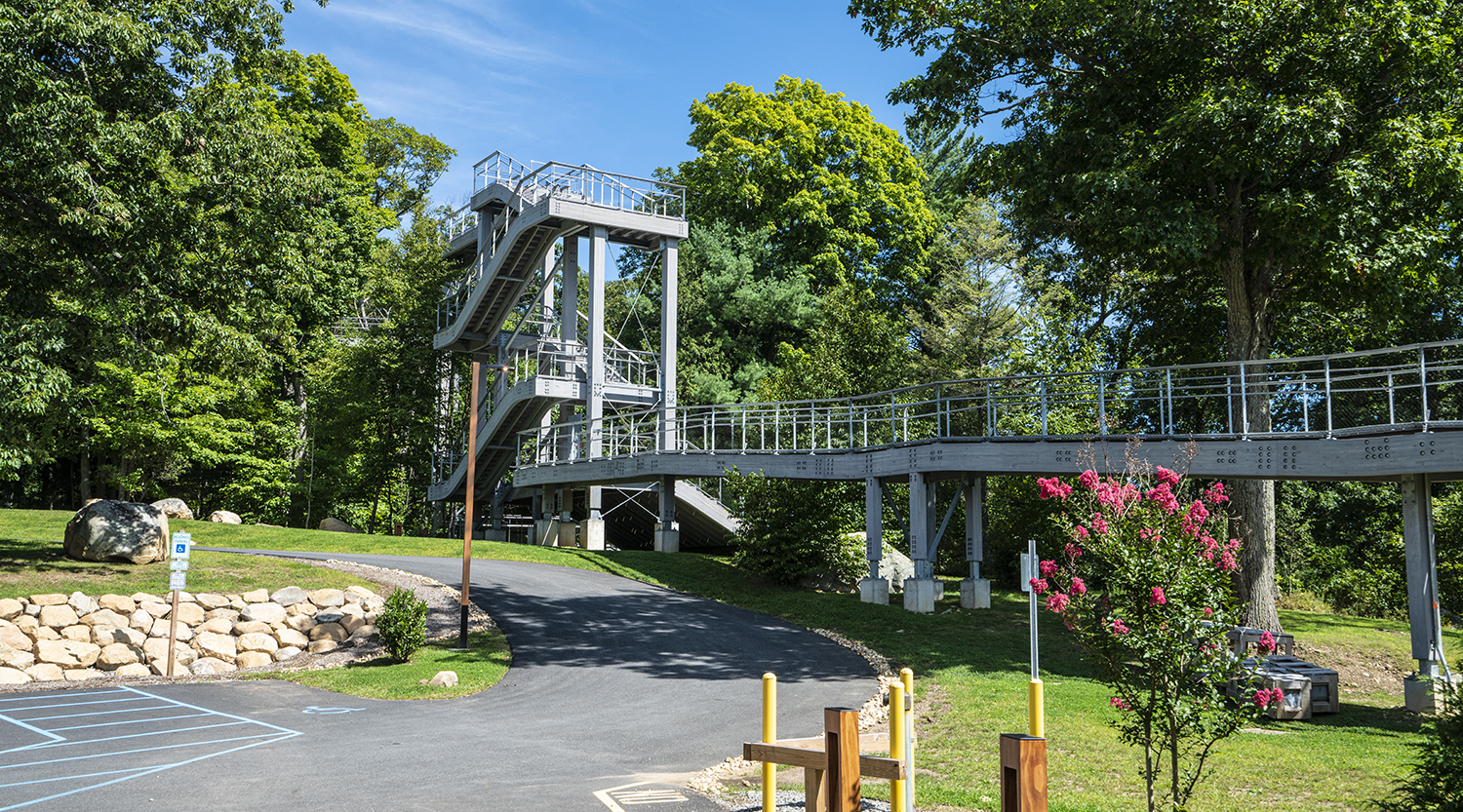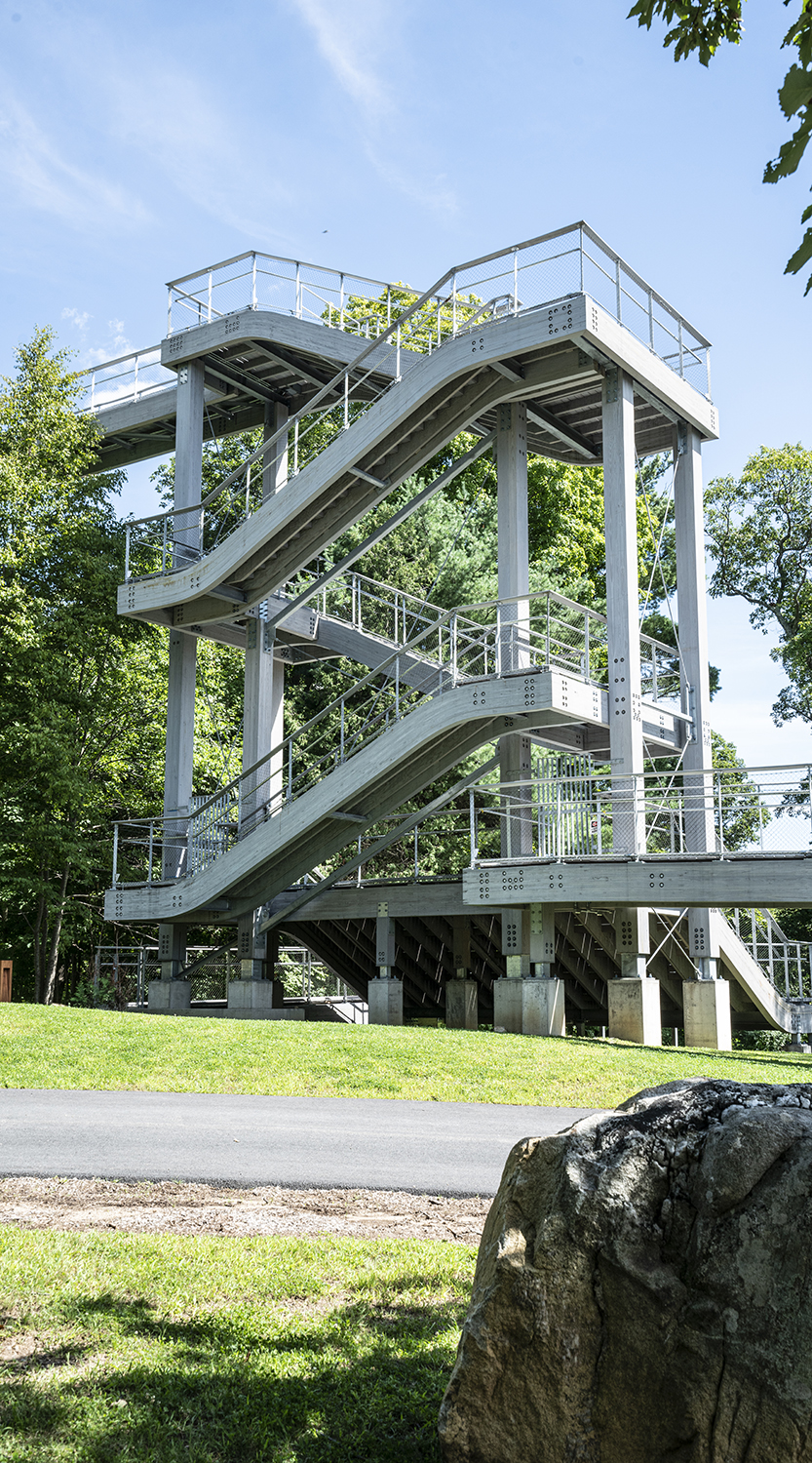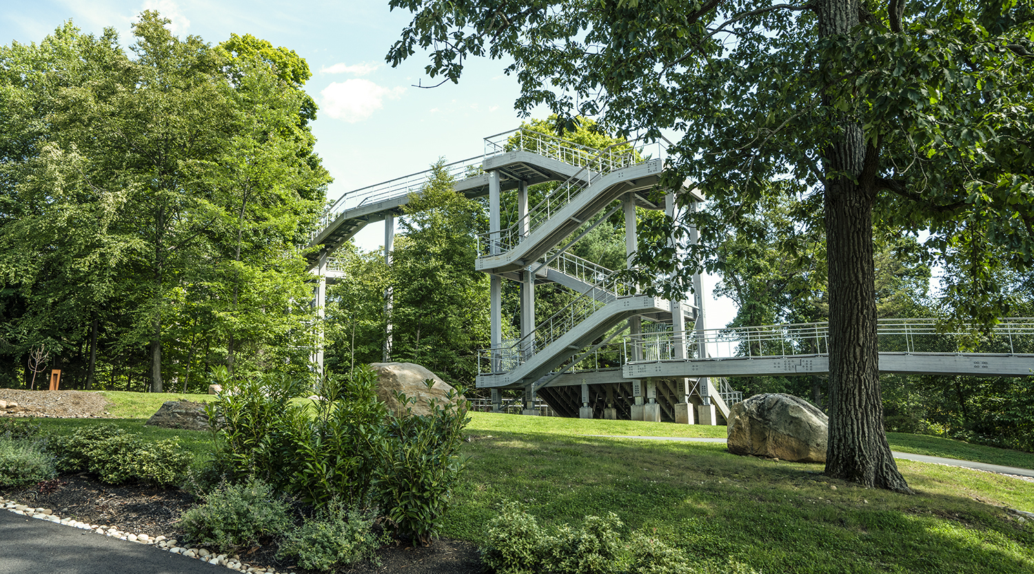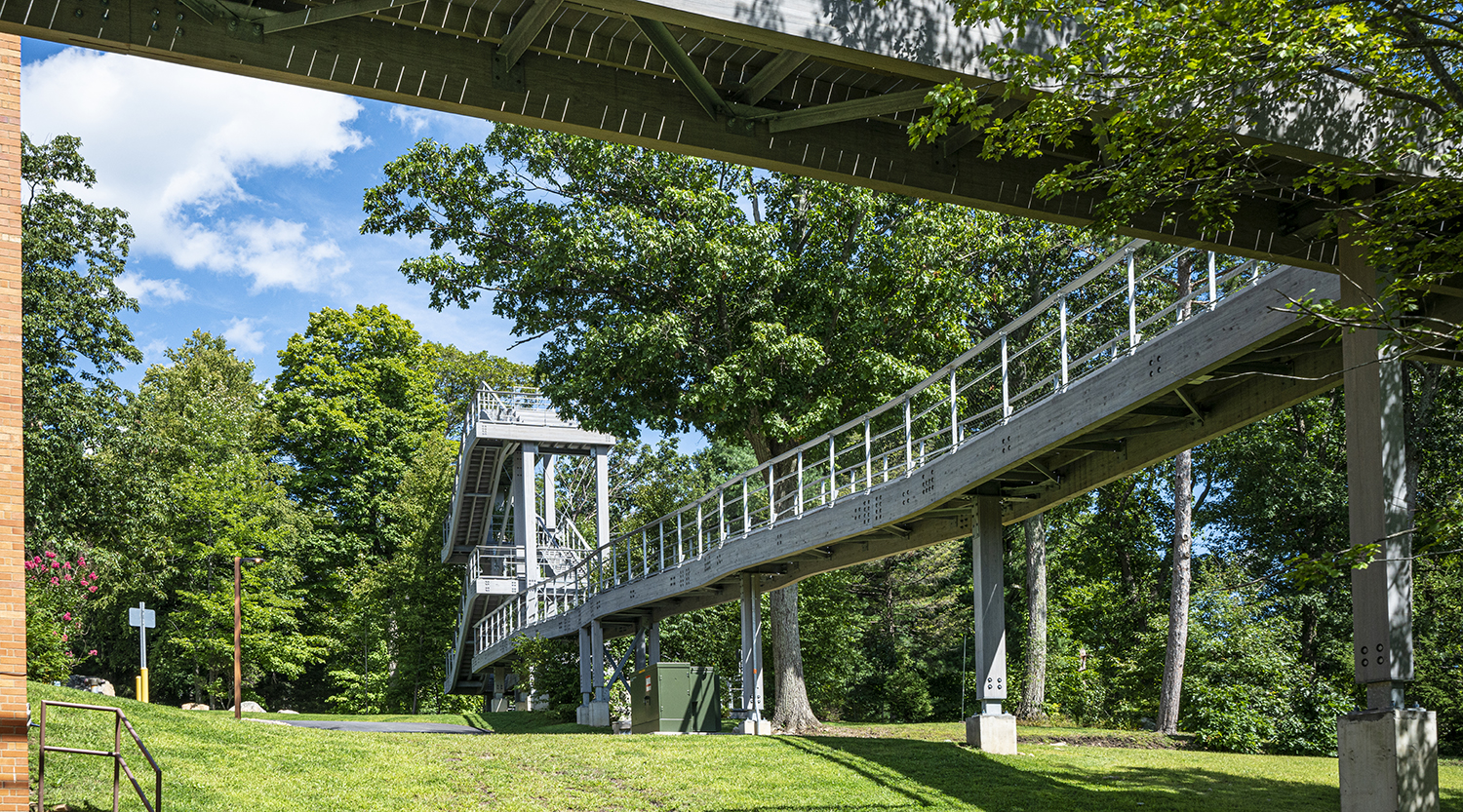 The core of the elevated structure is a three-story tall “tree house” which provides “classrooms” in the guise of outdoor lecture areas. While the structure also uses steel as a structural component, the dominant experience of a student or other visitor is molded by the extensive use of exposed glue-laminated timbers and wood flooring materials, in harmony with the stunning views and forest setting. It is fitting that the “forest bathing” experience this structure strives to provide is also made possible by natural timber materials, rather than by other, less environmentally friendly materials. In addition to the congruence between the structure’s timber materials and the educational uses of the structure, the choice of wood as the dominant aesthetic and structural material also allowed the tree house and connecting walkways to come in on budget, something that a more traditional concrete or steel structure would not have permitted.
