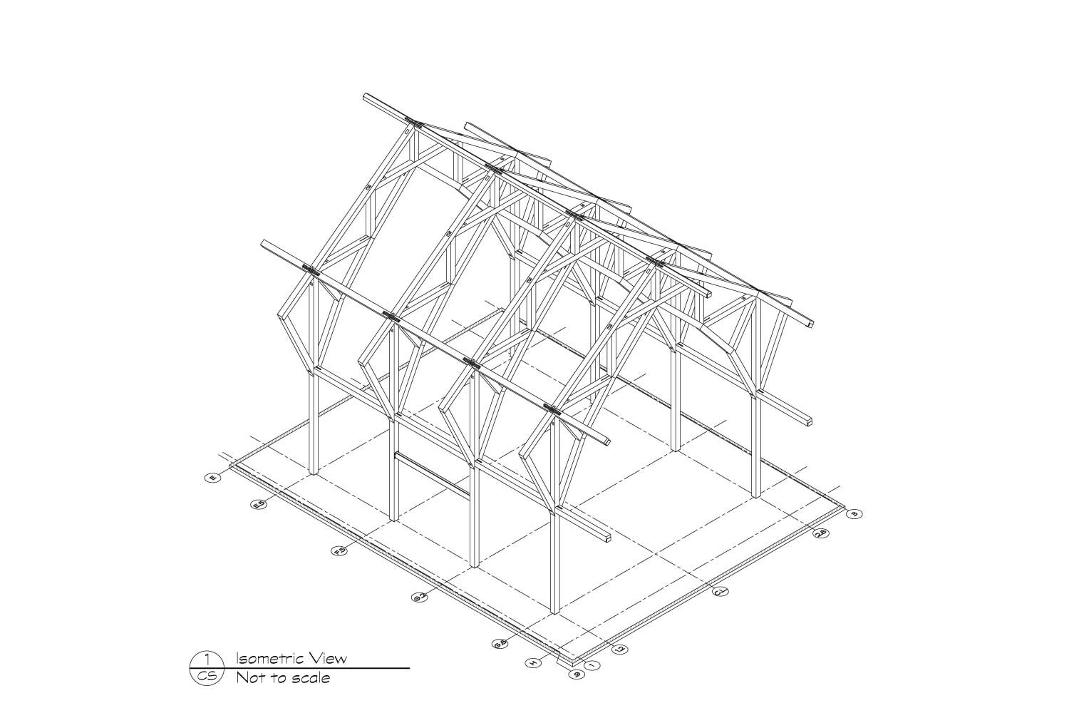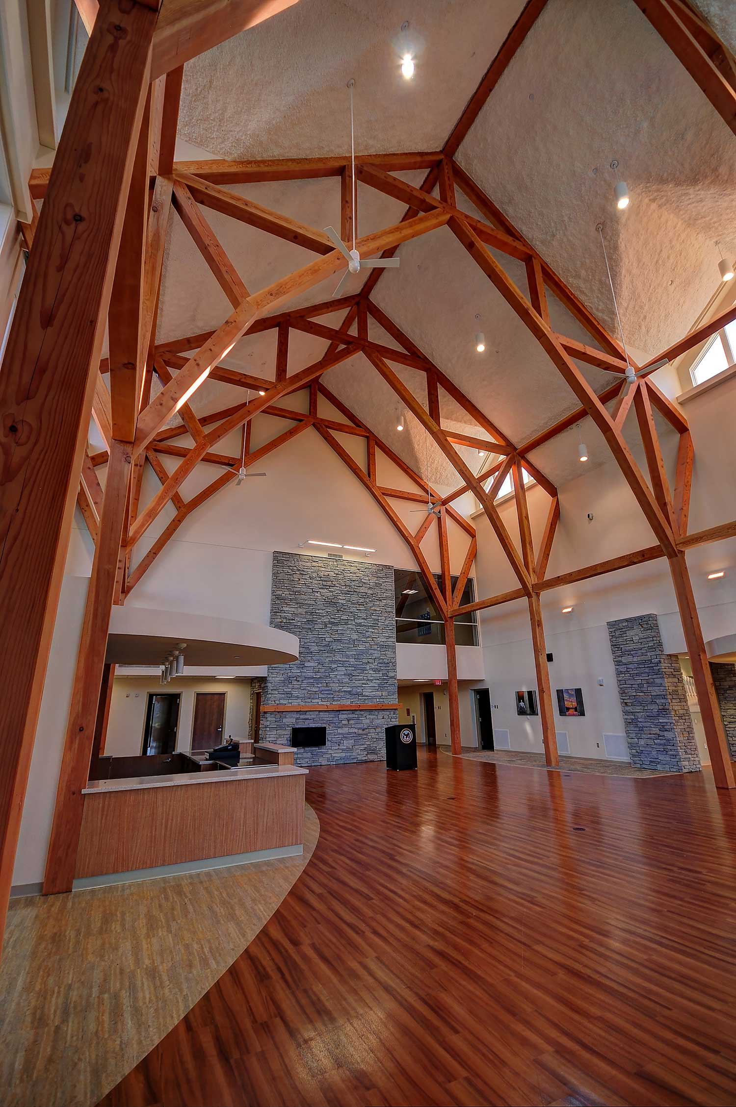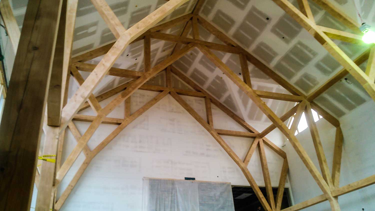 The timber frame occupies a space approximately 45’ wide by 60’ long and 45’ in height. Somewhat atypically, the main posts land well inboard of the perimeter walls. Every timber member measures a nominal 10” x 10”. Although the timber frame is designed to handle gravity loads only, under normal loading conditions, significant tension loads arise in a number of the timber to timber connections.