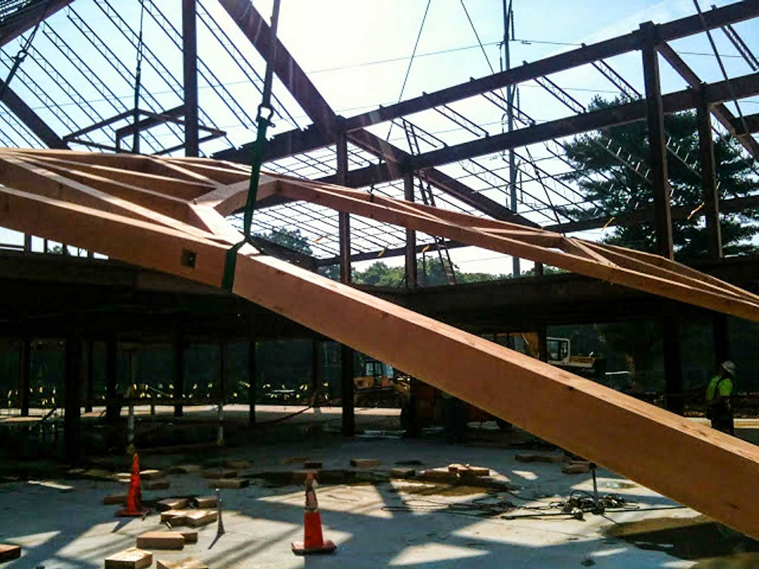 These loads could easily have been handled with through-bolted, surface-applied steel gusset plates. The driving aesthetic consideration, however, was the preservation of the clean, uninterrupted, and consistently weighted lines of the timber members. Applying hardware to the exterior faces of the timbers would have created a visually distracting surface, and would have evoked a more utilitarian design idiom. Instead, concealed fasteners to handle the design loads were custom-designed and fabricated.
