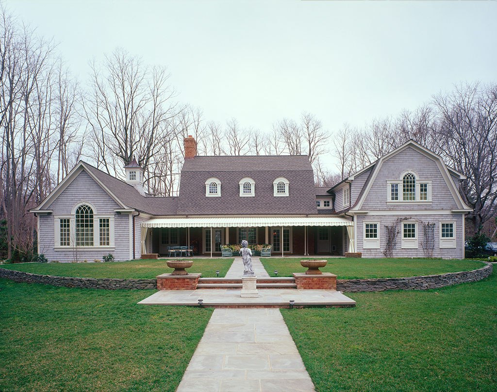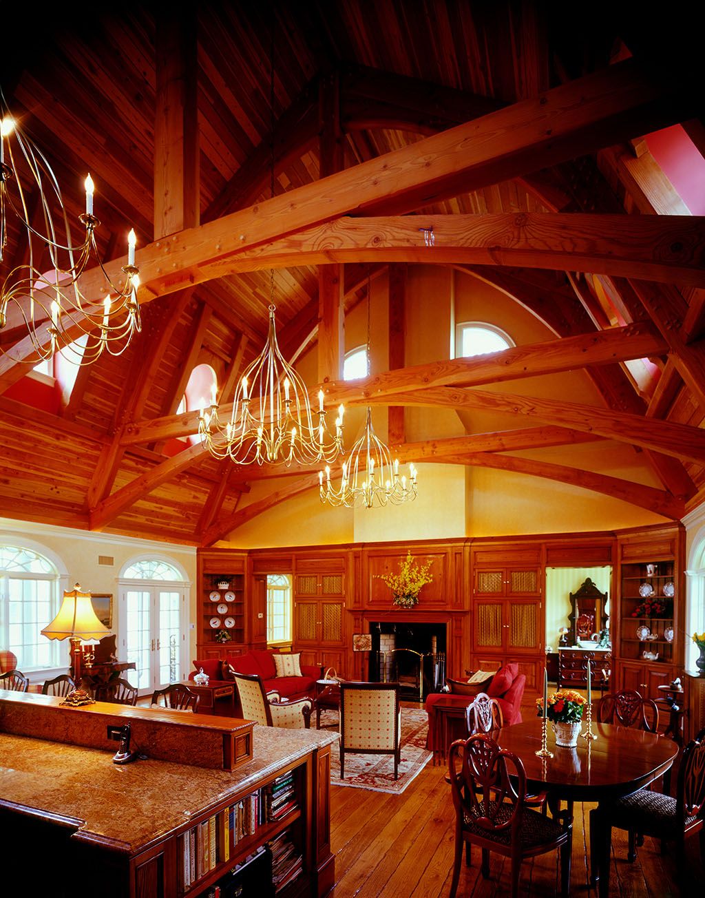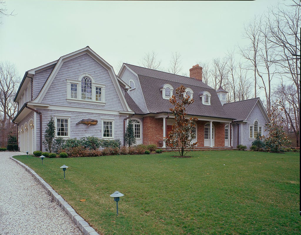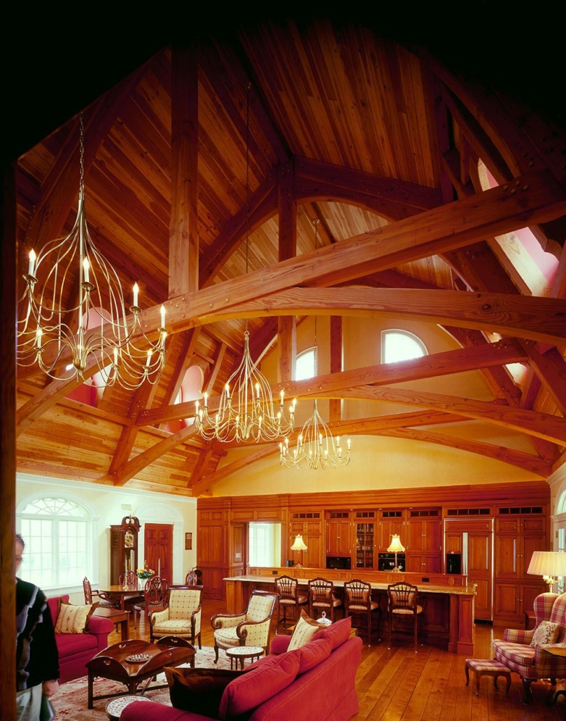 The exterior aspect of this Long Island, New York residence does nothing to reveal the timber frame inside. The central section of this house has a timber frame structure using gambrel trusses. Not so unusual in and of itself, the trusses use a kingpost and raised lower chord, with gussets softening the angles between the lower and upper rafters, and long curved braces from the rafter ends to the middle of the raised chord. The braces taper from about 8 inches at the rafter end to around 6 inches where they connect to the chord. The trusses at the ends of the space are set back about 2 feet from the end walls, with the purlins running into the conventionally framed walls.