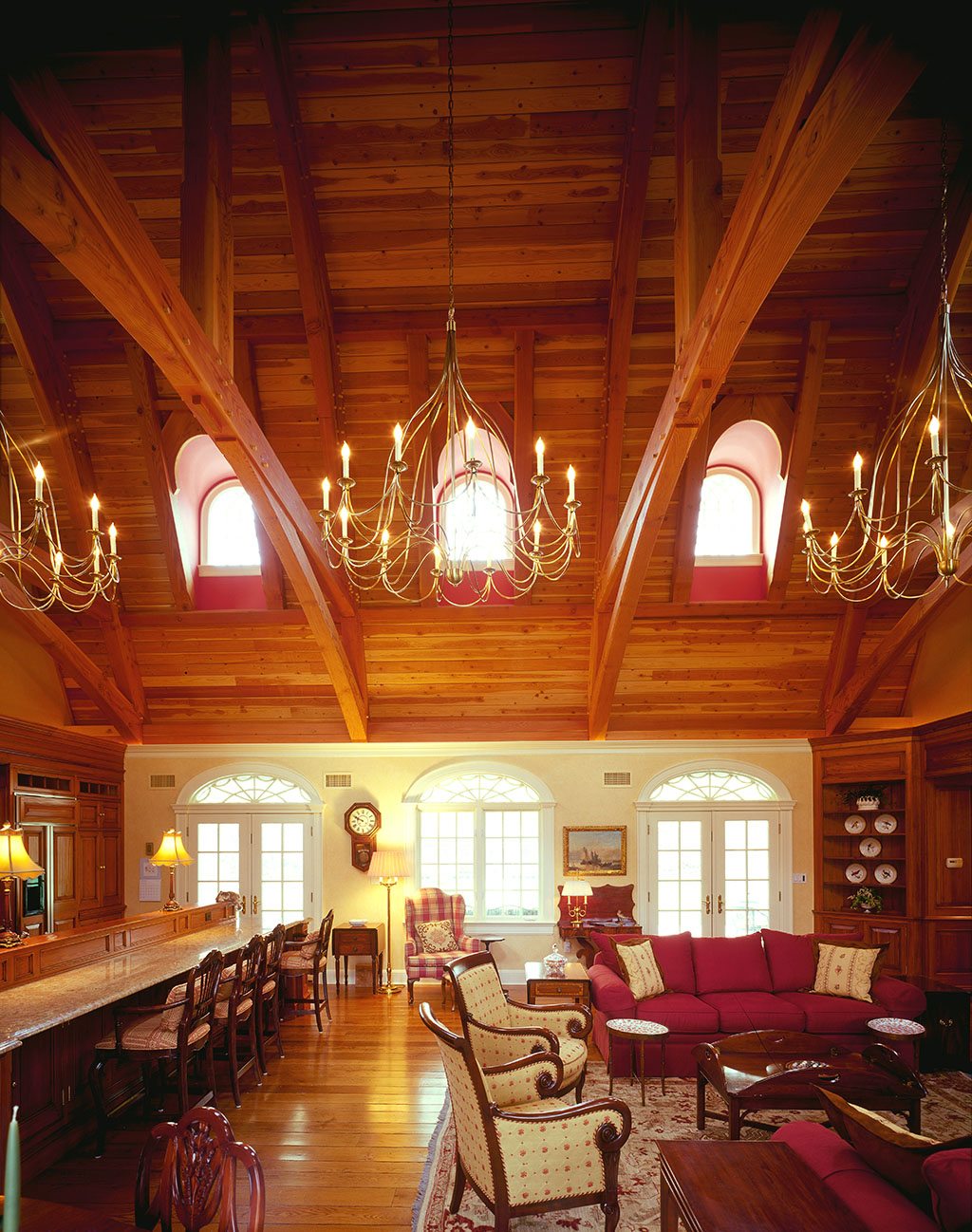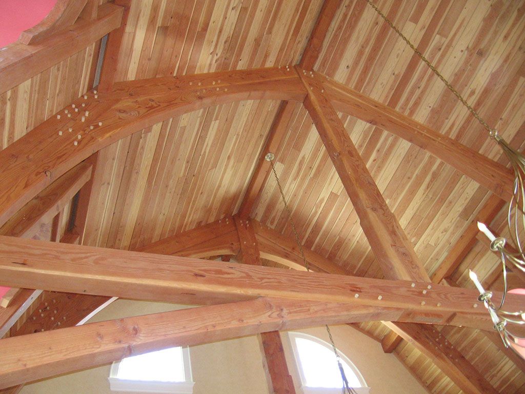 The tongue and groove ceiling boards are of Douglas fir to match the timbers and are not V-grooved on their faces. The appearance is less linear, while the variegated ceiling board grain contrasts with the much more consistent color of the timbers.