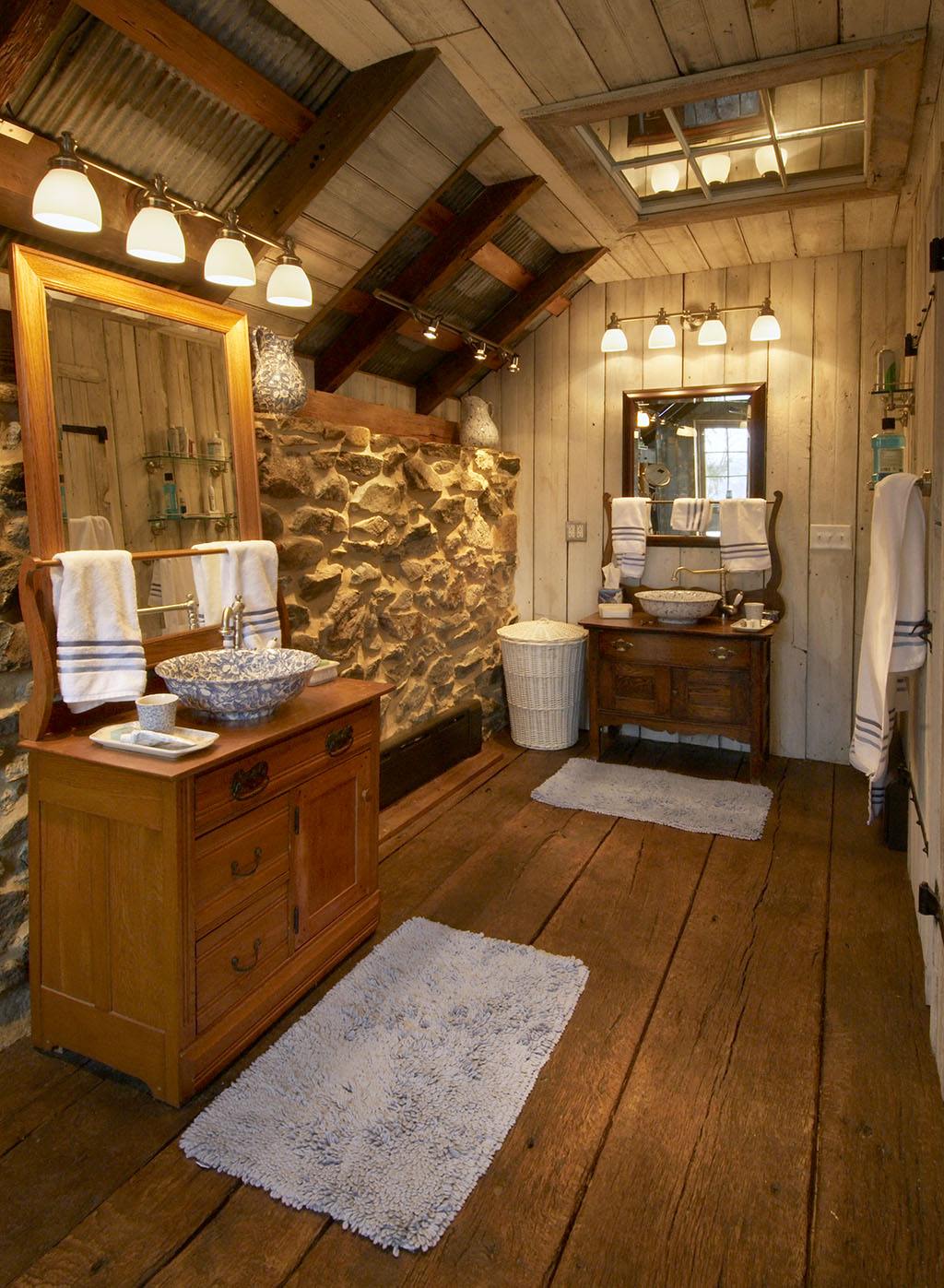 The ceilings in the second floor of the original barn are corrugated iron roofing, with insulation and another layer of metal roofing on top. Ceilings in the addition are of reclaimed tongue & groove boards, again with a metal roof to match the original barn structure. On the title photo at left, note the hot tub sunk to floor level on the exterior deck. The addition timbers are rough-sawn oak.