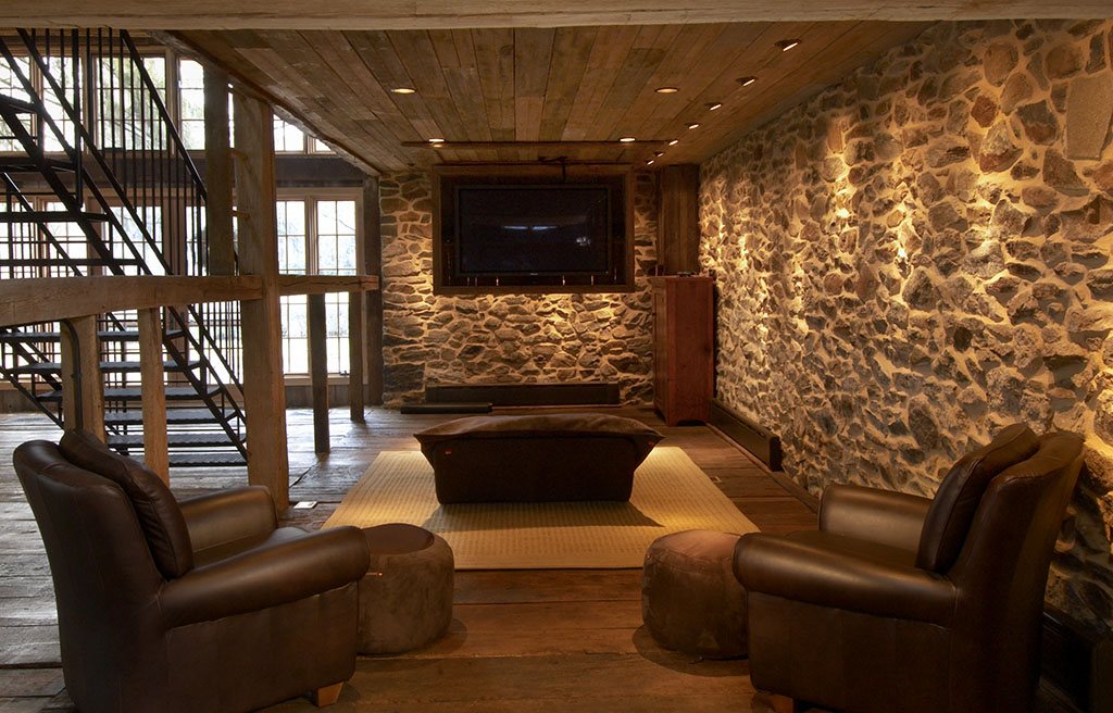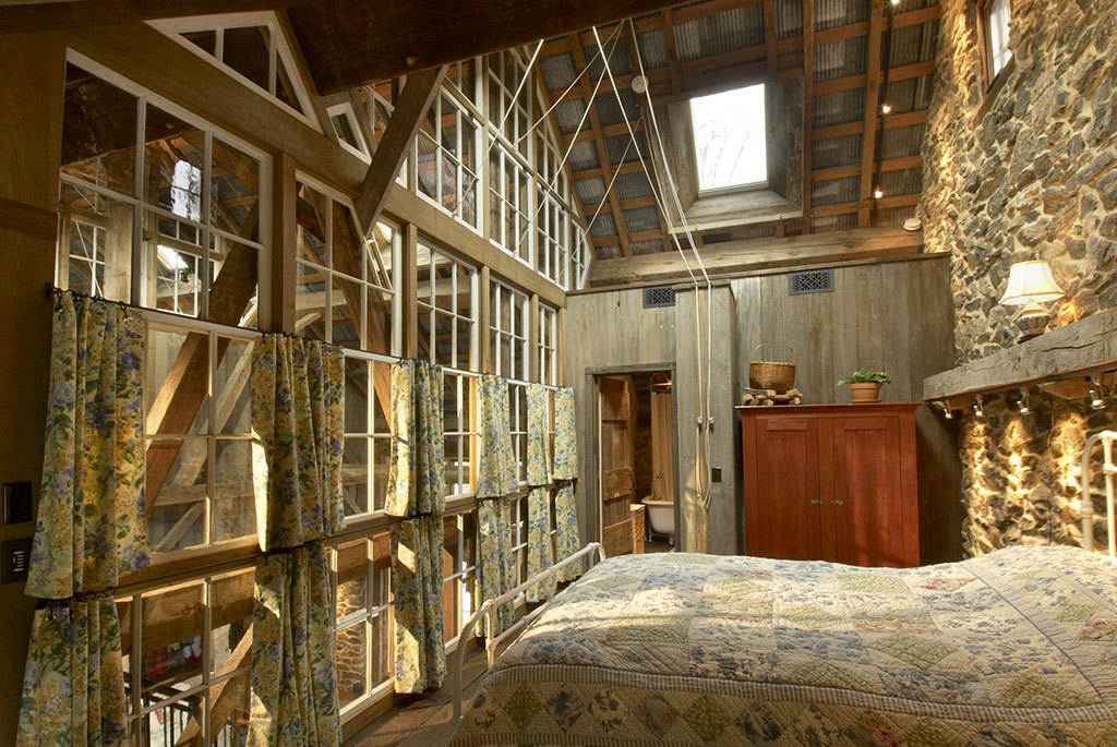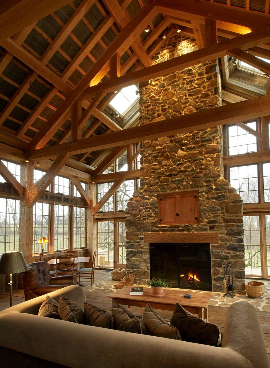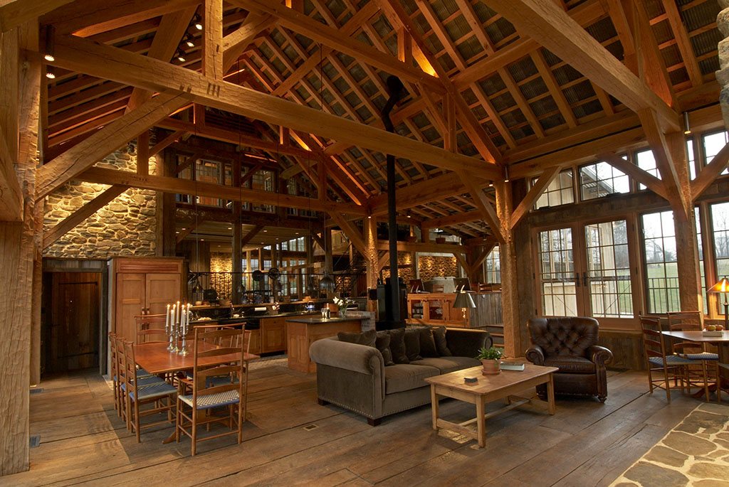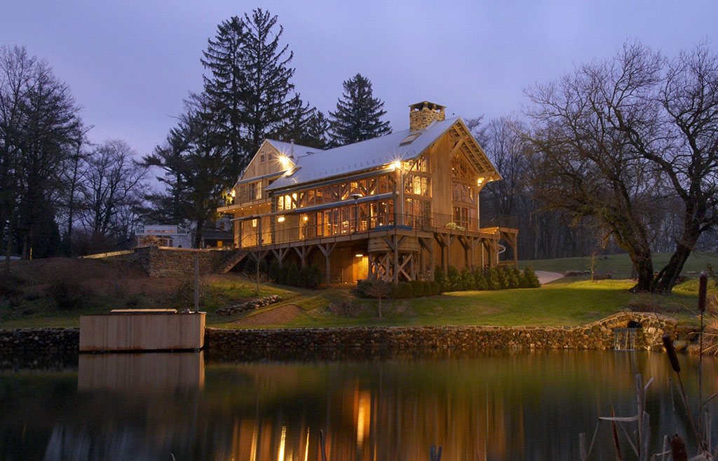 A traditional 19th century Pennsylvania barn was the nucleus of this rehab and addition project for a Chester County, Pennsylvania family. The original barn was renovated and converted to provide personal spaces, and a barn-inspired timber frame structure added on at right angles to the barn. The addition has a view of the pond, and houses all the common spaces of the home – living and dining rooms, kitchen, and even a large area with a swing hanging from the rafters. Atypically, the walls of the addition are almost all glass, immeasurably brightening the interior.