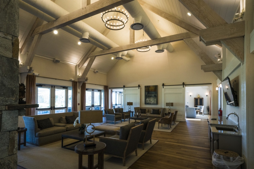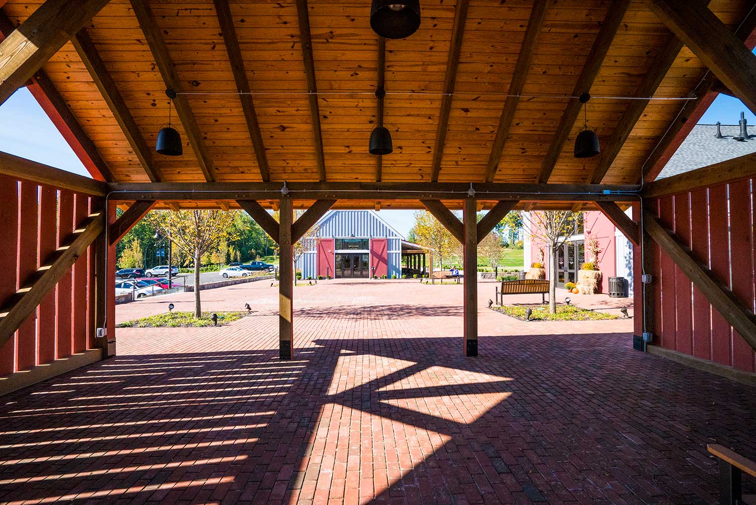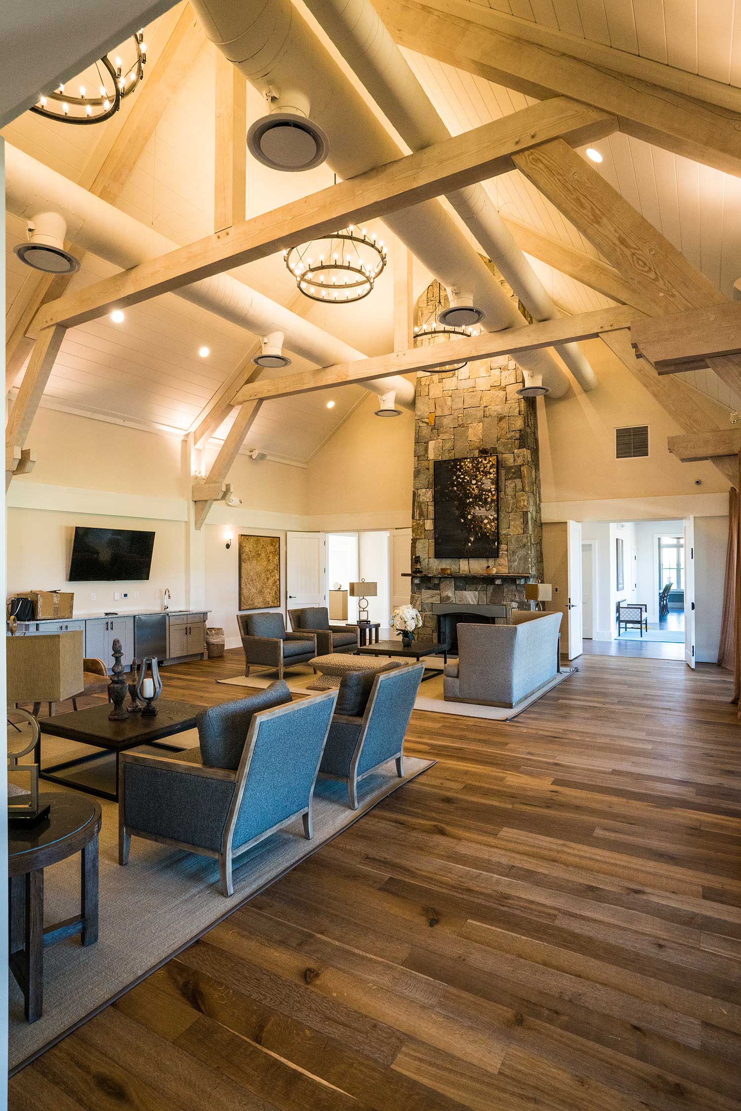 When clients and their architects and planners involved in the creation of such communities are sensitive to a targeted use of materials, opportunities for the use of heavy timbers seem to quite naturally multiply. The Potomac Shores Recreation Center is comprised of four separate structures, each with some heavy timber construction: The main Recreation Barn, and adjacent Social Barn and Market Pavilion, and a Pool Pavilion at a small remove from these three buildings.