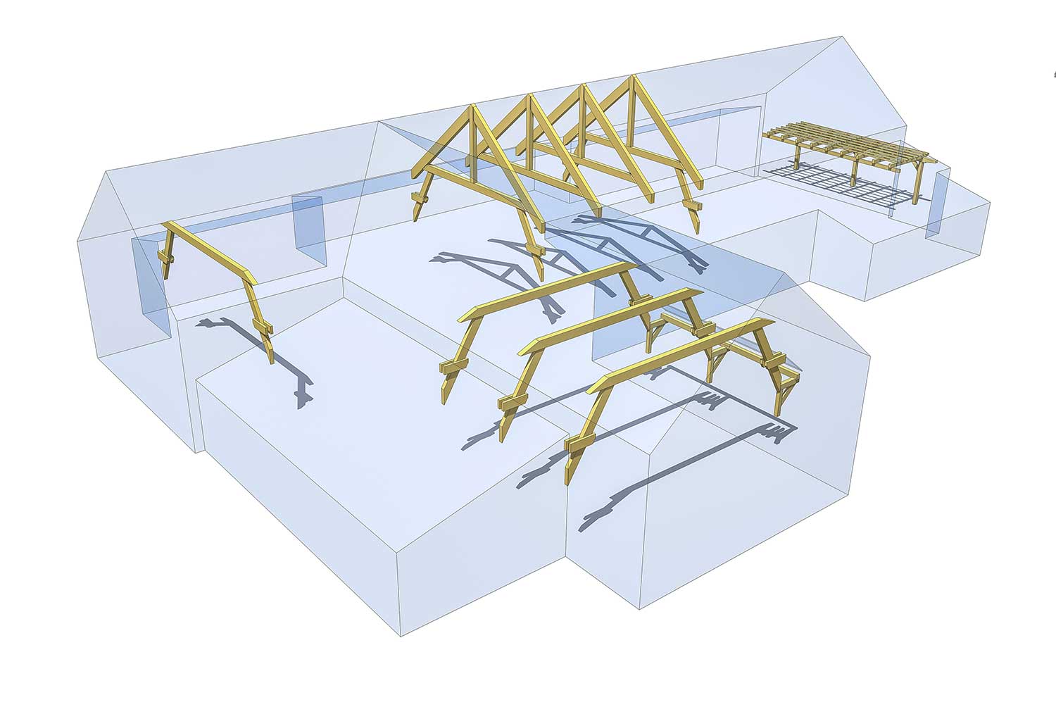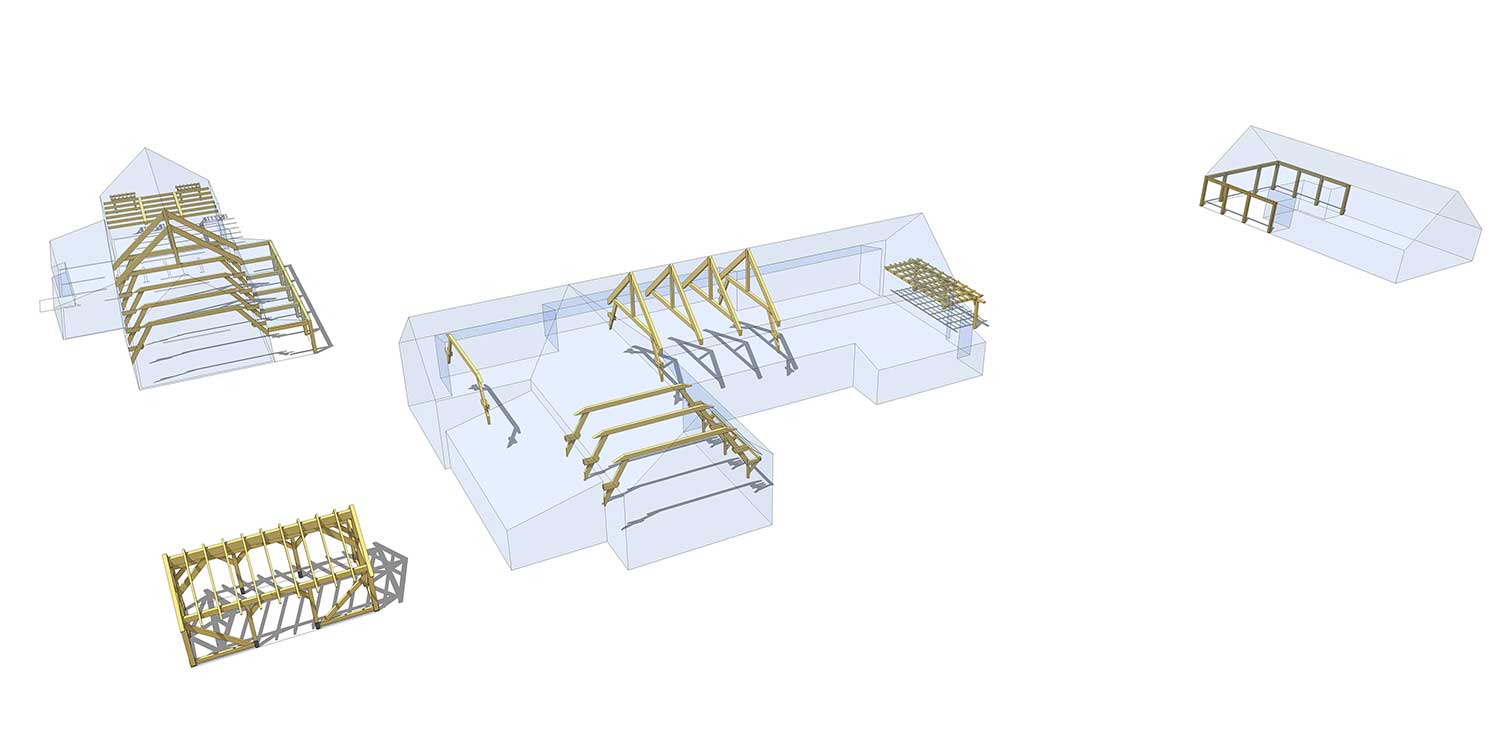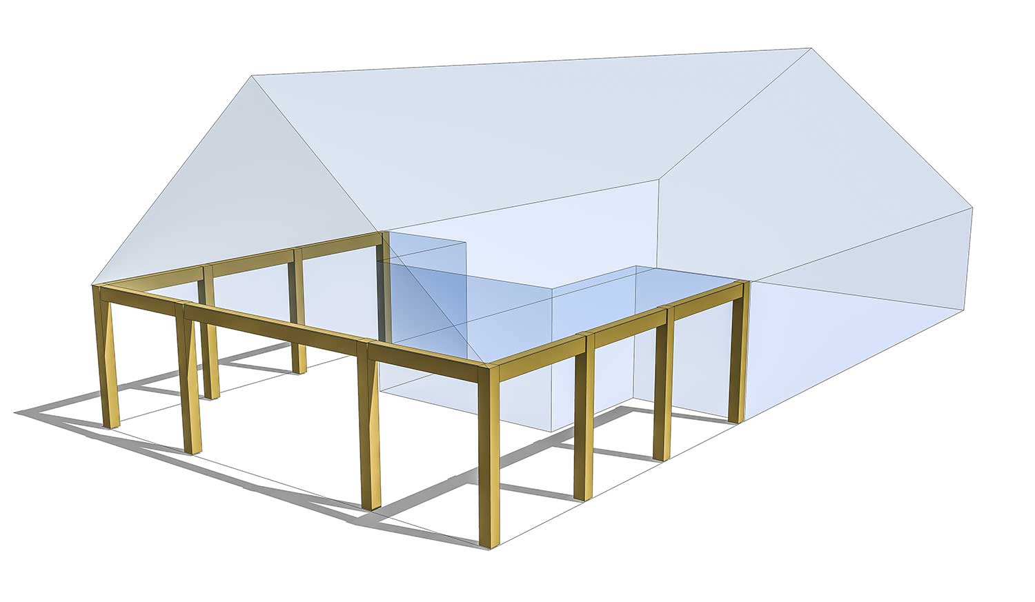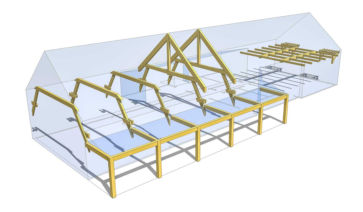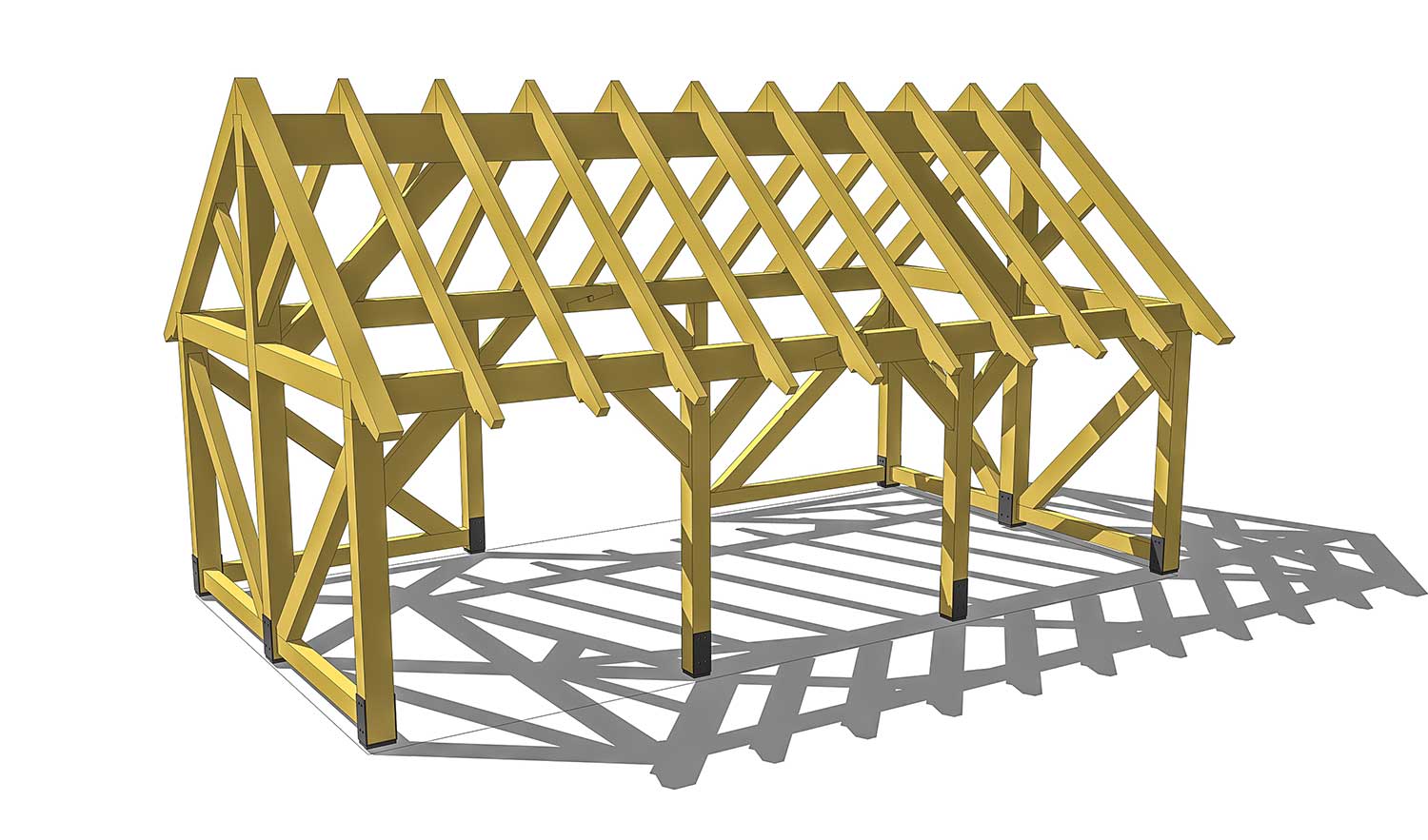 Of the four structures, the Market Pavilion is the only one that might be called a “pure” timber frame: there is no hybridization of construction methods, and wherever possible, only traditional joinery was used. This notwithstanding, it was necessary to design a post foot connection that would not only resist the wind uplift, but also provide a stout moment connection to aid in lateral load resistance. This connection ended up being a custom-fabricated steel saddle that was directly anchored in the foundation masonry.