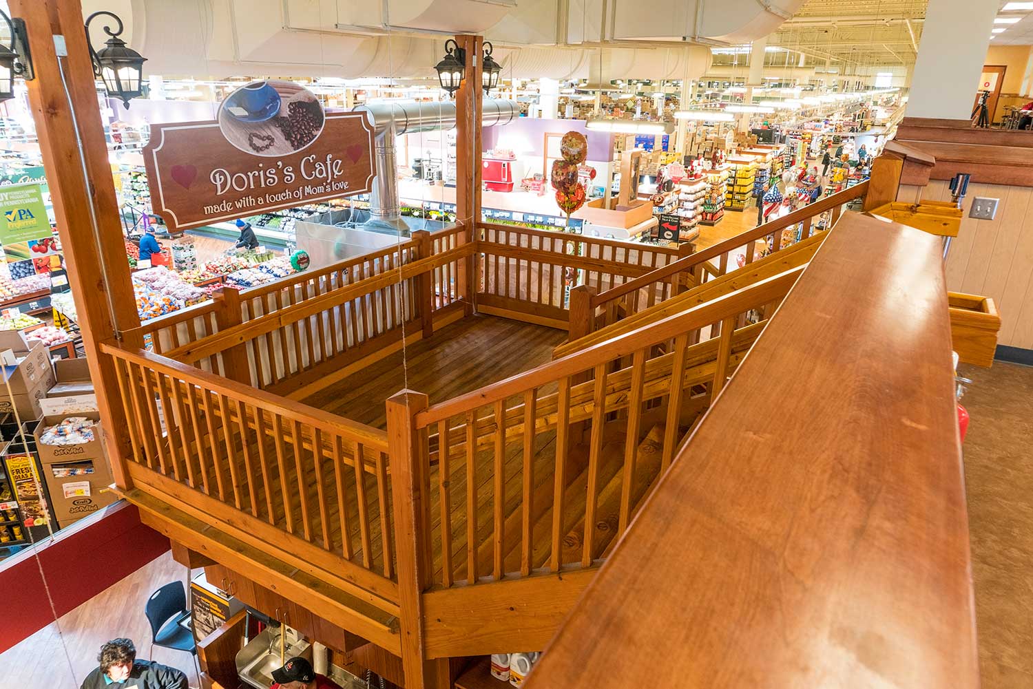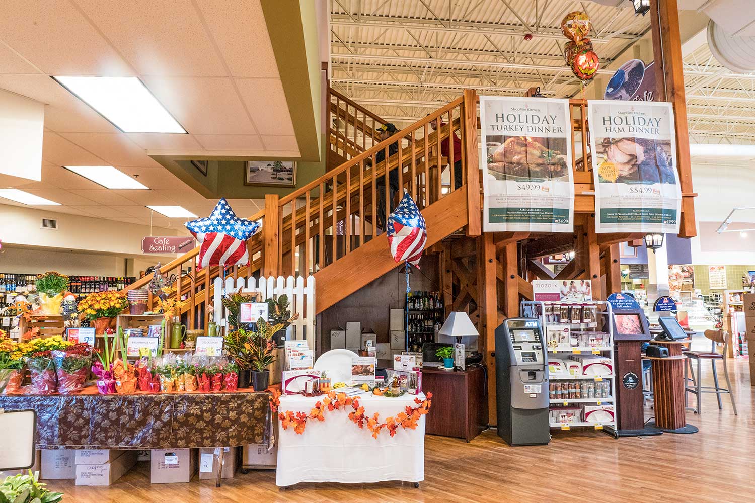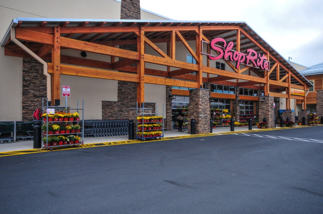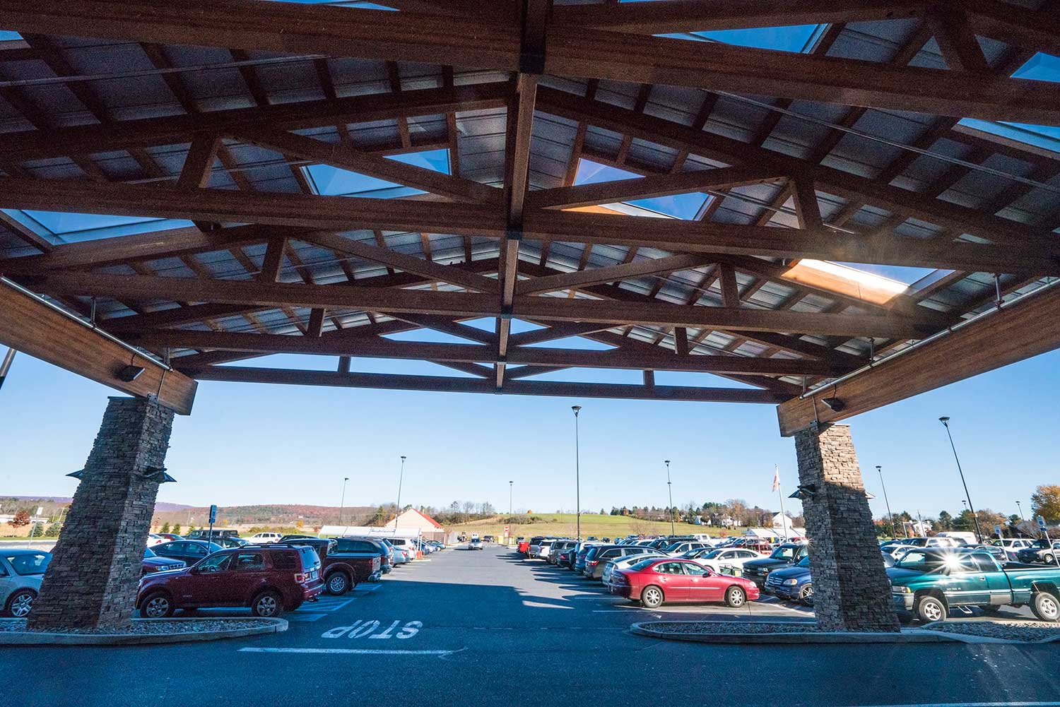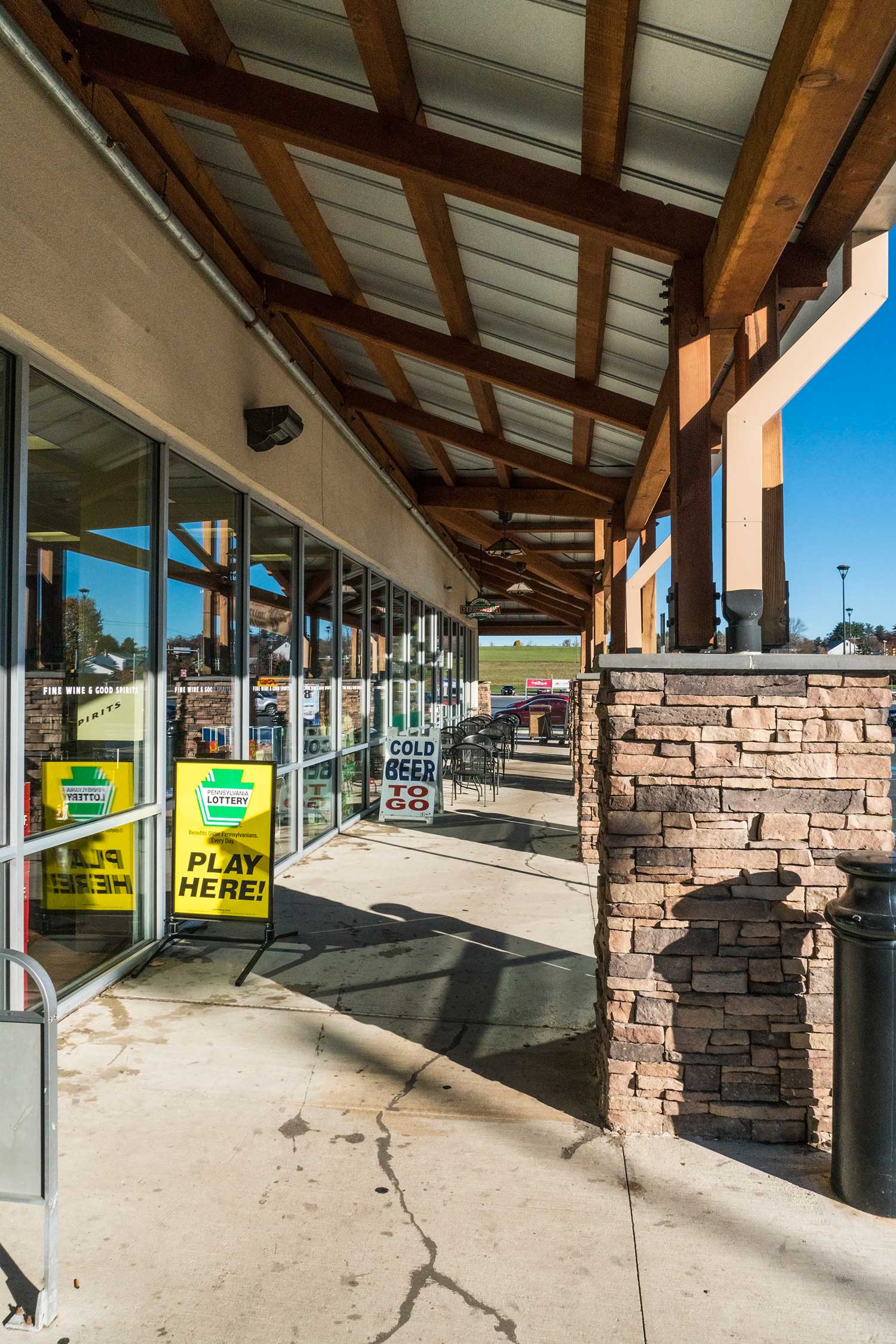 This new store doubled the size of the previous one. Lancaster County Timber Frames’ involvement included seven exterior timber framed canopies and an interior timber framed stair case. Over 700 Douglas fir timbers, totaling 42,000 board feet were used for the canopies. Additionally, the staircase totaled 3,500 board feet and had a timber count of 250 pieces. The handrails are not included in these figures as they were handled by others.