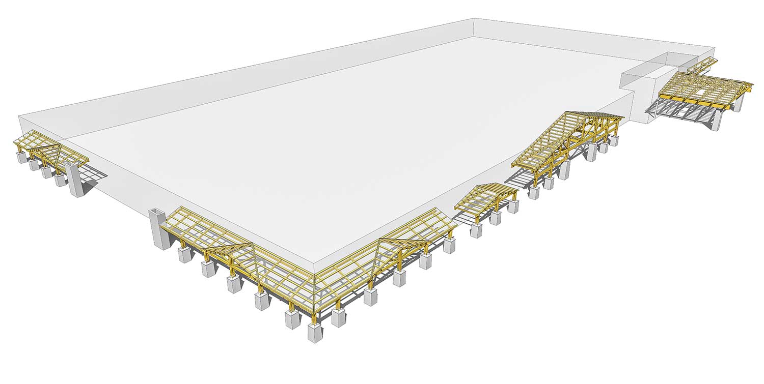 The most difficult issue that surfaced on this project occurred at a corner, at the height at which two of our roof structures converged to form a hip. At that height the newly constructed wall formed a corner that was 5 degrees short of 90. As our joinery and roof system was laid out and cut at our shop predicated on the corner, in fact, being 90 degrees, we had a full additional day’s work to sort out and correct the issue. As is typical for us, we had gone to the site to verify measurements several weeks before our installation. We took copious measurements on the building to which our frame would attach; but we neglected to check the corner angle at the height of convergence.