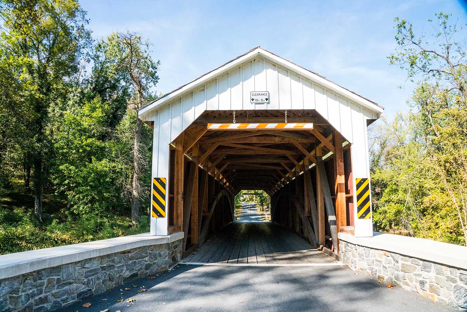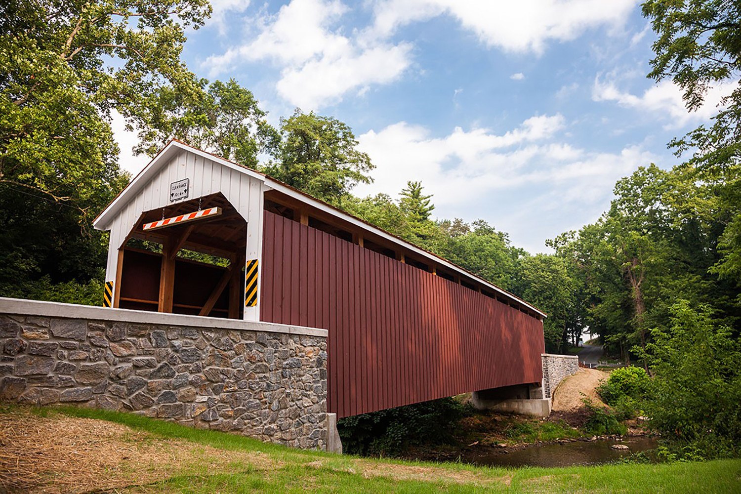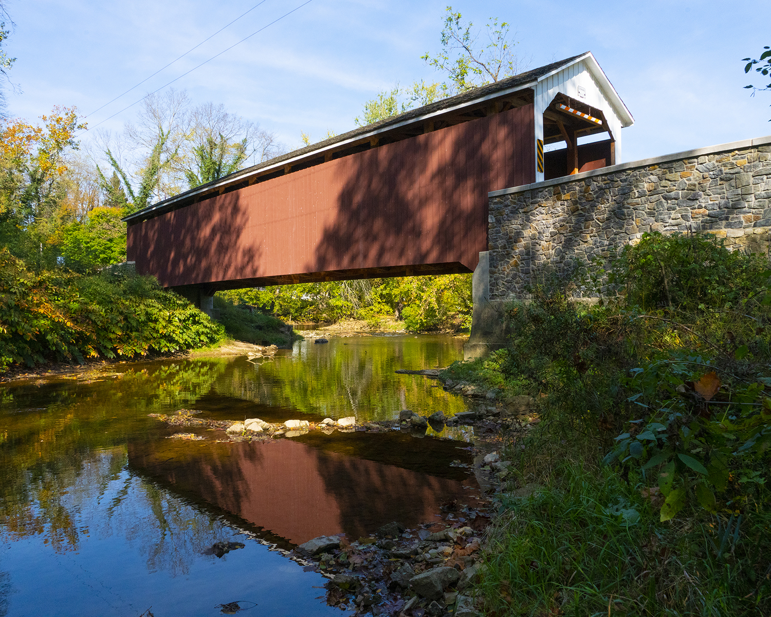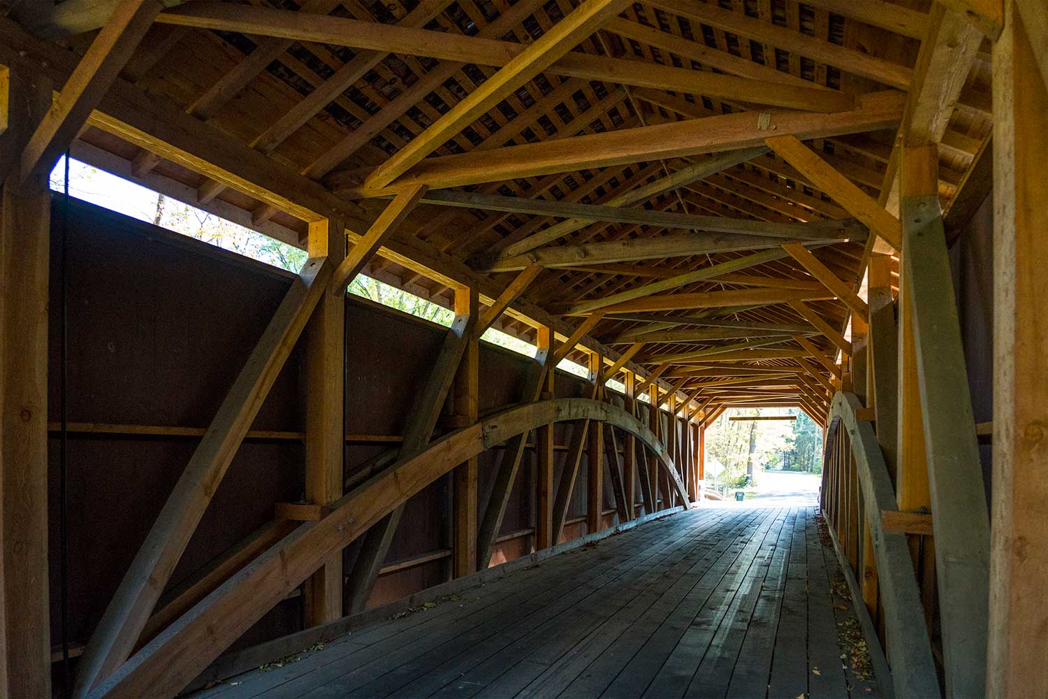 After the decision was made to rebuild the bridge and when funding was in place, Lancaster County Timber Frames removed the roofing, siding, and flooring, and dismantled the bridge timber by timber and shipped the salvageable pieces to its shop. Thirty of the original timbers were saved and 365 new raw timbers ordered. Many of the salvaged timbers were used in their original position on the bridge. Some were subjected to reductions, usually in length, to eliminate rot or damage and were employed in a different manner or location. Lancaster County Timber Frames carved the re-born bridge at its shop and assembled it at the site along the banks of Chique’s Creek, where it had sat after having been lifted out of the water nearly eighteen months earlier.