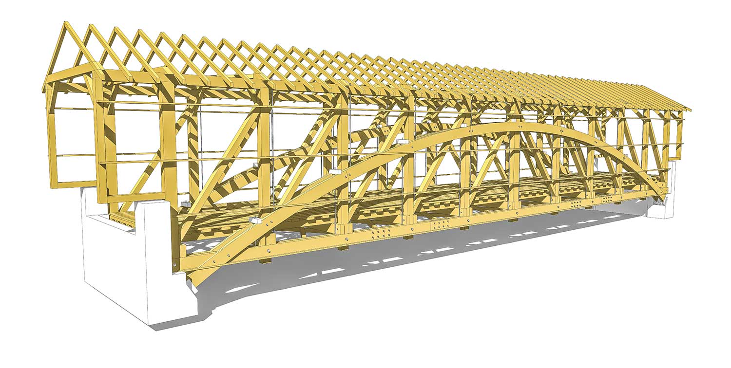 In May 2013, a 300 ton crane positioned the bridge on its new foundation, which had been elevated by two feet from the original level. As with the original, the bridge is sheathed with pine boards and battens and roofed with cedar shakes. The timbers are rough-sawn Douglas fir.