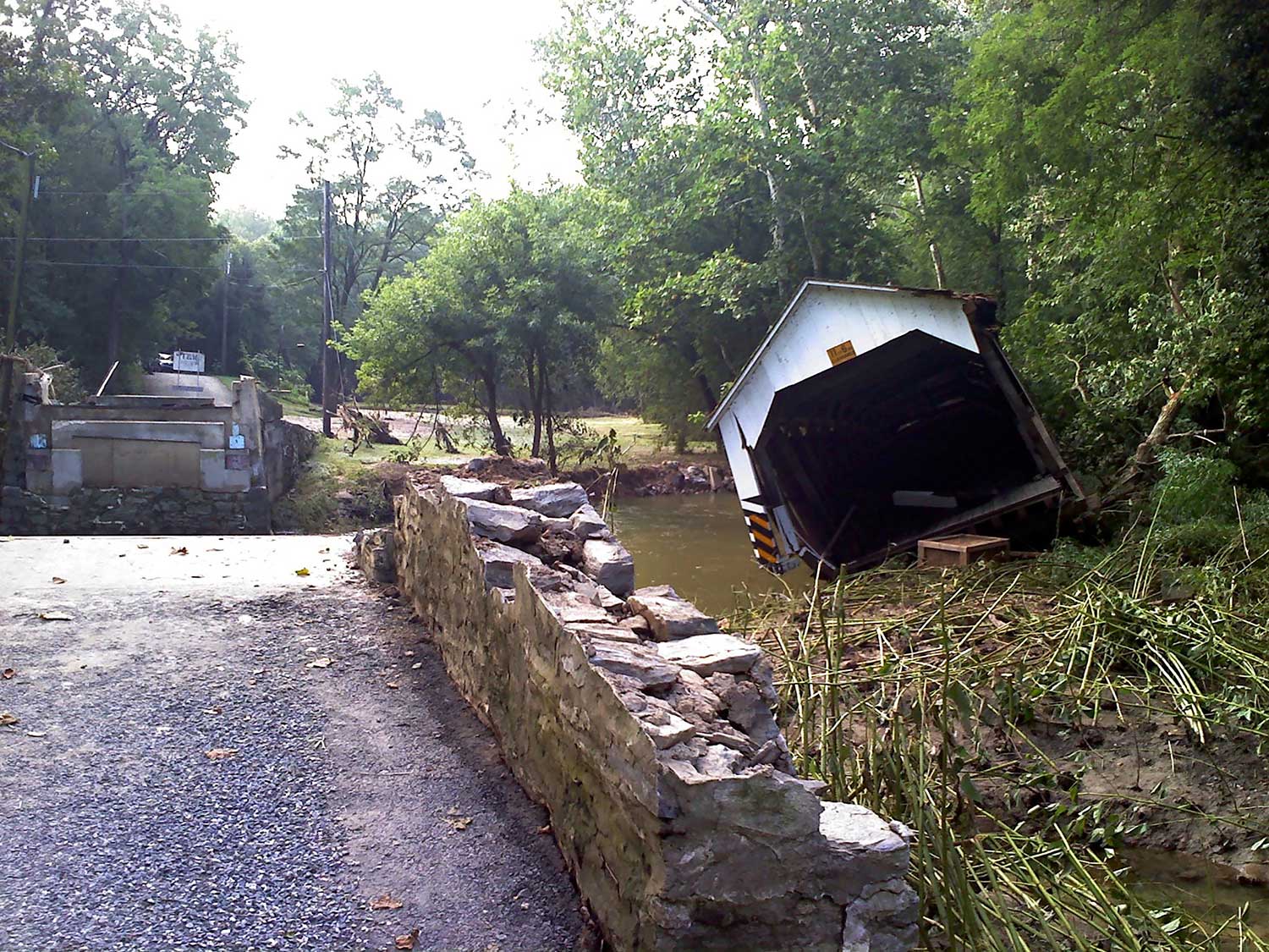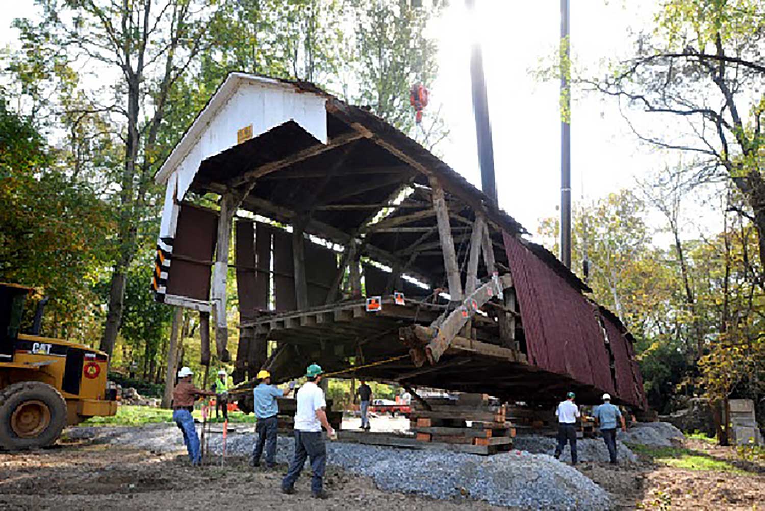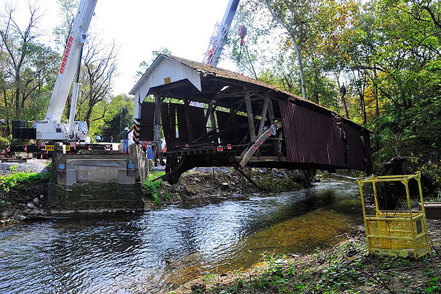 The Siegrist Mill Covered Bridge, a 100 foot free span Burr Arch Truss structure, was, prior to being damaged, a regularly traveled one-lane bridge. It was lifted off its foundation in September 2011 by high waters from tropical storm Lee. Its movement downstream was halted by the upturned root system of a large sycamore tree. Using two large cranes, the bridge was hoisted from the creek and set on dry land. There it would sit until the decision was made whether or not to reconstruct the bridge.