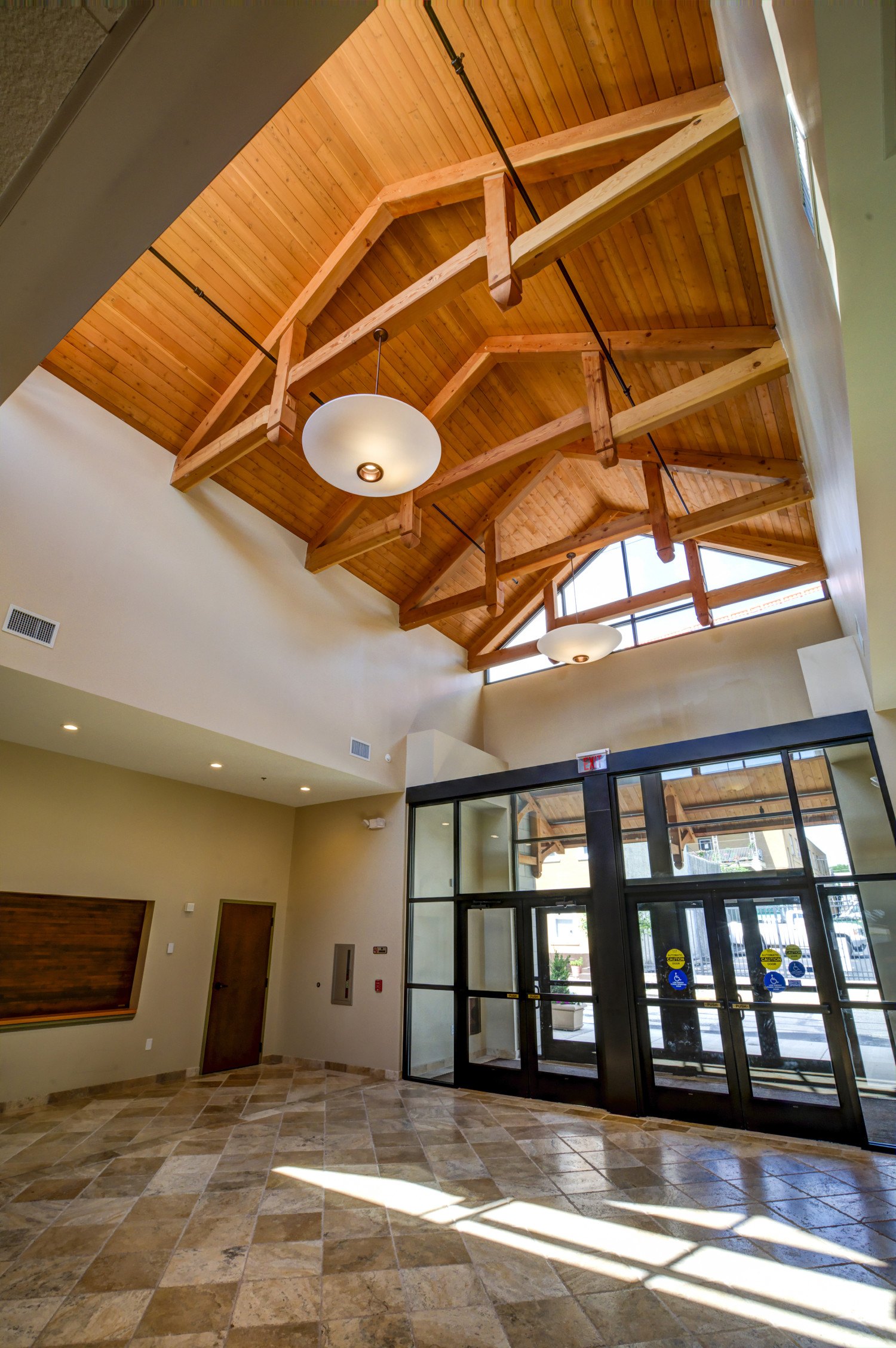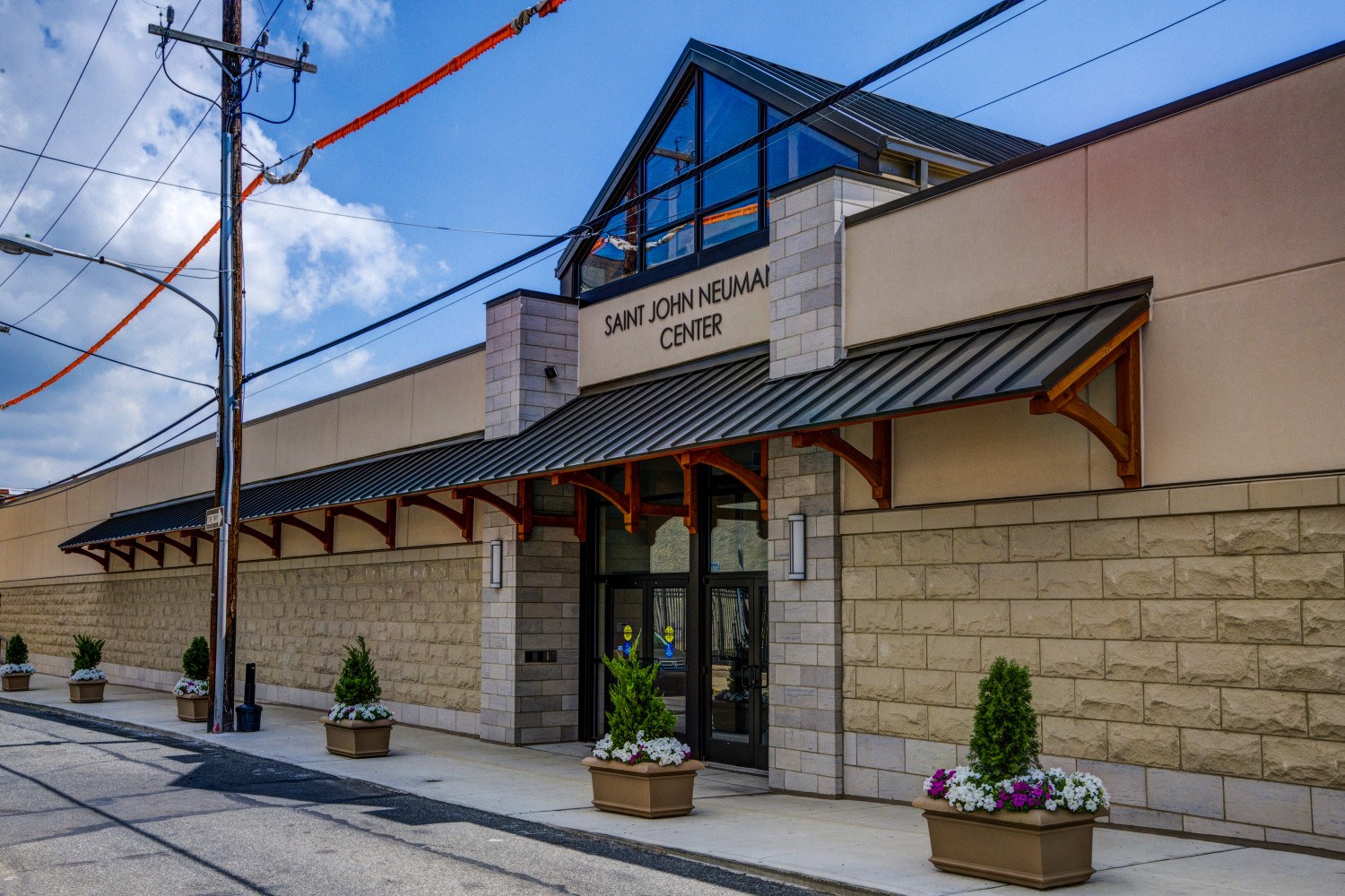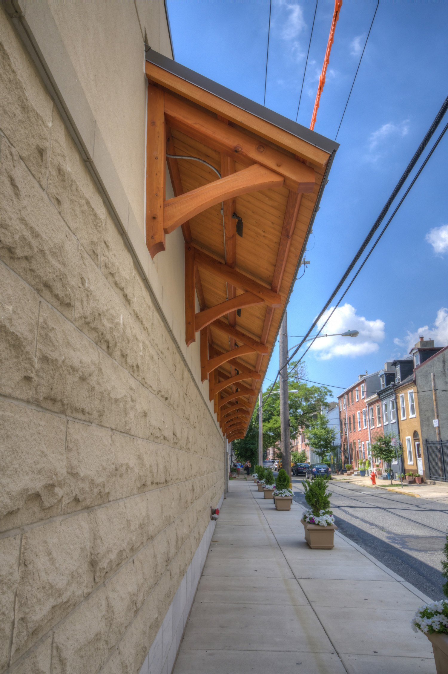 To the rear of St. Peter the Apostle Church and the Shrine of St. John Neumann, and across a narrow city street, sat a long and narrow flat-roofed brick building that the parish had been using for storage. When the design work for the atrium was winding down, the parish proceeded with plans to convert the warehouse into a community center and library for the St. John Neumann archives. Lancaster County Timber Frame’s work consisted of a timber-framed truss system for the lobby and a 100-foot-long bracketed-brace pent roof for the exterior.