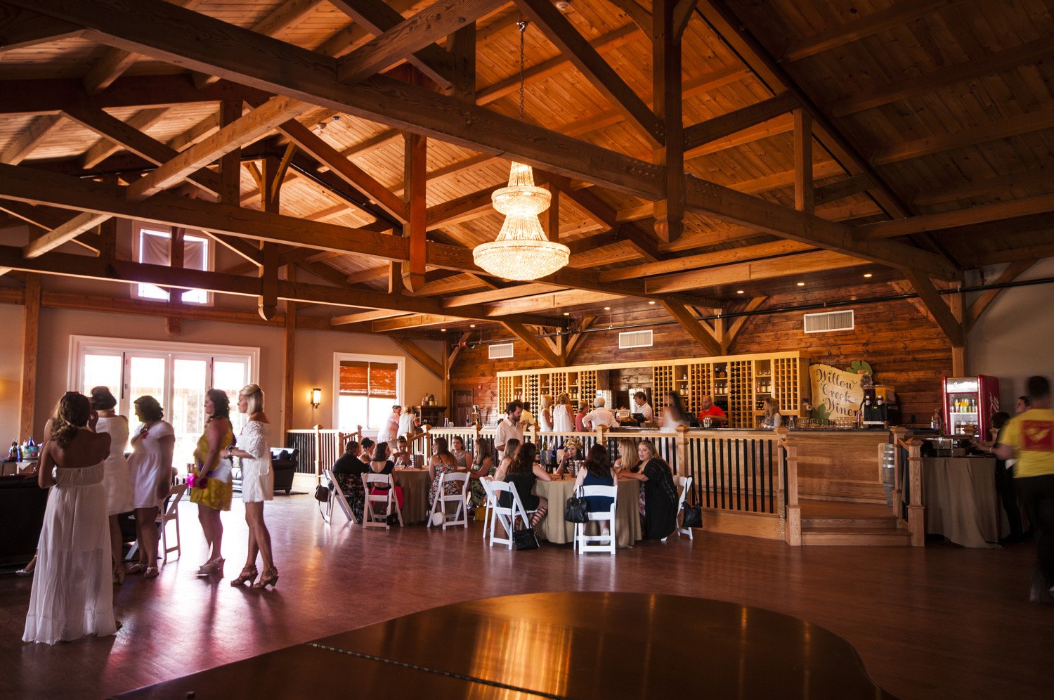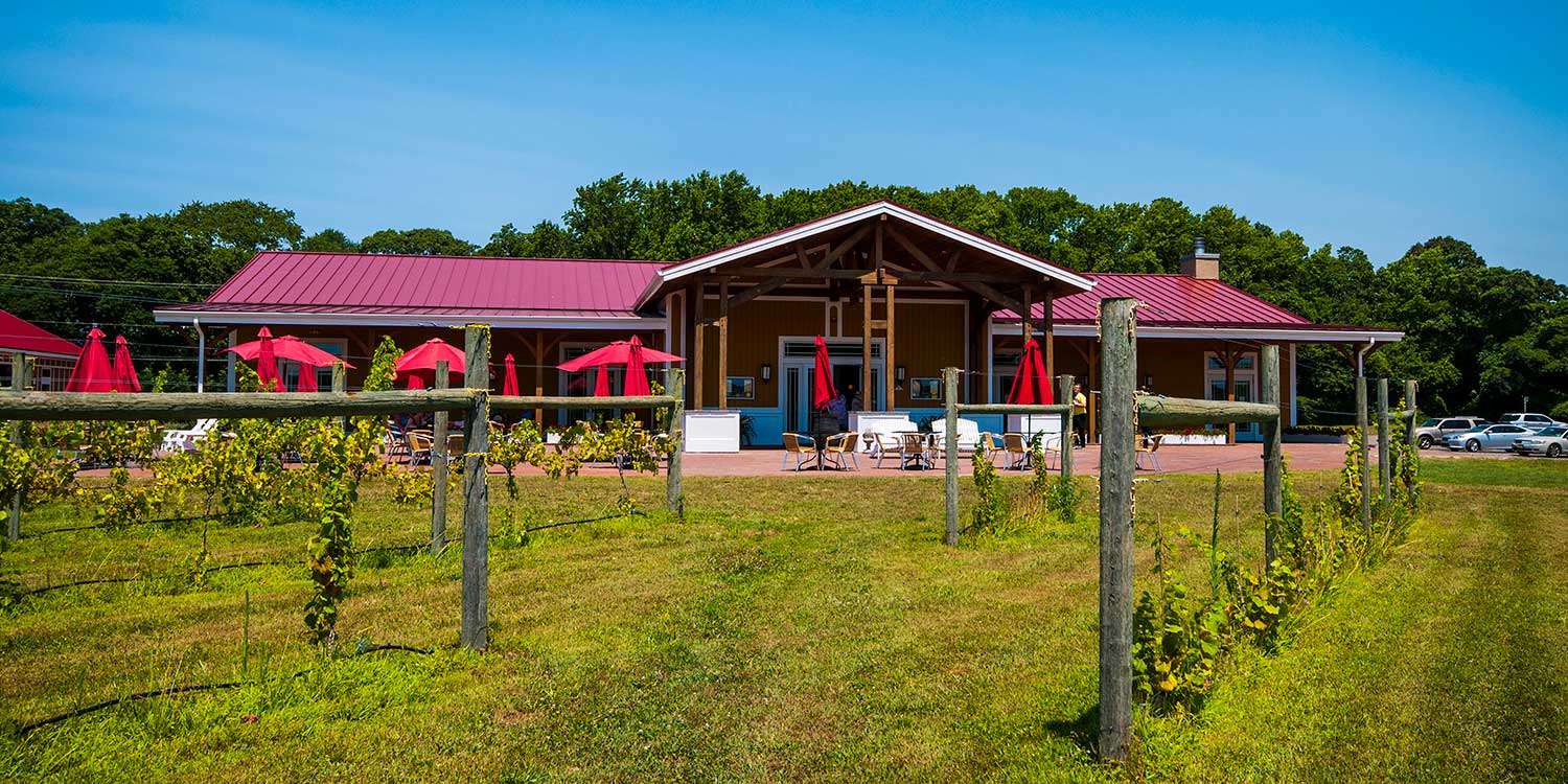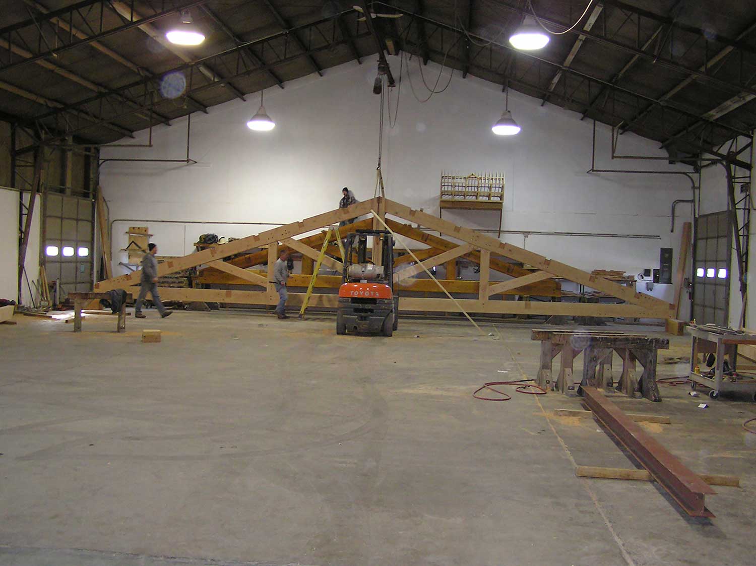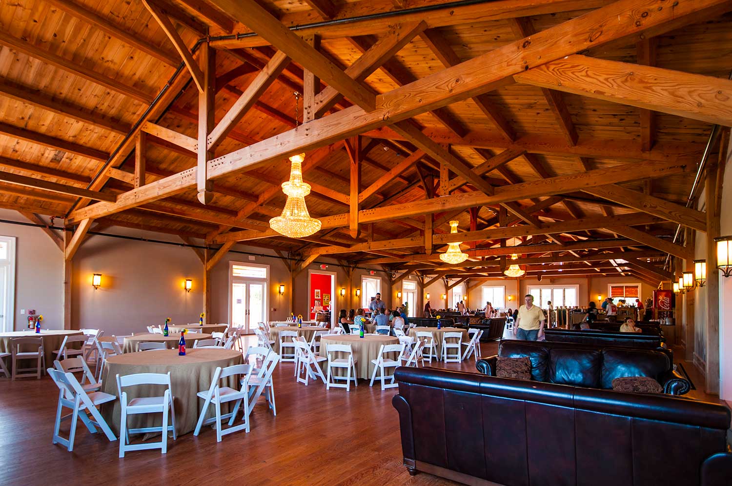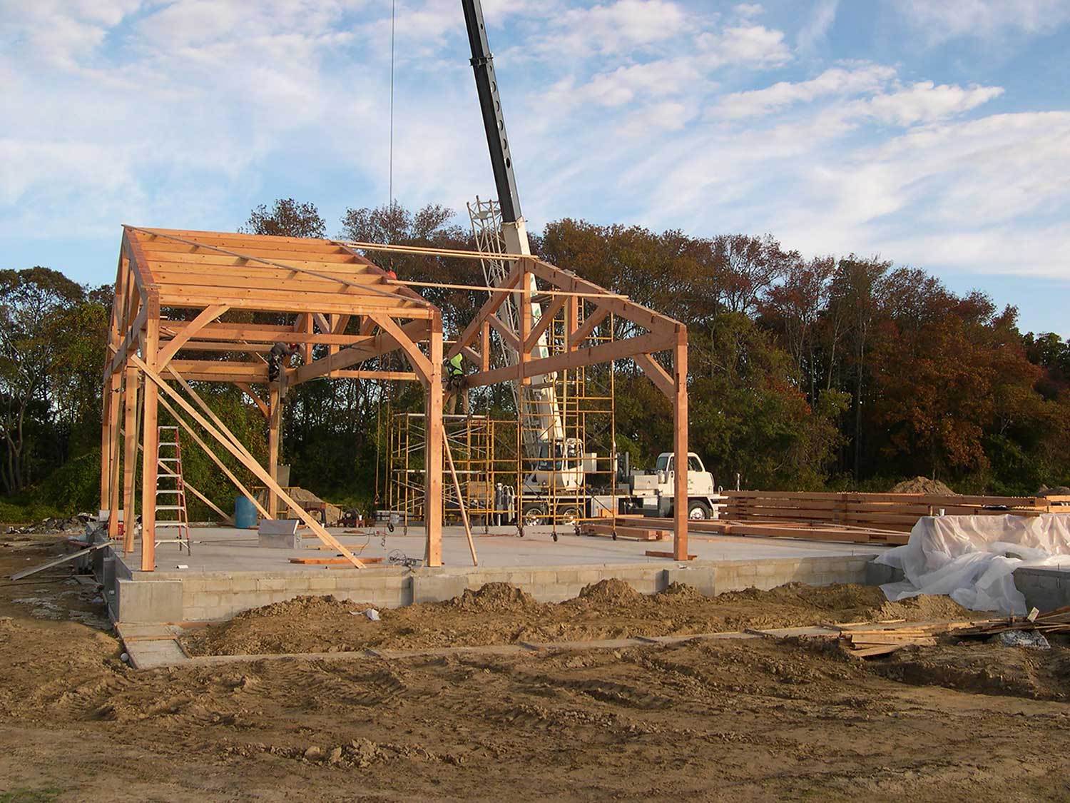 This hand-carved post-and-beam winery building sits on a 50-acre vineyard on New Jersey’s Outer Coastal Plain. The main section of the timber frame consists of nine bents, with trusses spanning 50 feet. The frame and building were designed to withstand coastal wind speeds of up to 120 mph. The lower chord is segmented and connected at the king post by an embedded and concealed steel plate spline with hardened steel pins. Steel spline plates and other connectors are used throughout, all concealed inside the timber members. The timbers are Douglas fir, select structural, and free of heart center.